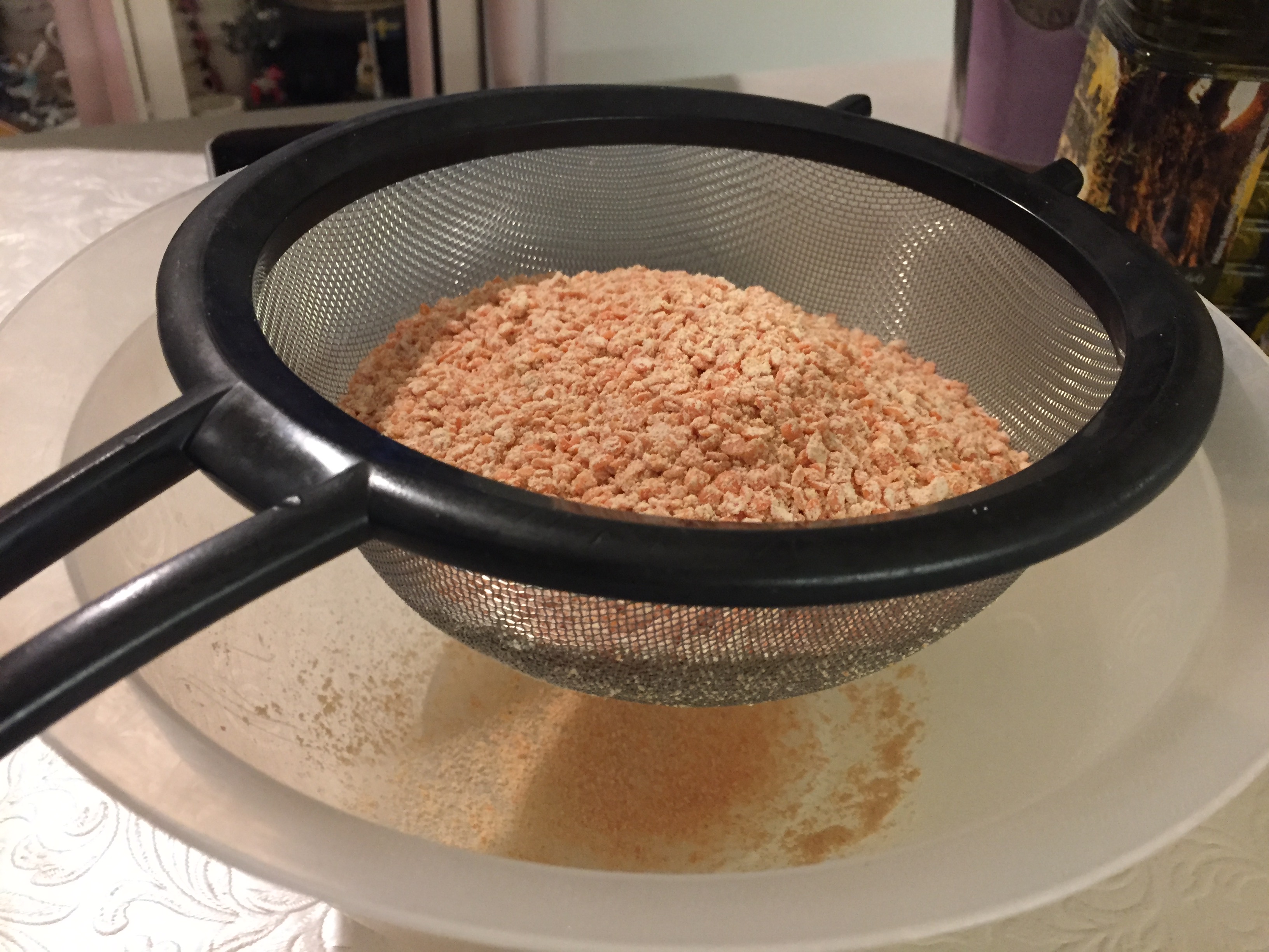 Transfer the lentils to a food processor. Working in batches, process until the lentils resemble a fine powder. There will be some bigger chunks left behind, so make sure to sift through a sieve.