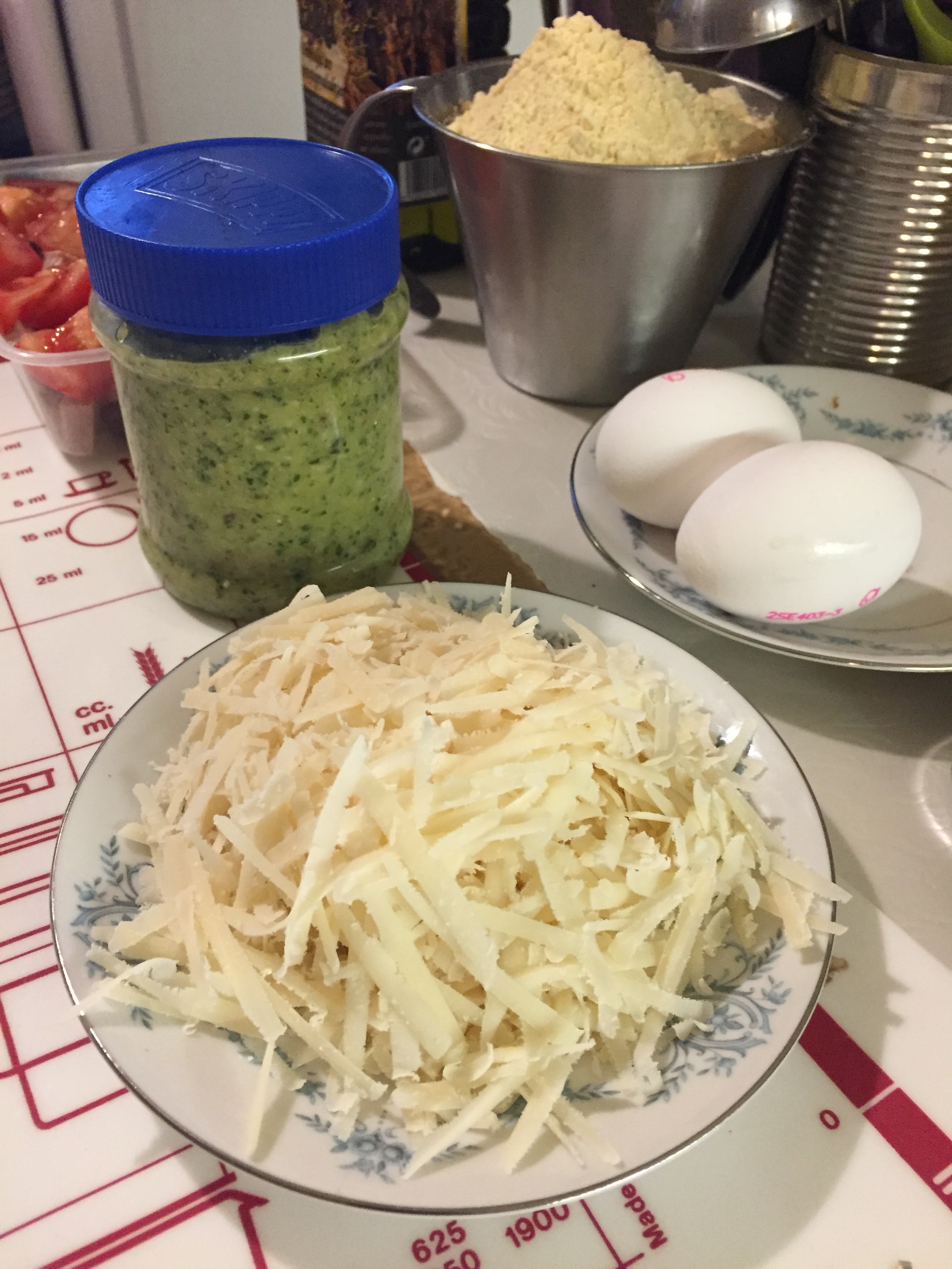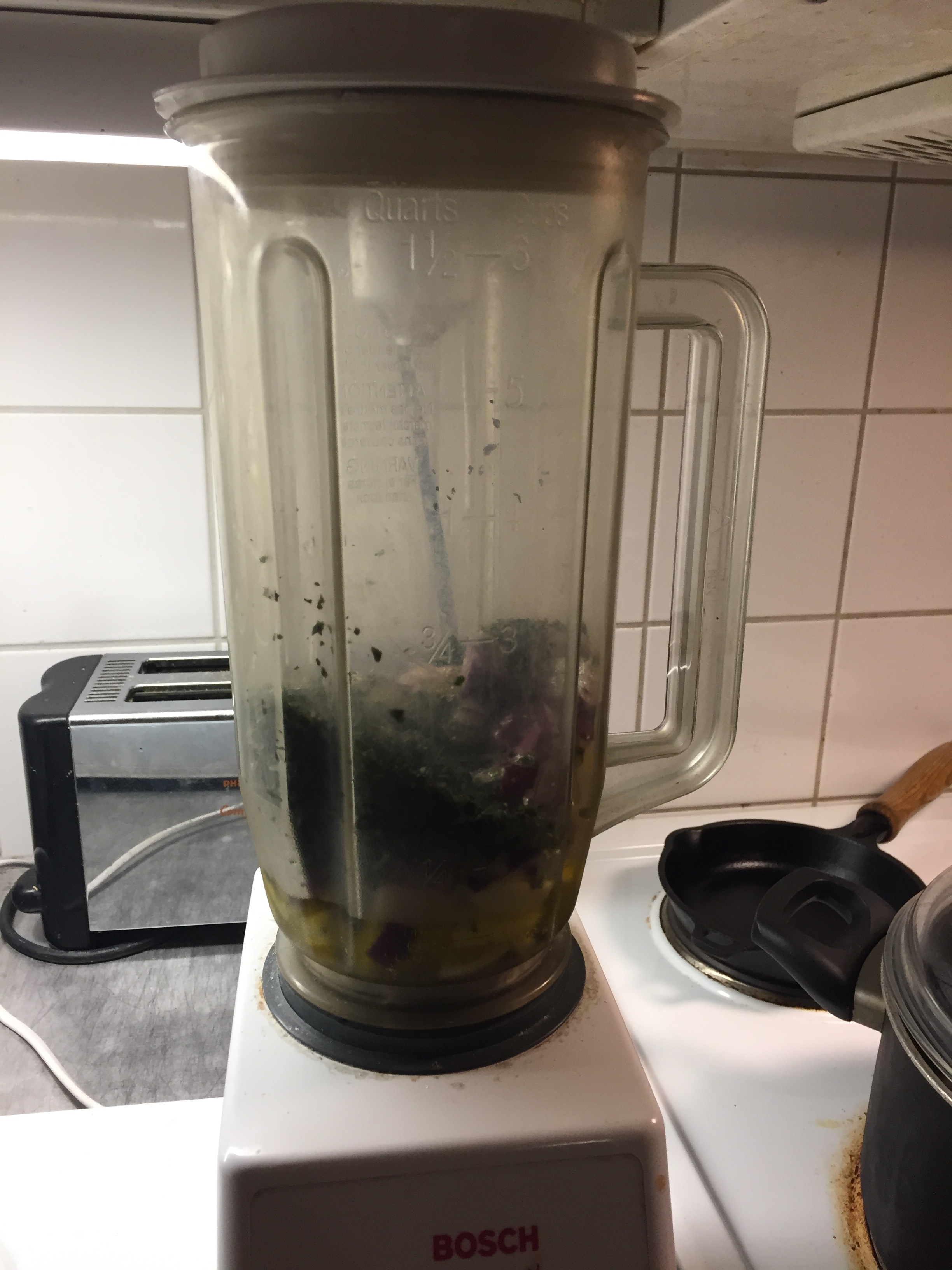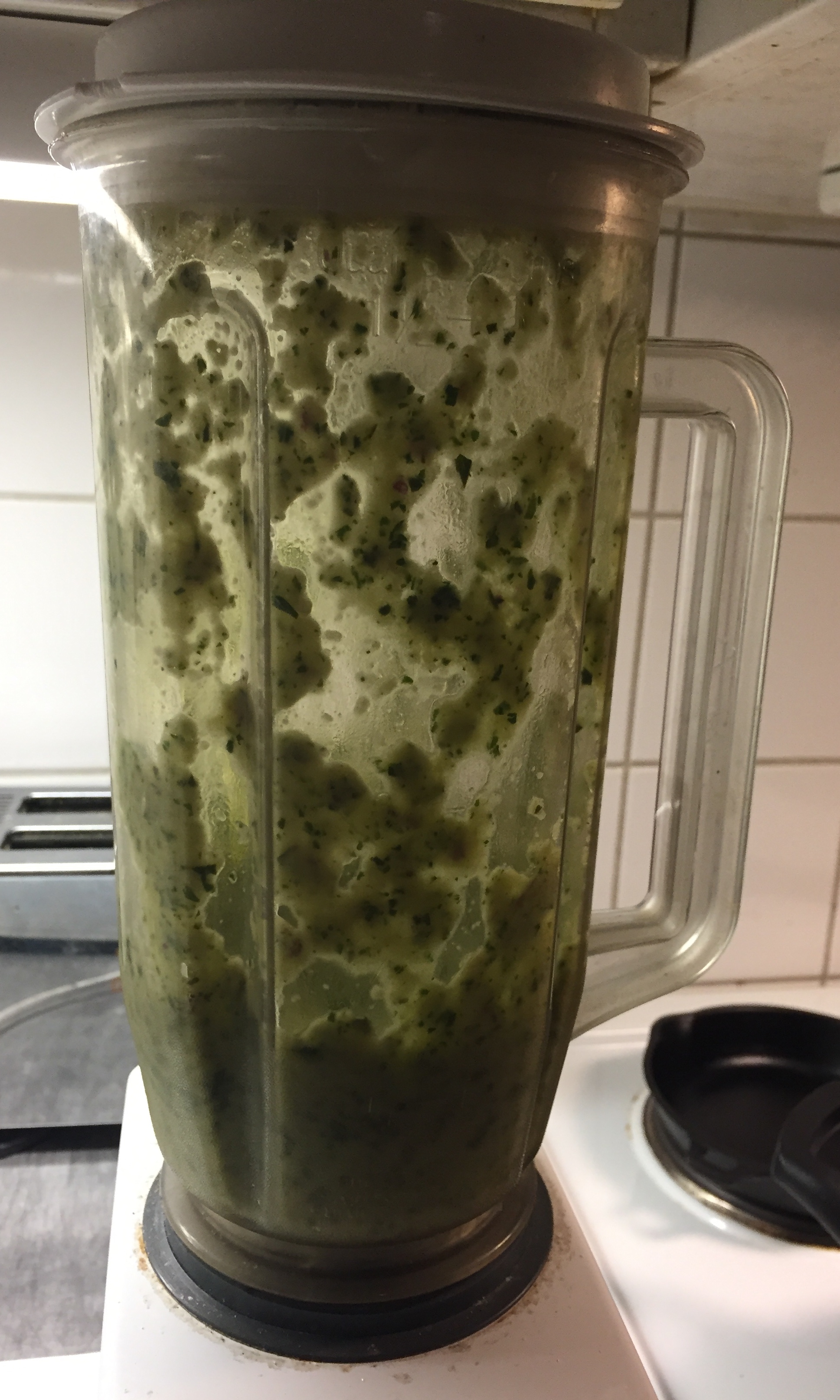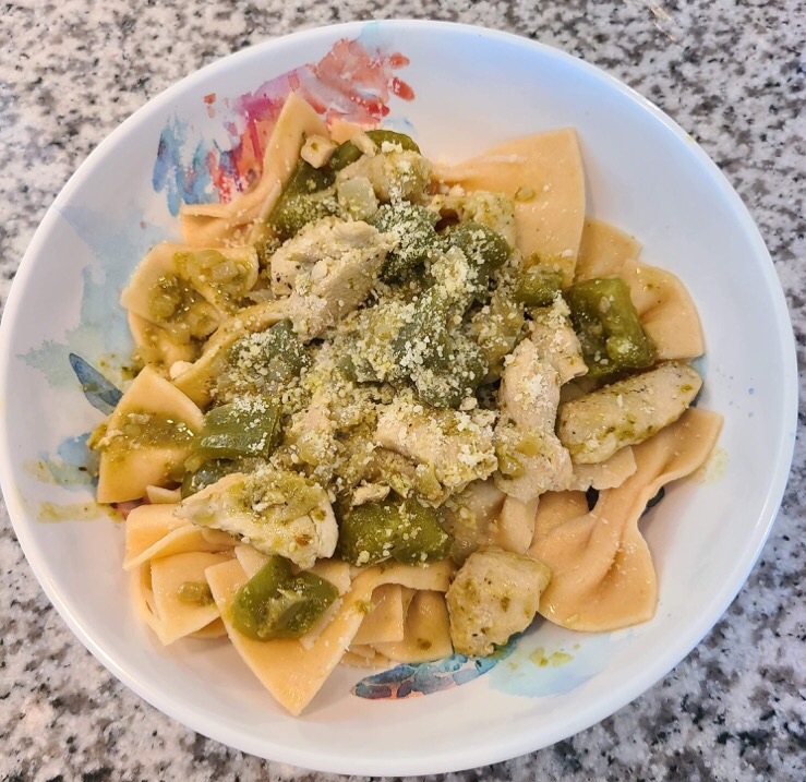 Add the pesto sauce to the chicken and garlic in the frying pan and let it simmer on low heat while you cook the pasta. Add some of the pasta water or add cream or almond milk to the sauce to make it the thickness you want.