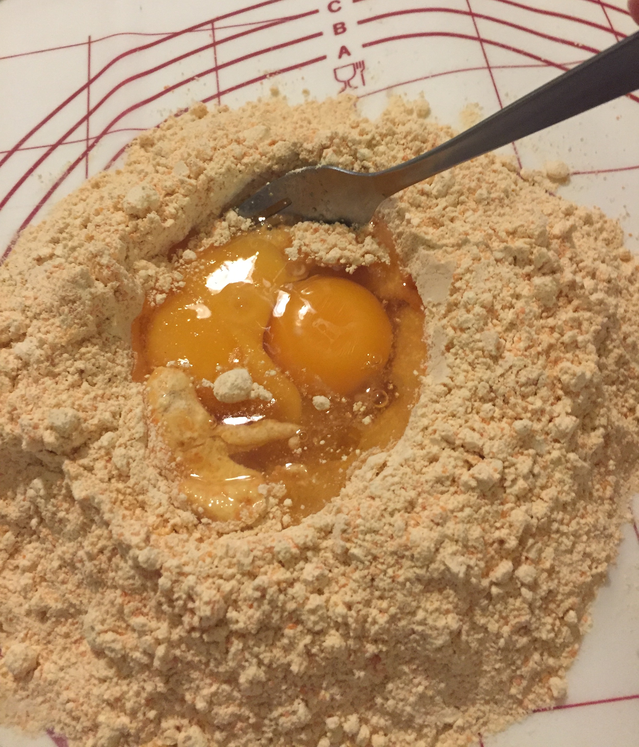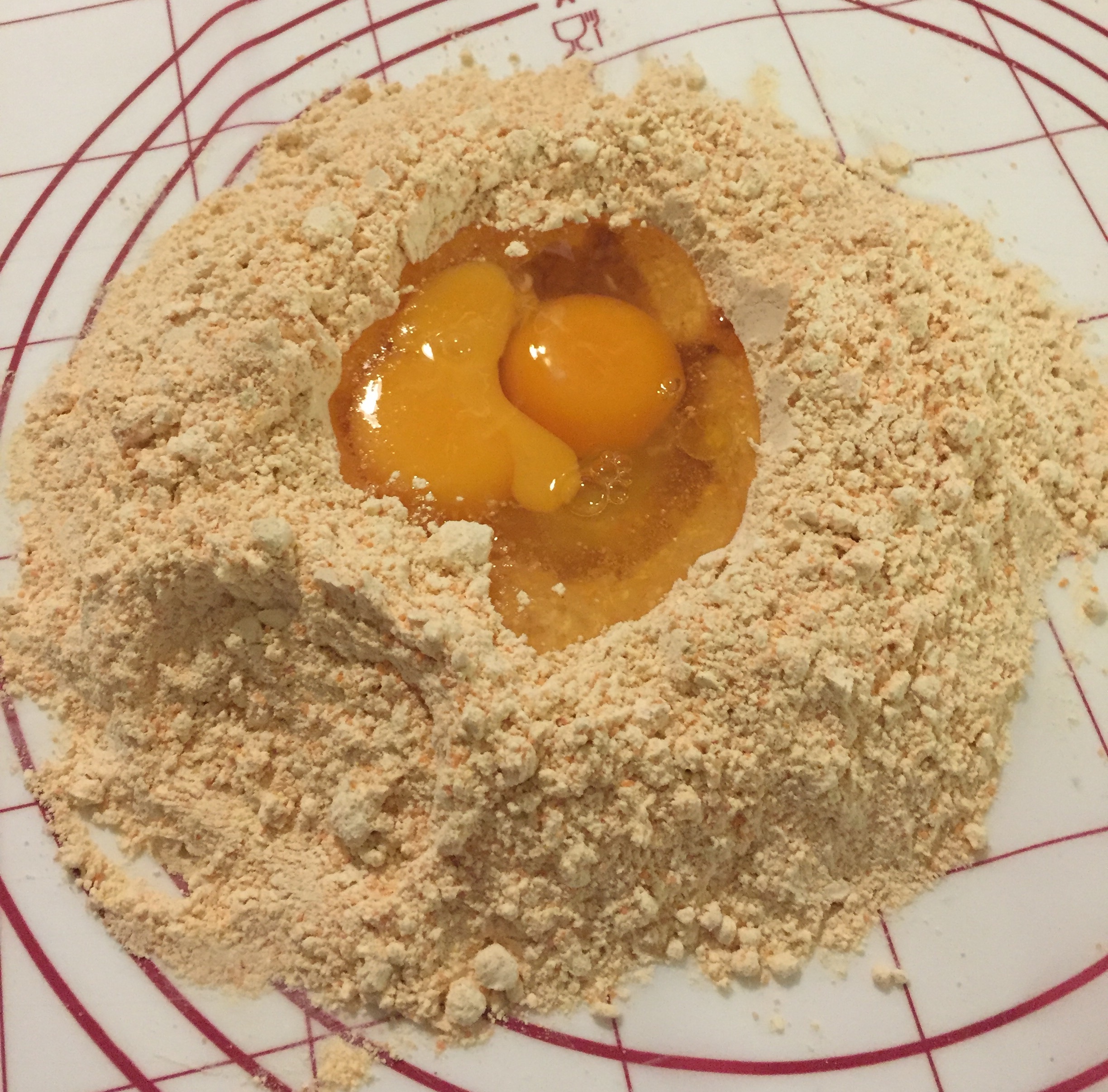 Place the flour on a board or in a bowl. Make a well in the centre and add salt, oil and the egg into it. Mix the egg with a fork and start to slowly mix in the flour. When most of the egg is absorbed use the tips of your fingers, mix the eggs with the flour, incorporating a little at a time, until everything is combined. Knead the dough together with the palm of your hand. Press and fold, press and fold. Work it until the dough is binding together to give you one big, smooth lump of dough with some stretch in it! If you feel it is too hard and dry while you kneed you add a spoon of water at a time.