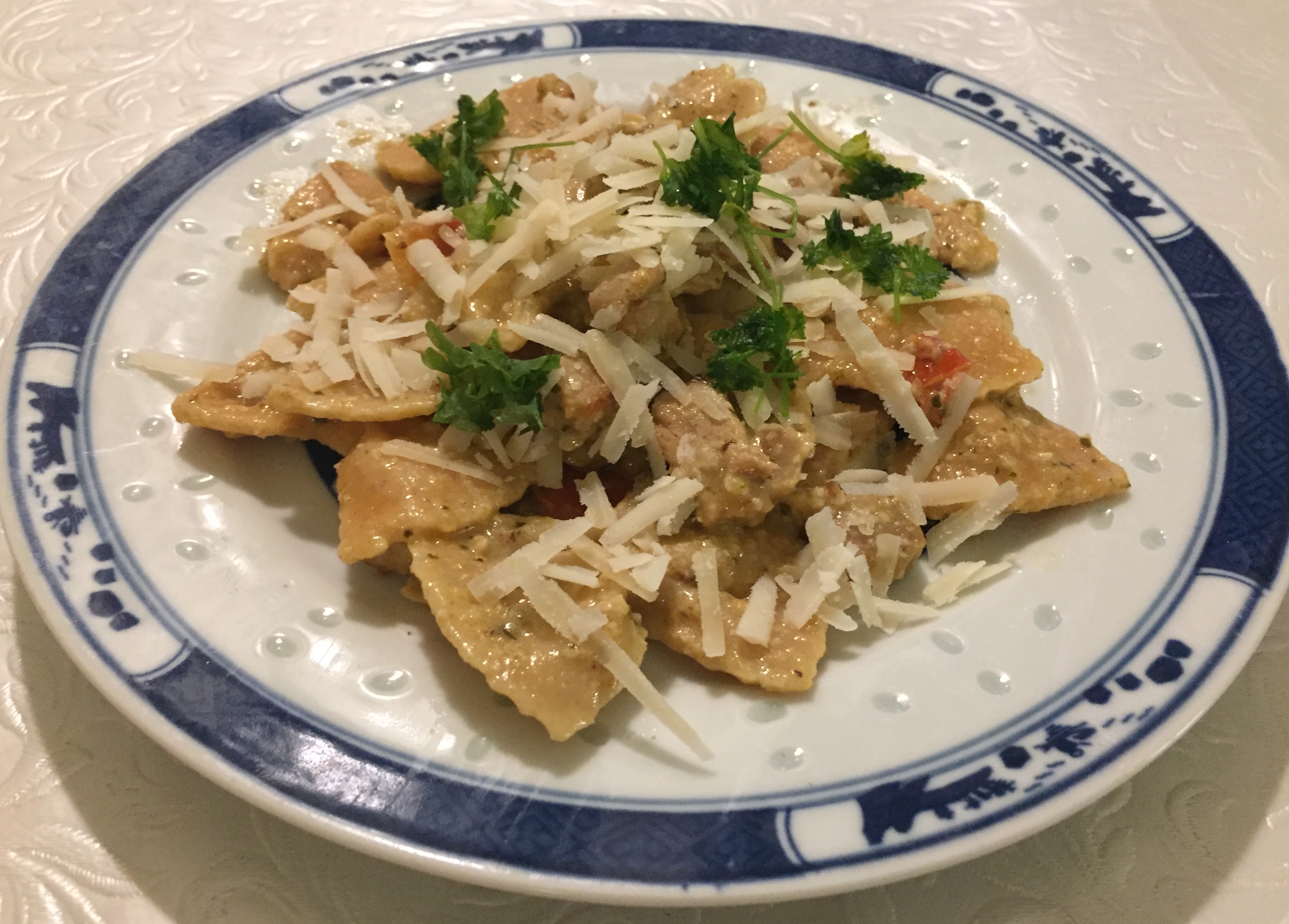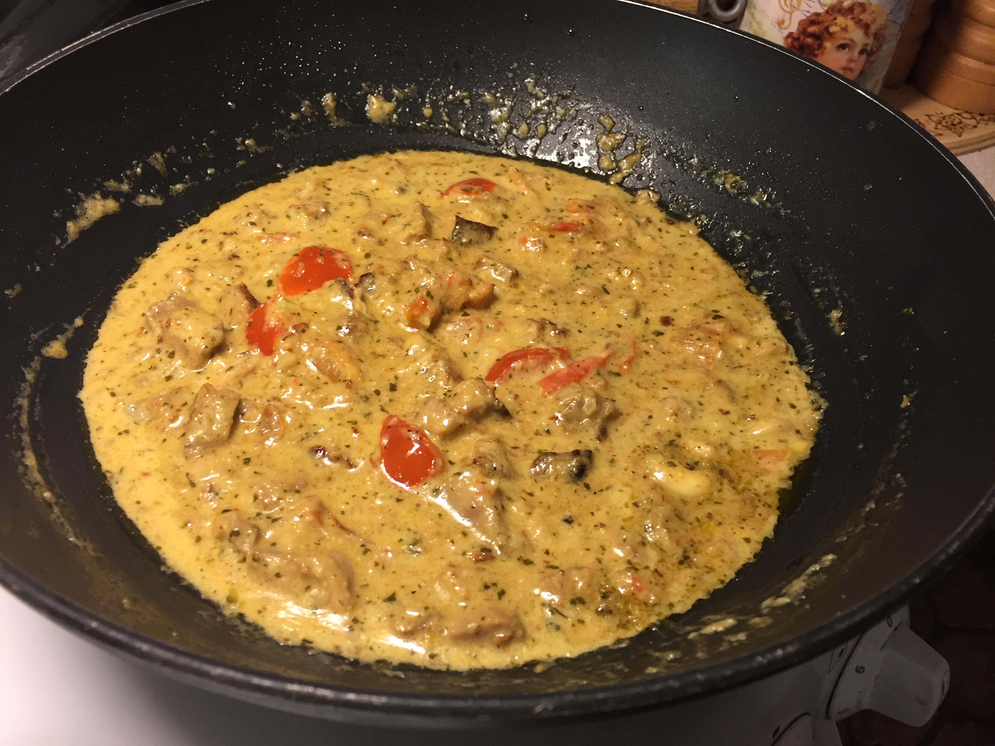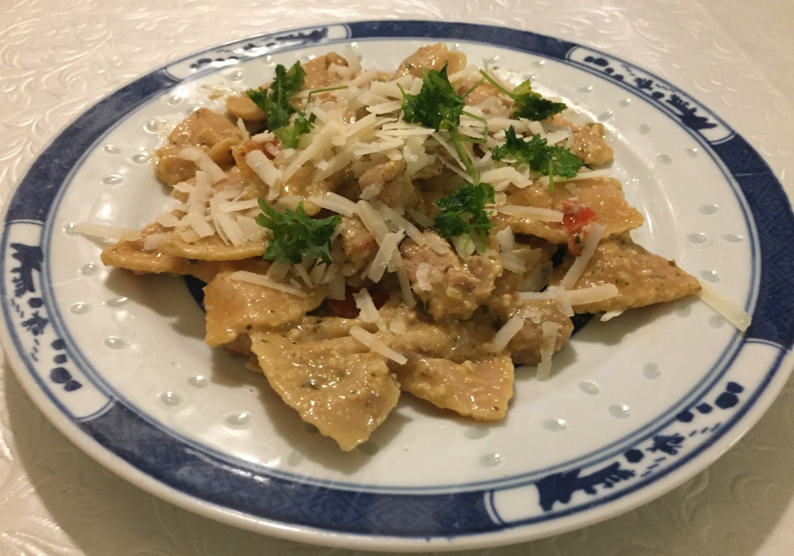 This is a pasta high in protein and low in calories. It is also glutenfree if you don´t use the wheatflour to mix in. You could make it vegetarian or even vegan by omitting the chicken in the sauce and the cream and just use vegetables and almond milk.