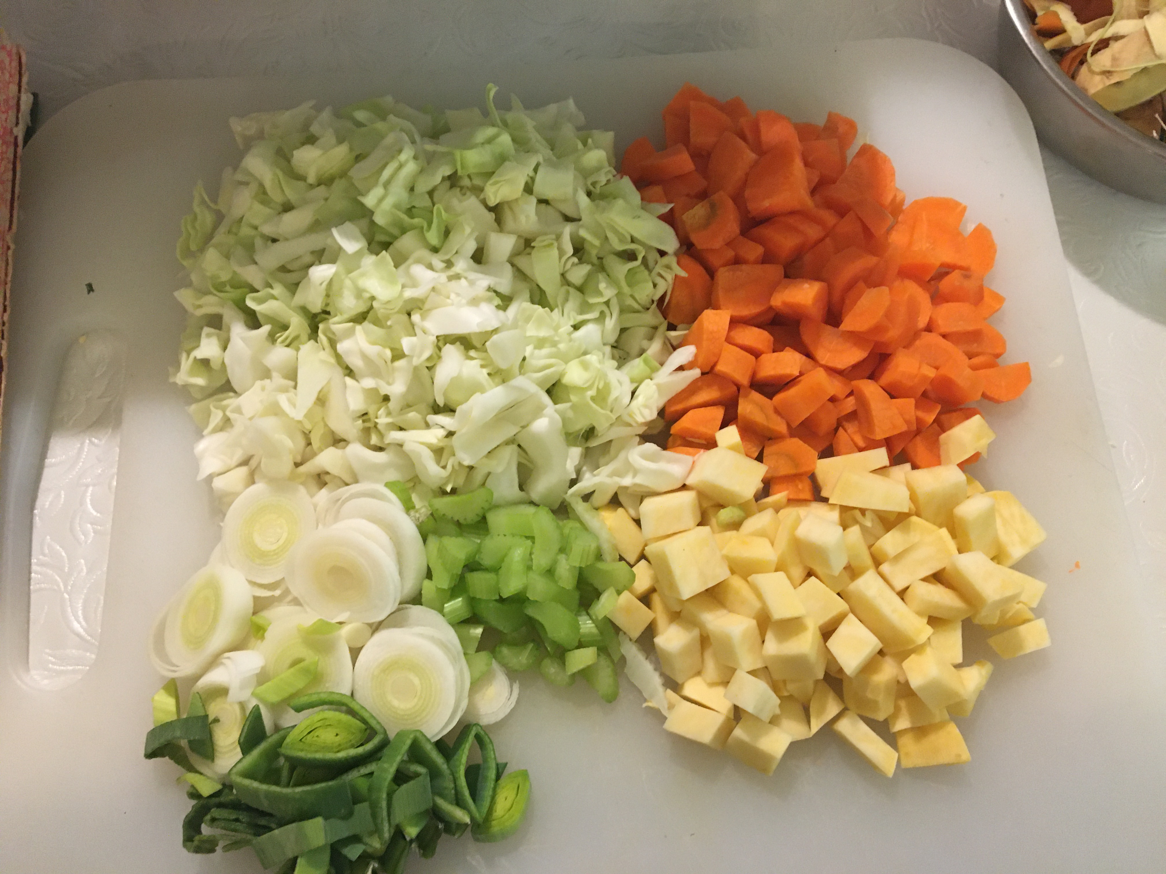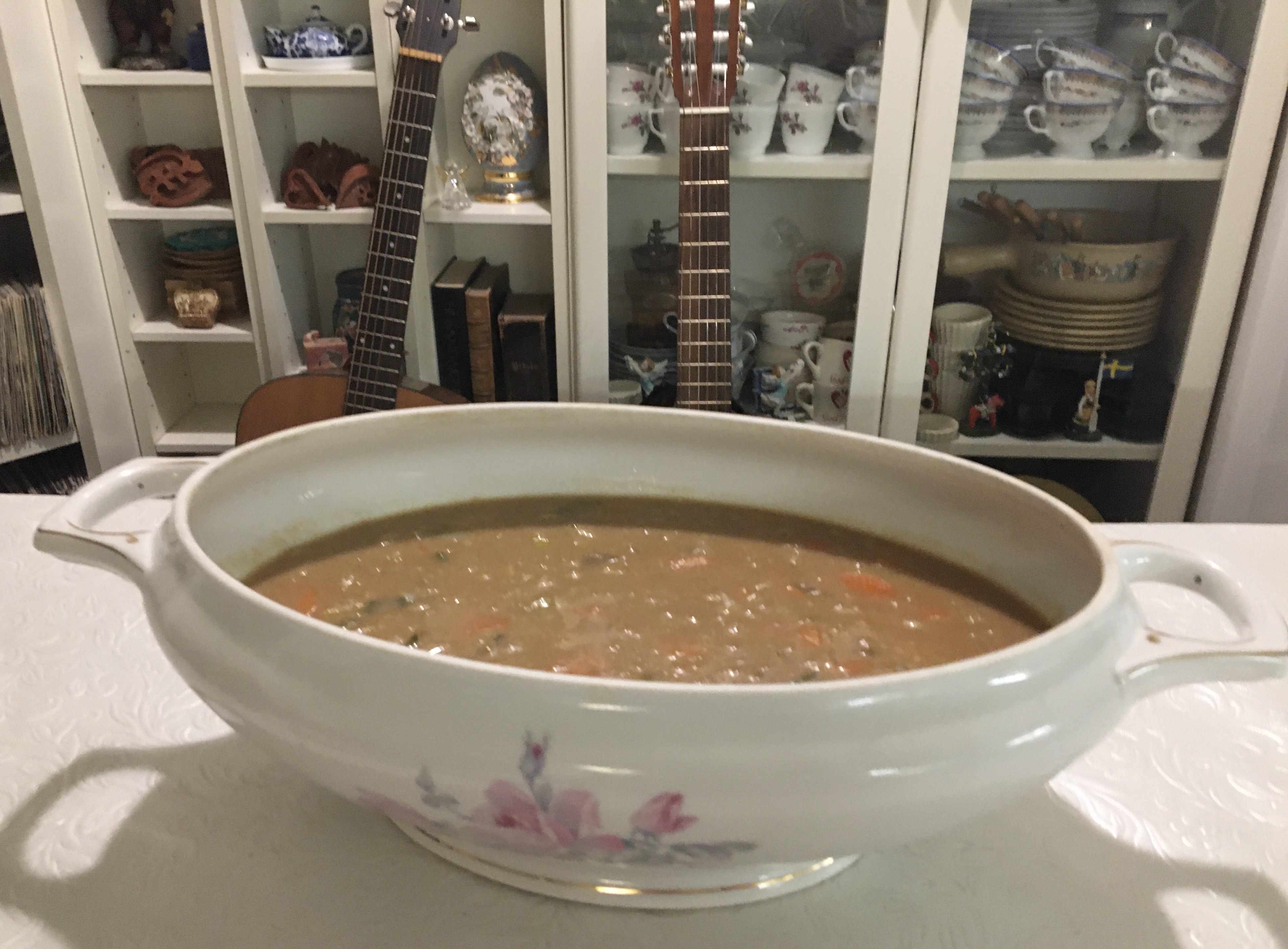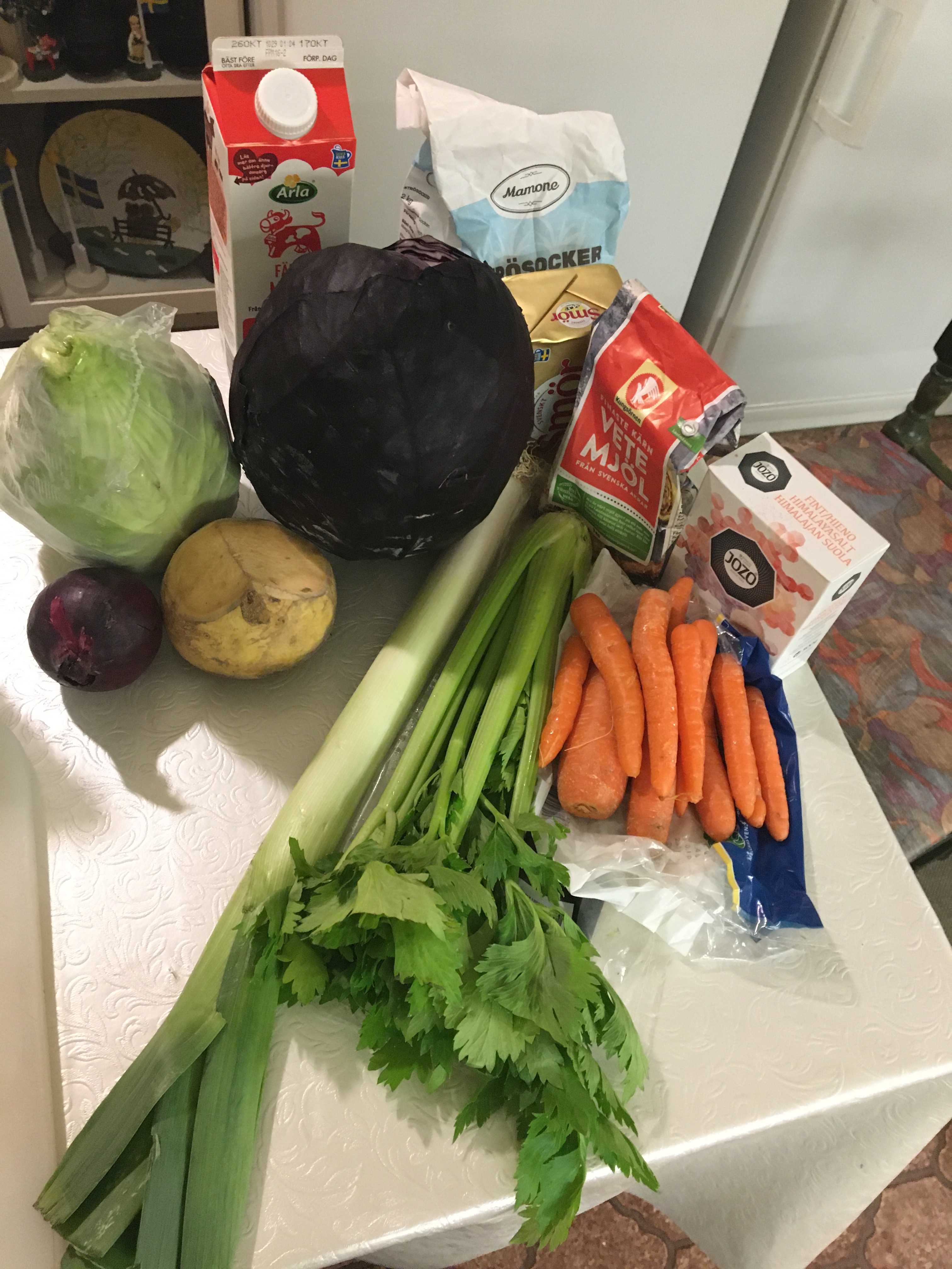 I tried to find out what Brown Soup was and if it is still being made. I have not been able to find it nowadays. However in historical recipes I find it both in Norwegian recipes and English. It is a Brown meat and vegetable Soup. This day on my mothers menu it is a vegetable soup. The broth is from Cooking meat and ham, however the meat is then used for the Casserole. In old recipes when the Soup is the Main dish the meat is in the Soup. I could find the Brown Soup as far back as 1814 in one historic recipe from Norway. There the meat is being used in the soup. I believe in Norway during the older times one would cook meat and even bones and then remove them and save the broth to make soups. This way you would get a delicious soup however cheaper with just the vegetables. And the meat would be used for more special occations or additional dishes. Like here the two dishes could be made from the meat and the broth. So it is a very economical way to feed a crowd both nutritional food and also for less money. However as a main dish the meat would be chopped after cooking and added back in the soup to make it a meat and vegetable soup. I have recreated the menu, however made it for a few persons.