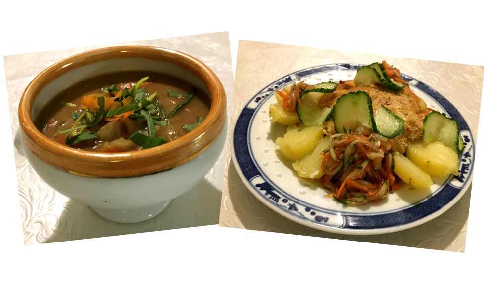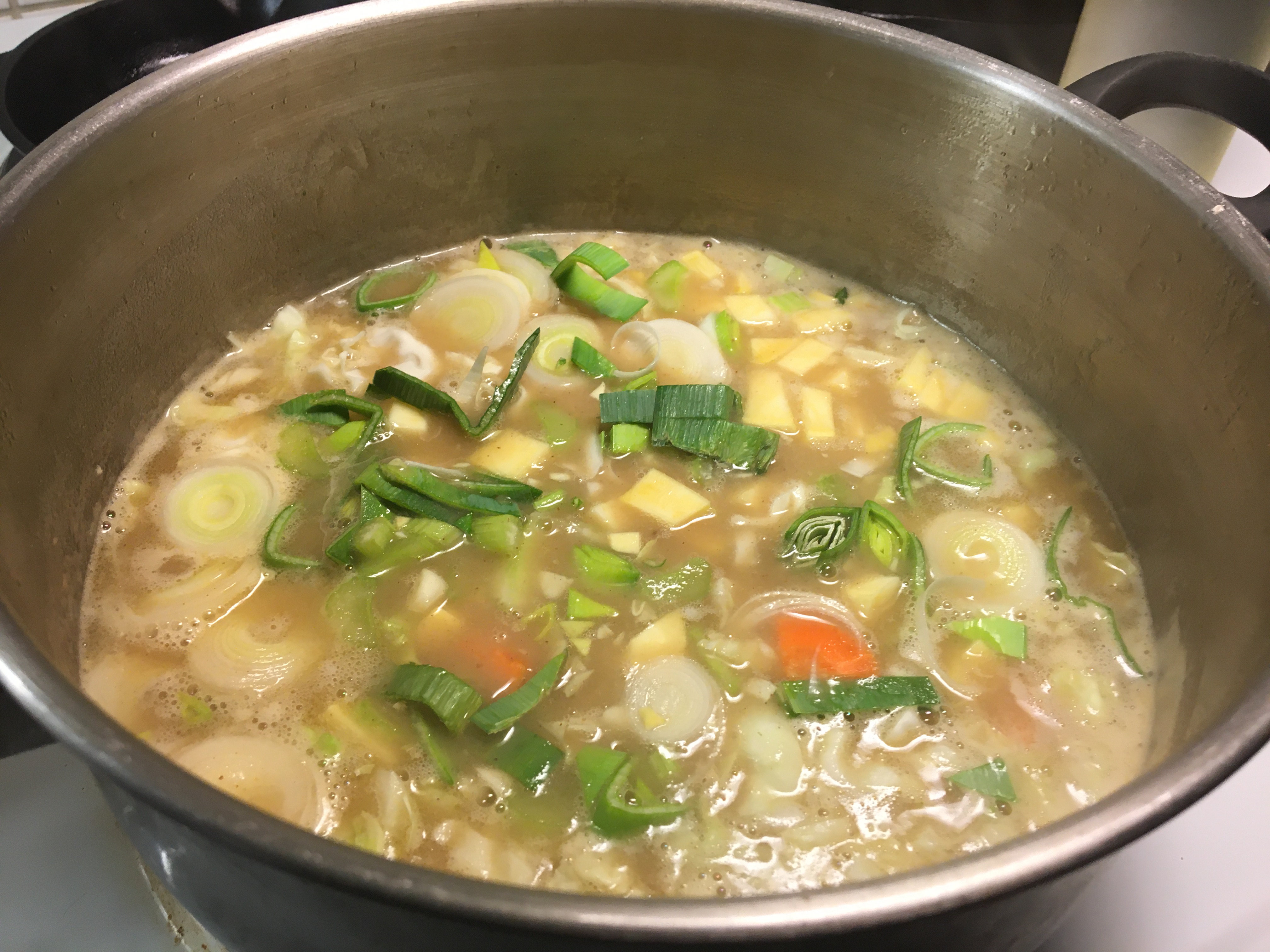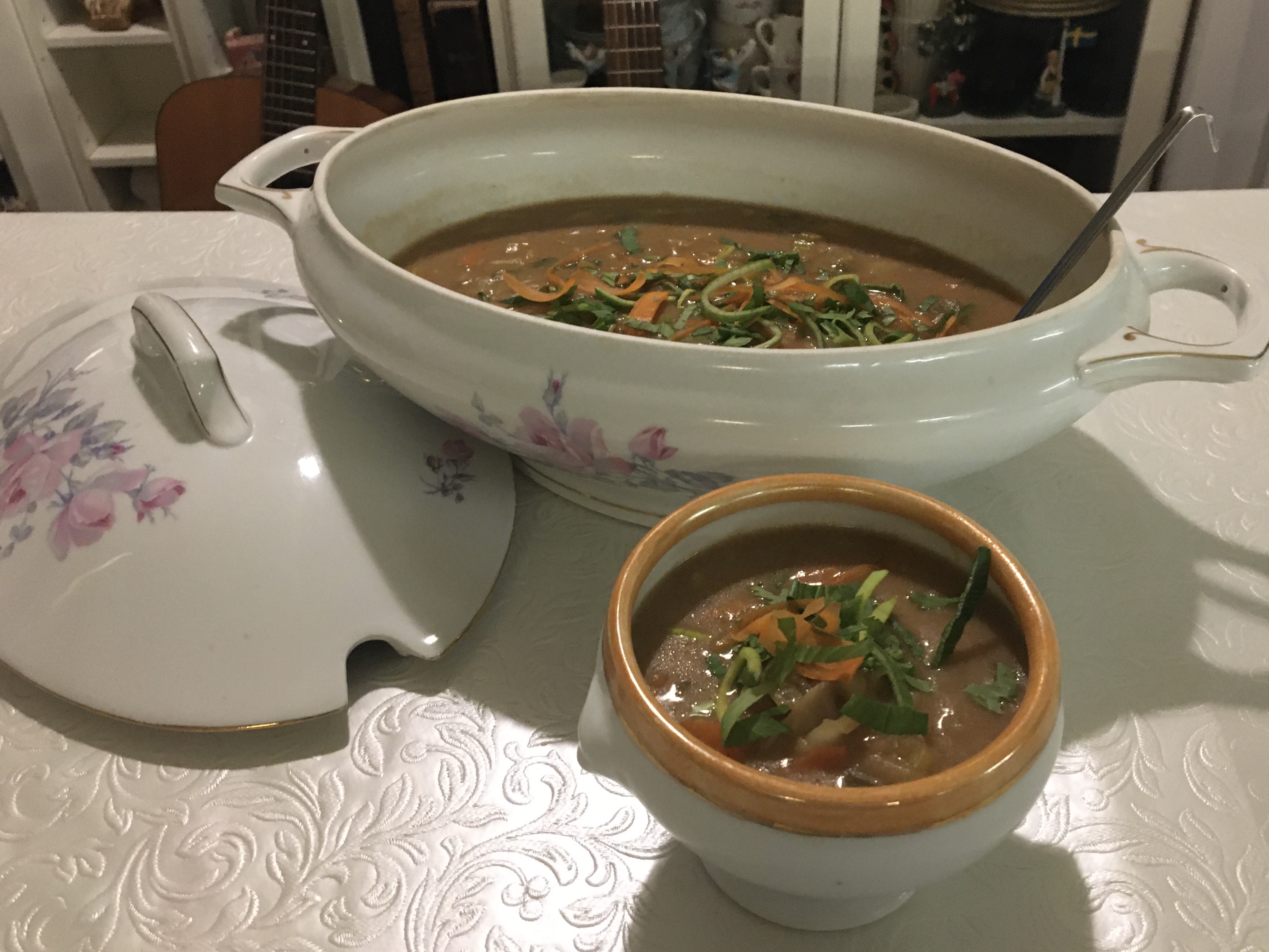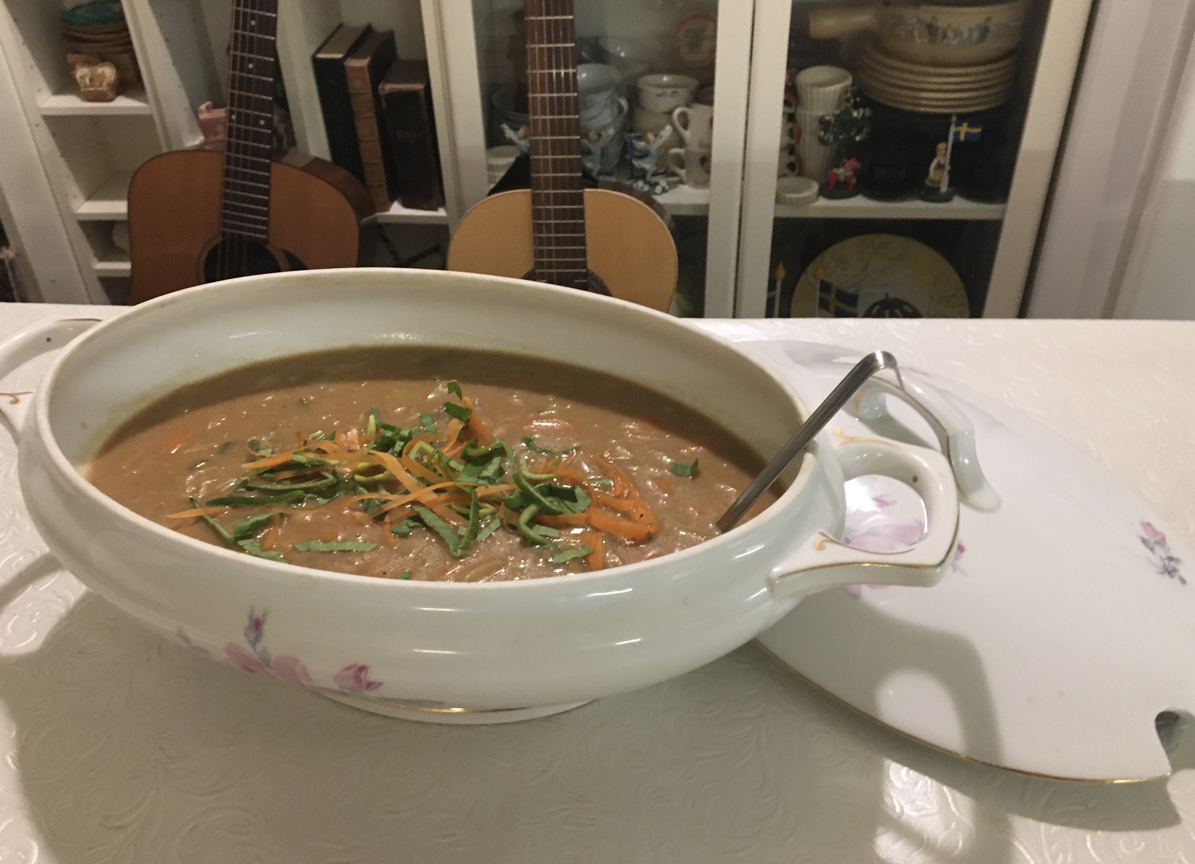 I tried to find out what Brown Soup was and if it is still being made. I have not been able to find it nowadays. However in historical recipes I find it both in Norwegian recipes and English. It is a Brown meat and vegetable Soup. This day on my mothers menu it is a vegetable soup. The broth is from Cooking meat and ham, however the meat is then used for the Casserole. In old recipes when the Soup is the Main dish the meat is in the Soup. I could find the Brown Soup as far back as 1814 in one historic recipe from Norway. There the meat is being used in the soup. I believe in Norway during the older times one would cook meat and even bones and then remove them and save the broth to make soups. This way you would get a delicious soup however cheaper with just the vegetables. And the meat would be used for more special occations or additional dishes. Like here the two dishes could be made from the meat and the broth. So it is a very economical way to feed a crowd both nutritional food and also for less money. However as a main dish the meat would be chopped after cooking and added back in the soup to make it a meat and vegetable soup. I have recreated the menu, however made it for a few persons.