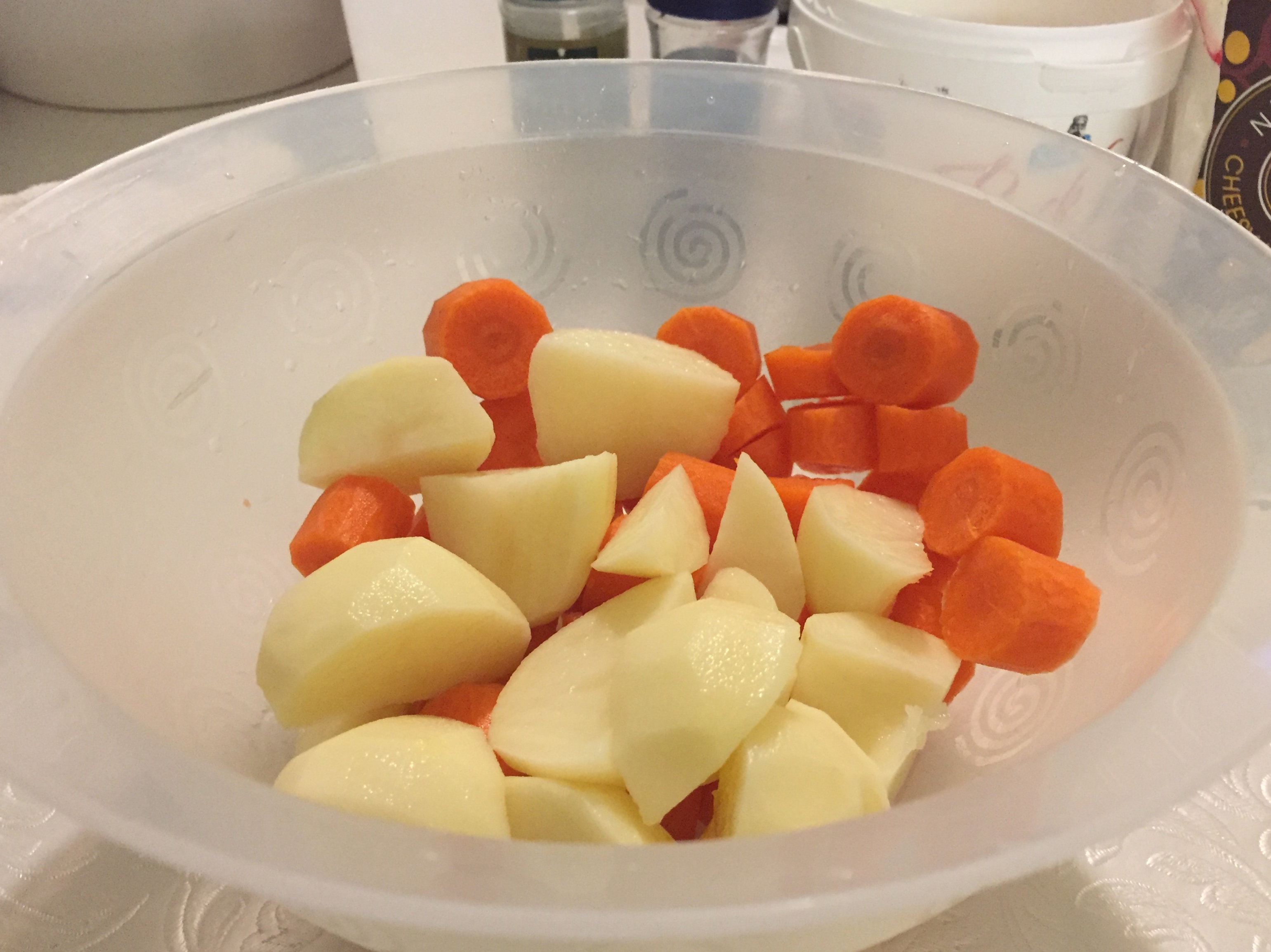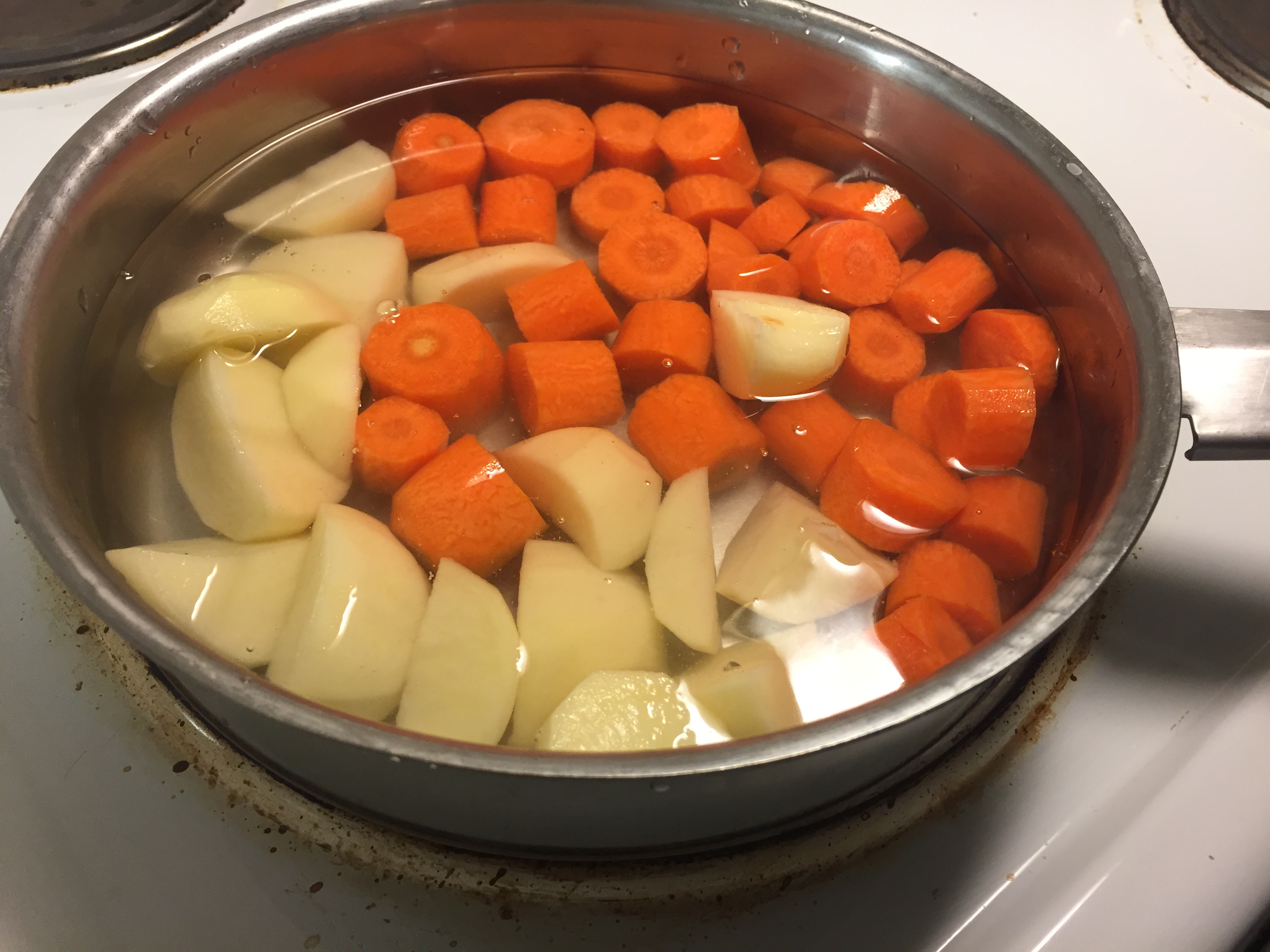 Chop the peeled and washed carrots and potatoes to the same size and add to a saucepan over high heat. Cover with water and bring to a boil. Cook until soft.