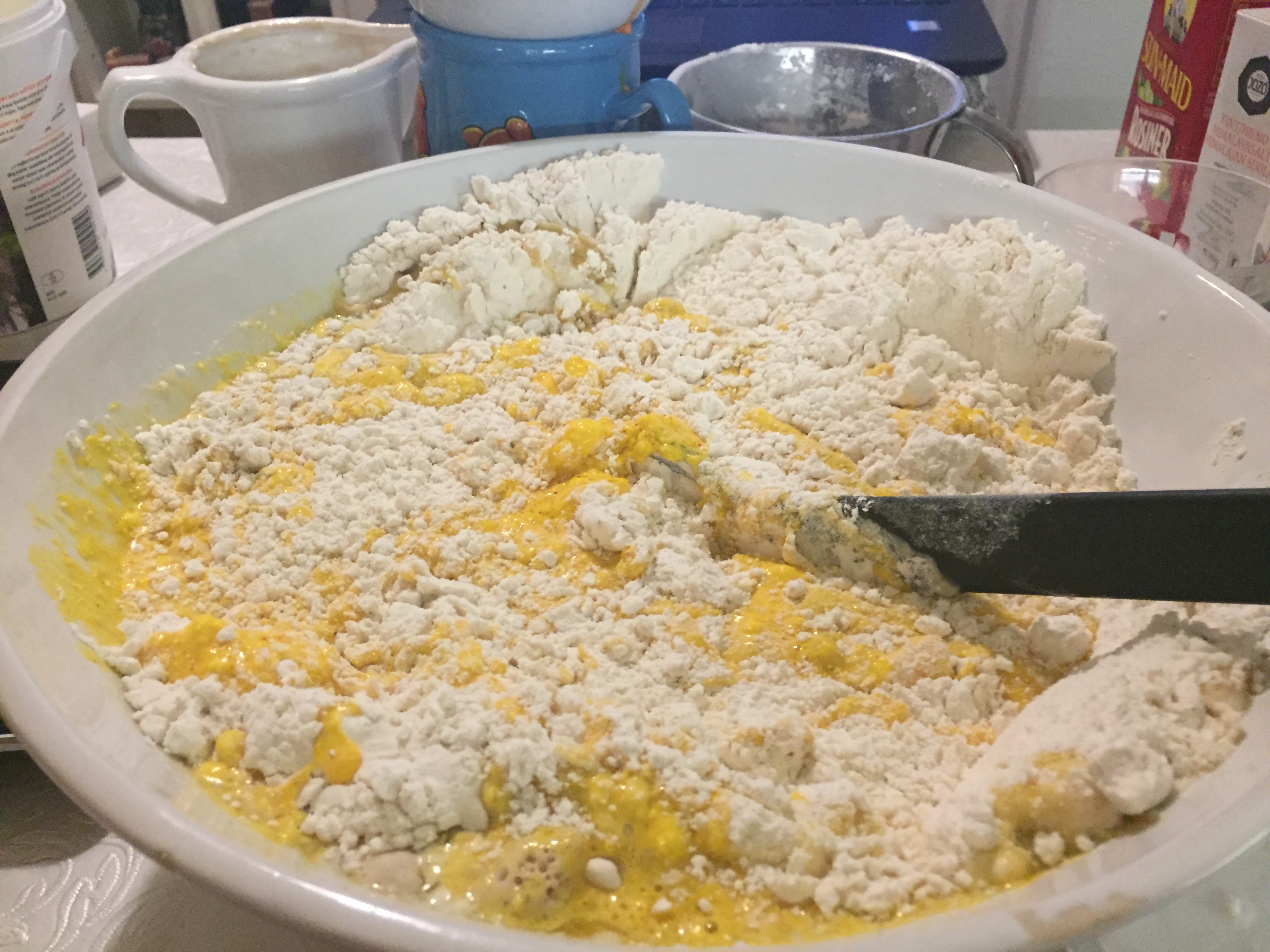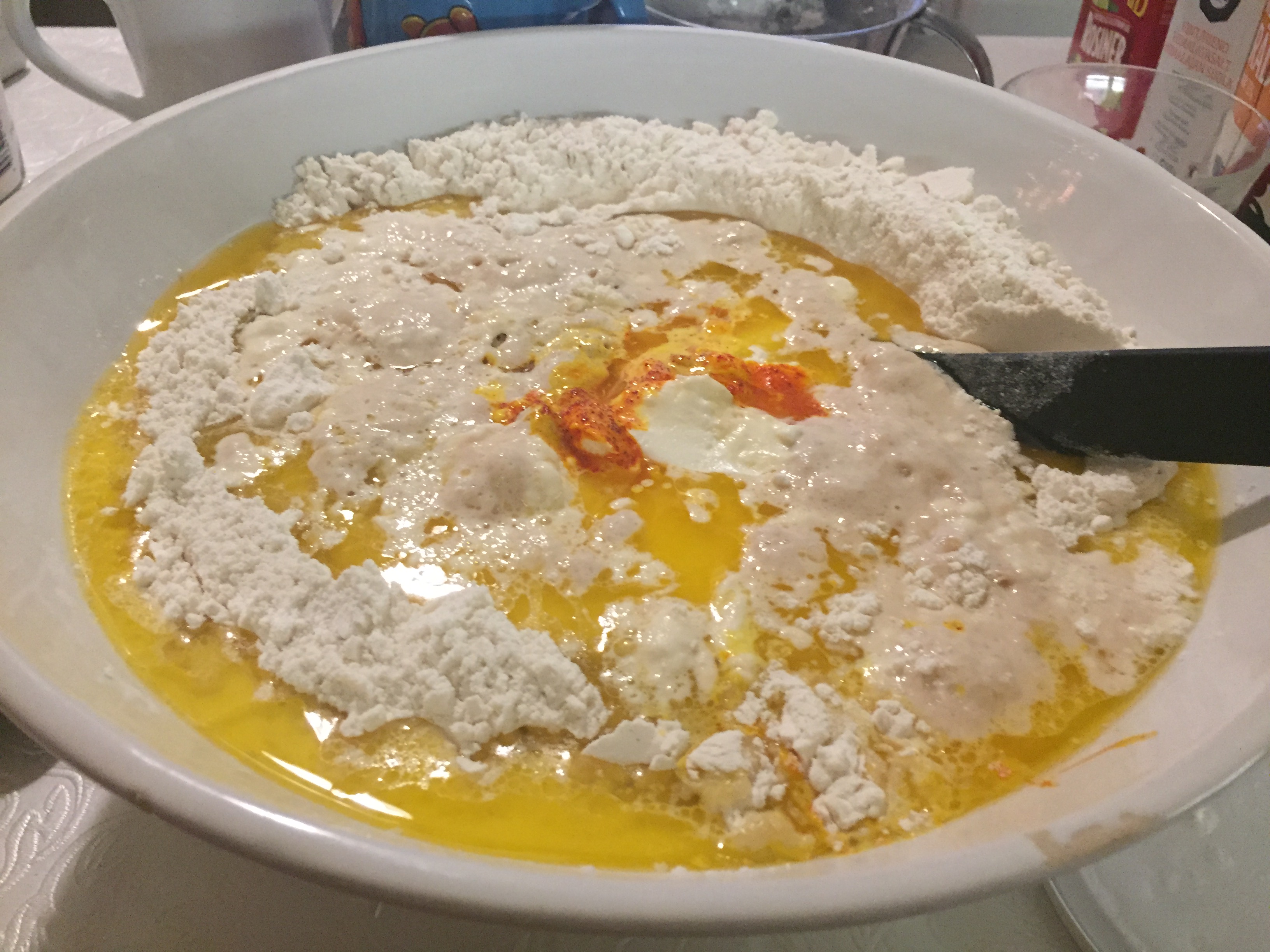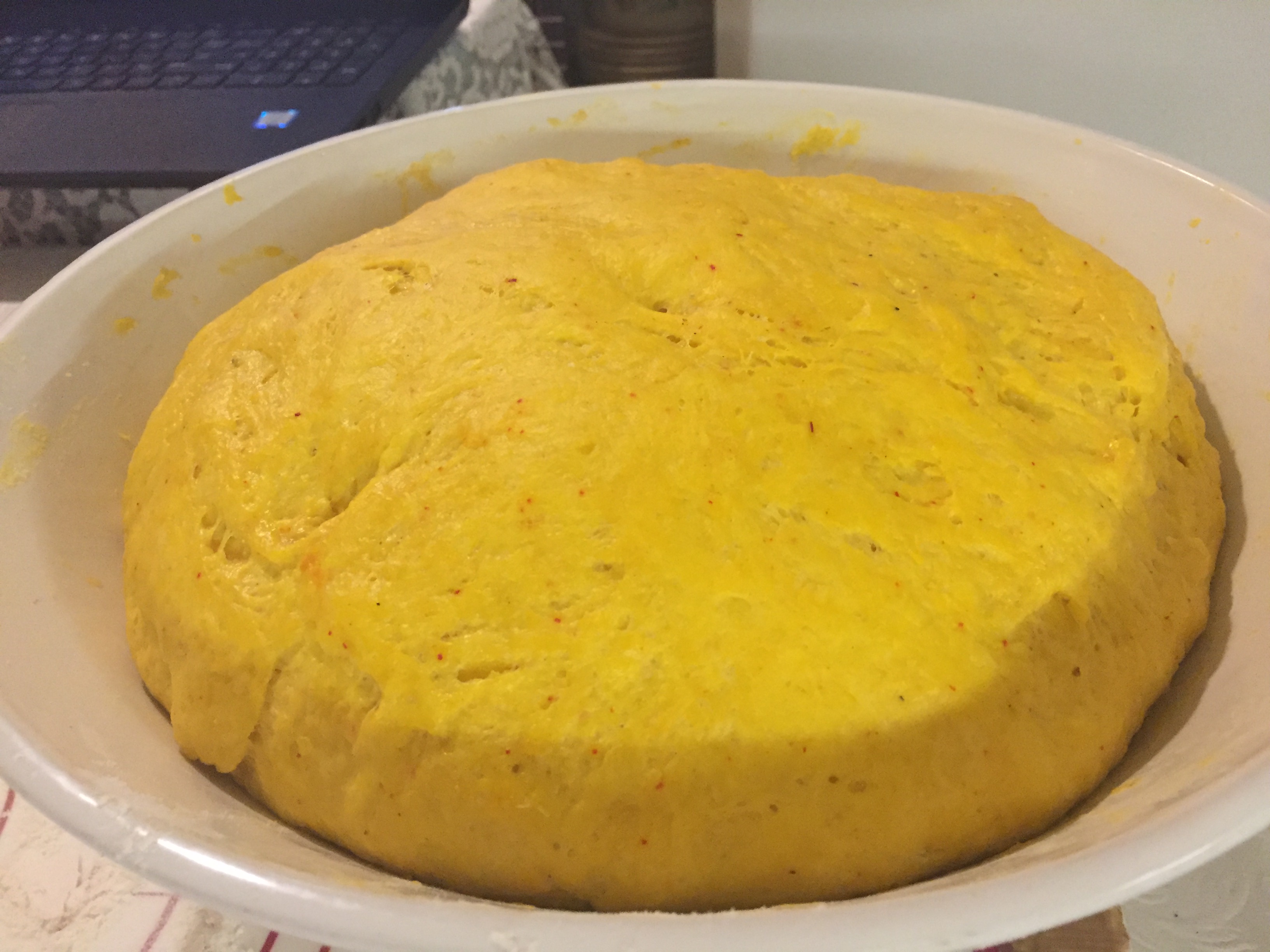 2. In a large bowl, whisk together 4 cups of the flour, the remaining sugar, the cardamom, and salt. Make a well in the center and pour in the yeast mixture, the dissolved saffron, and the remaining milk, kesella and melted butter. Stir with a wooden spoon, gradually adding more flour as necessary, until a soft dough forms.