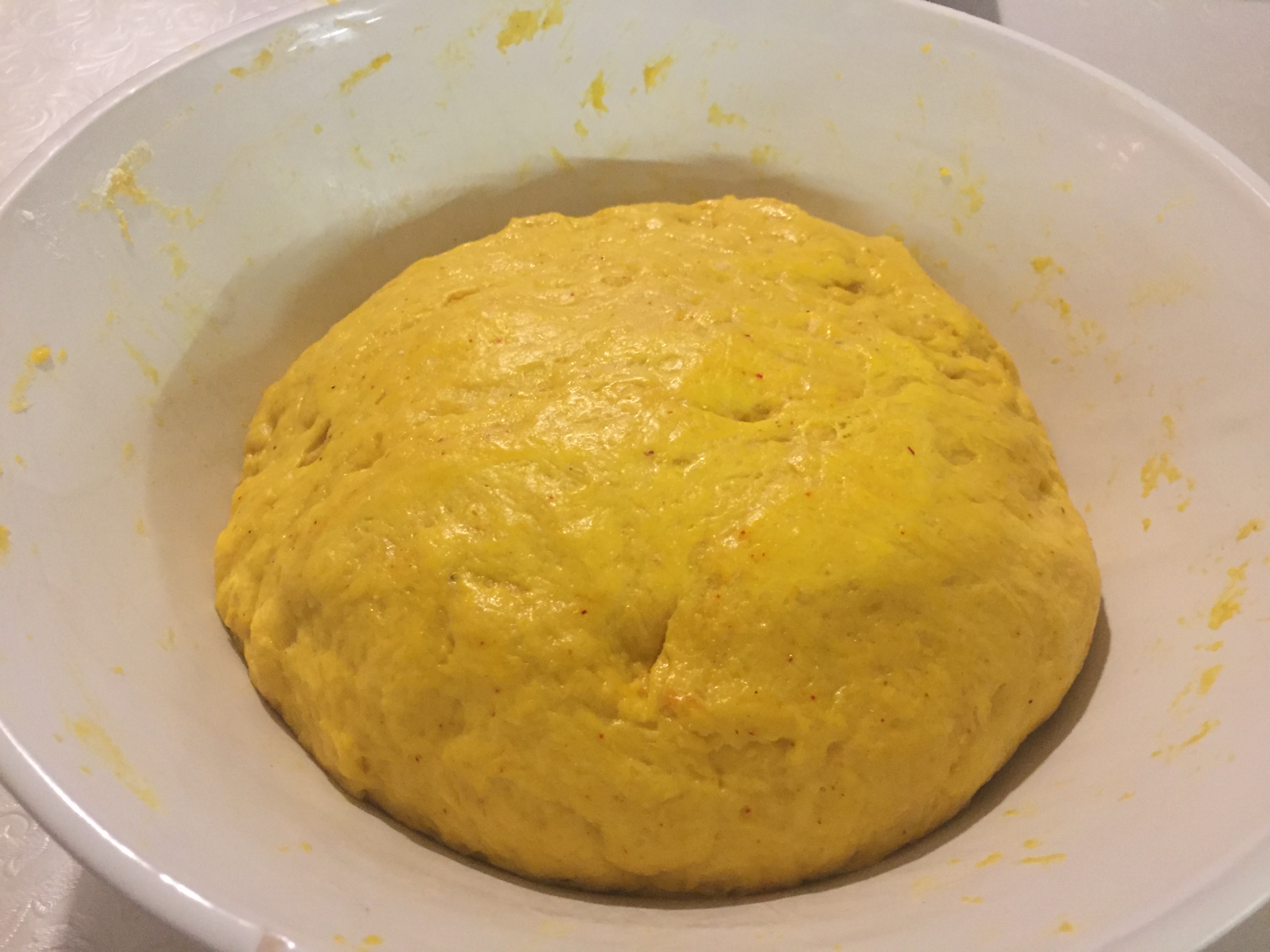 1. Heat the milk in a small saucepan just until warm. Remove from the heat. Combine 1 dl of the milk, the yeast, and a pinch of the sugar in a small bowl and let sit for 10 minutes, or until bubbly. Combine another 2 tablespoons of the milk, 1 teaspoon of the sugar, and the saffron in a small bowl, stirring to dissolve the sugar. Set the remaining milk aside. Melt the butter and cool down.