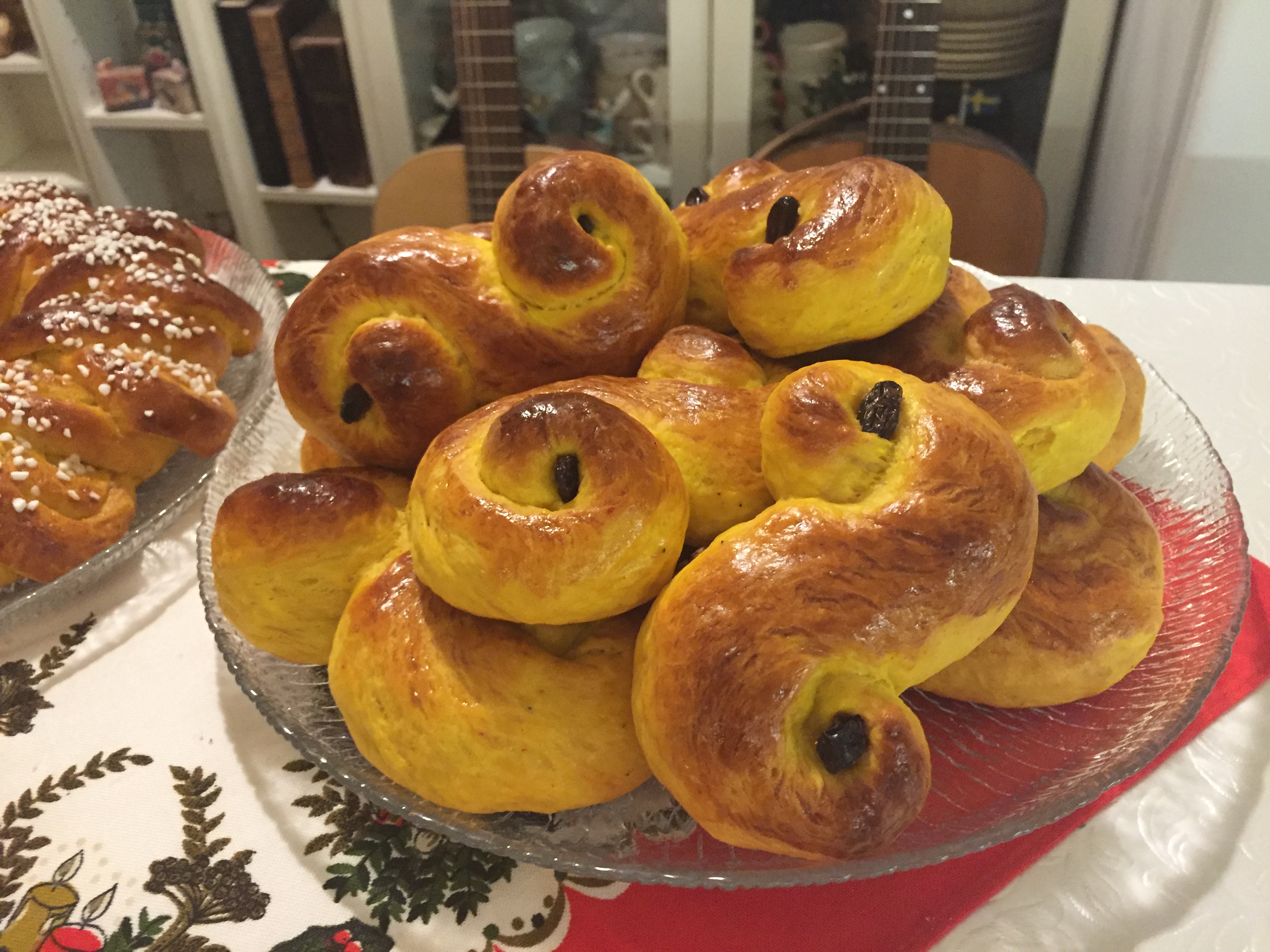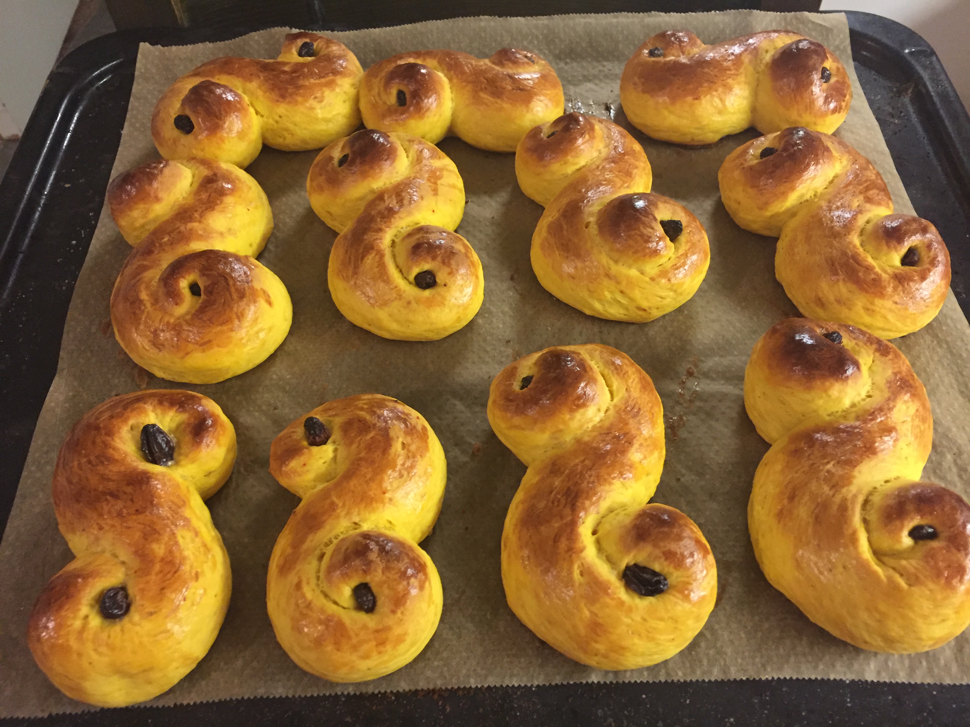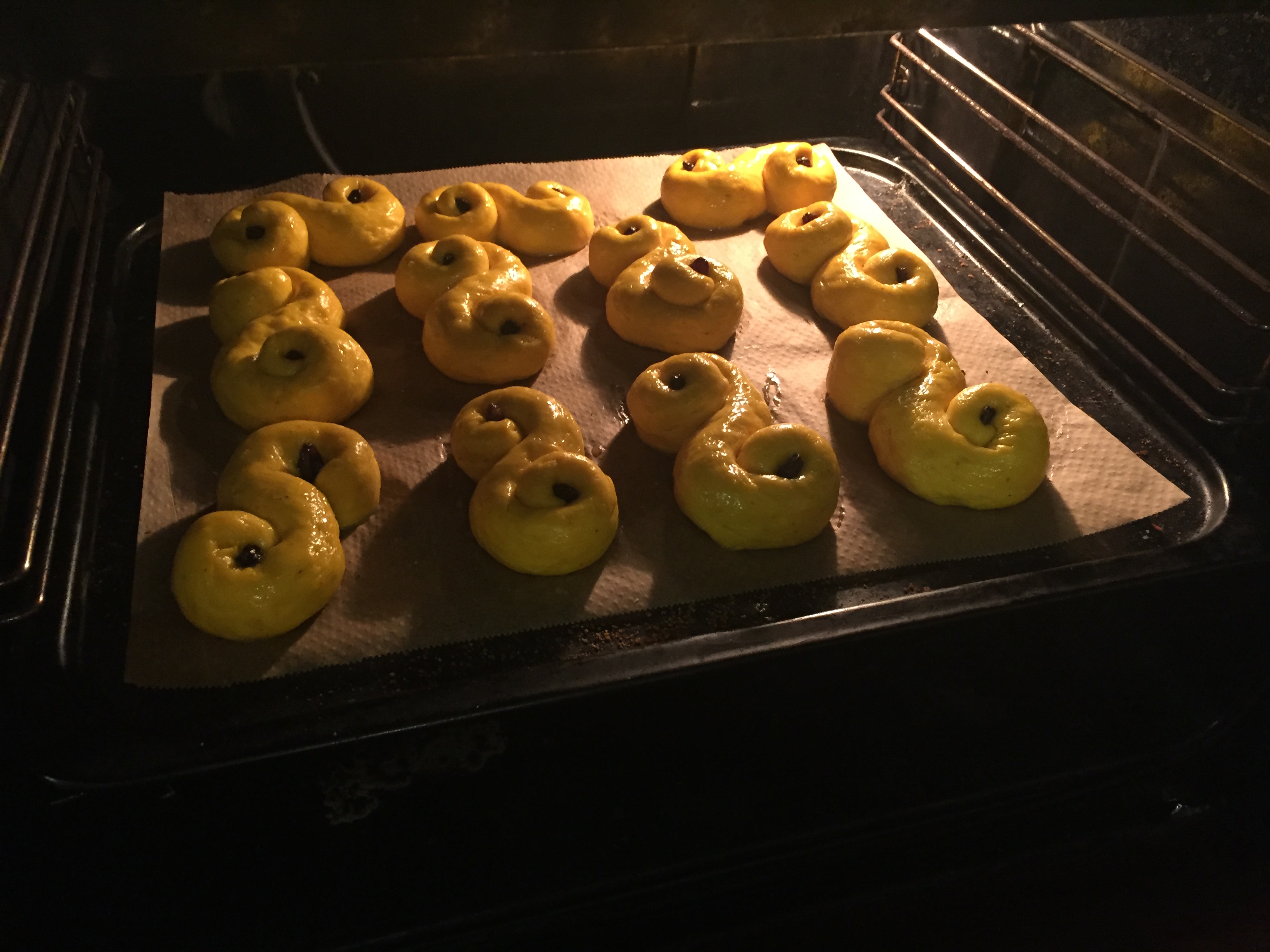 It is soon 13:th December and Lucia here in Sweden. And what is a “must” is “Lussebullar” or St Lucia Saffron Rolls. In the morning of Lucia I always gave my daughter these for breakfast. Usually we also have these for coffeebreaks around at workplaces and even at home this day. The kids will go in “Luciatåg” and sing and eat Luciabuns, in schools, in daycare, everywhere. It is also most often served with “Glögg”. There are many recipes but I like this one with the Kesella, which makes them moist and very good. Something that also makes them great is the best saffron with whole pistils that you crush yourself. It is hard to find in the stores.. Ordinary saffron that is powdered works great too.