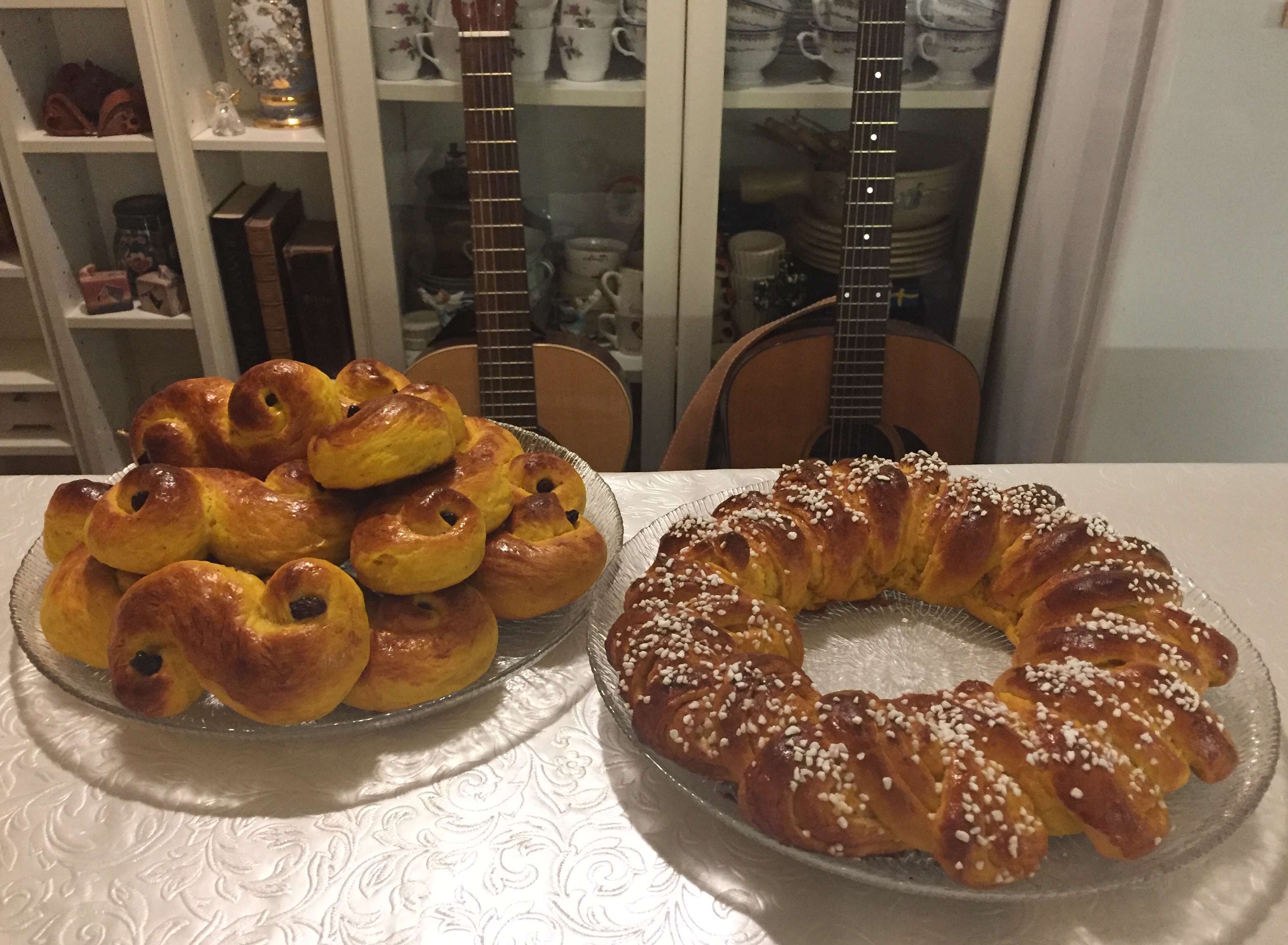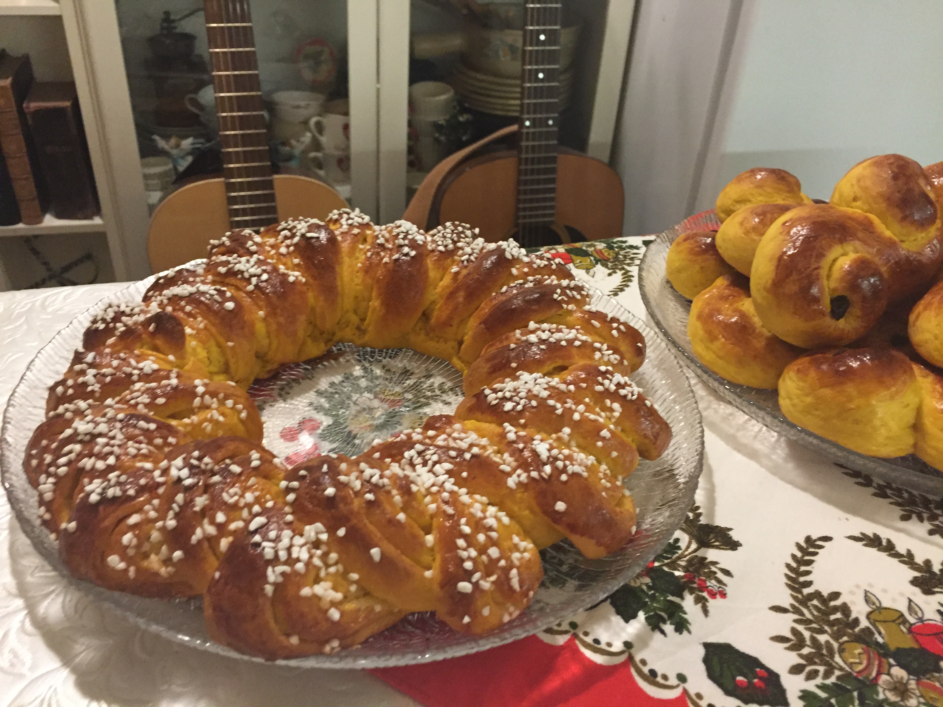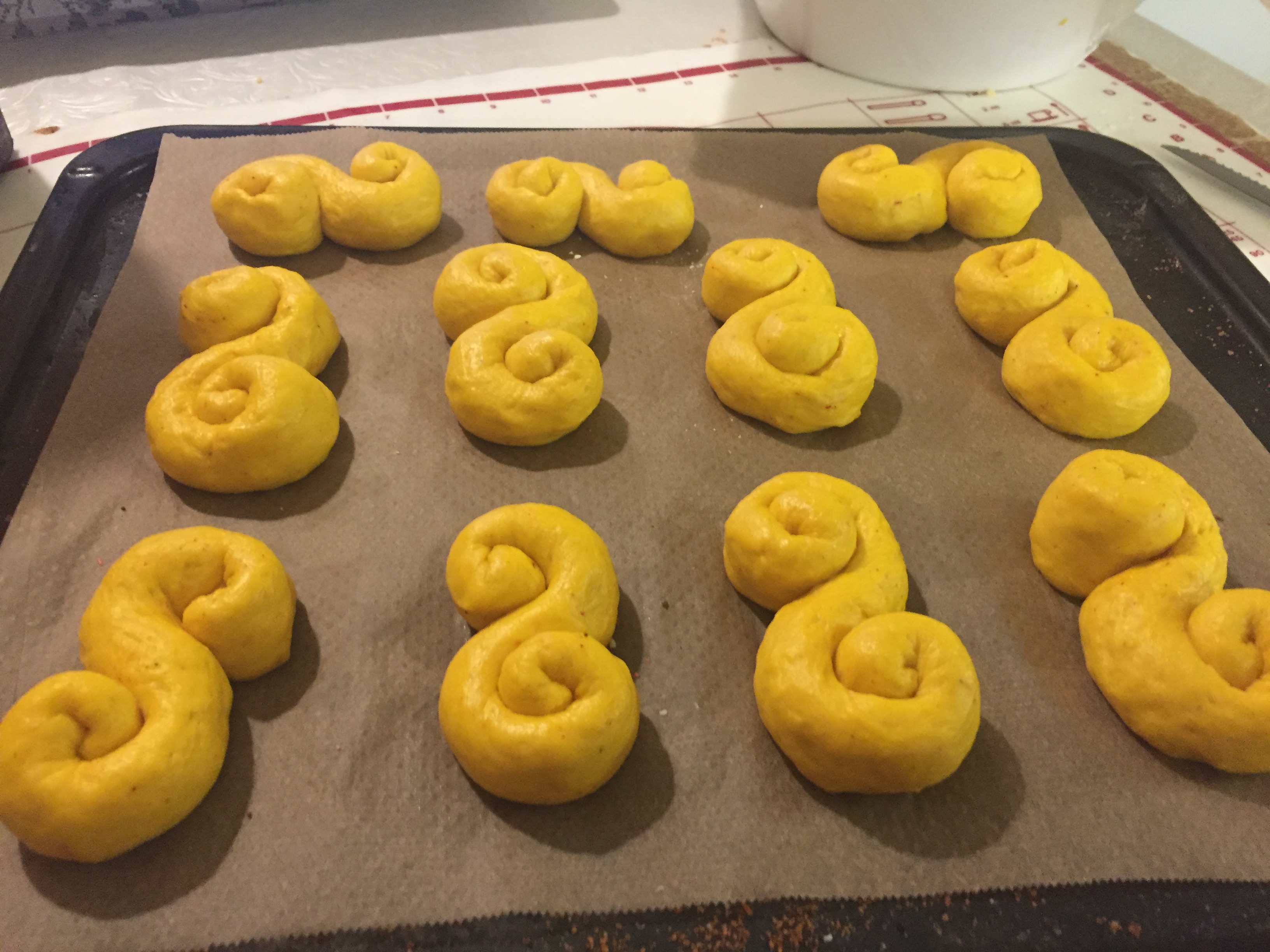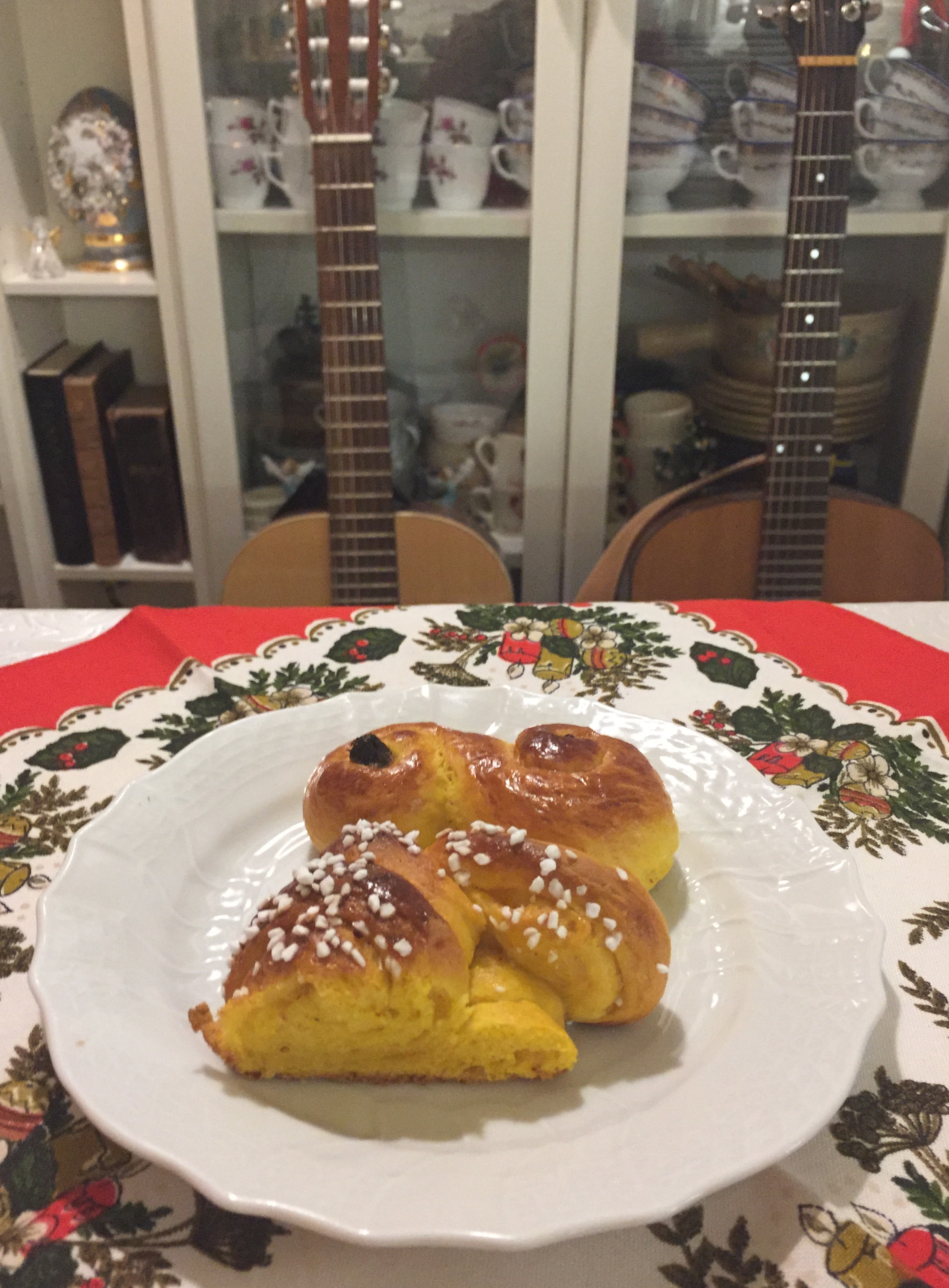 It is soon 13:th December and Lucia here in Sweden. And what is a “must” is “Lussebullar” or St Lucia Saffron Rolls. In the morning of Lucia I always gave my daughter these for breakfast. Usually we also have these for coffeebreaks around at workplaces and even at home this day. The kids will go in “Luciatåg” and sing and eat Luciabuns, in schools, in daycare, everywhere. It is also most often served with “Glögg”. There are many recipes but I like this one with the Kesella, which makes them moist and very good. Something that also makes them great is the best saffron with whole pistils that you crush yourself. It is hard to find in the stores.. Ordinary saffron that is powdered works great too.