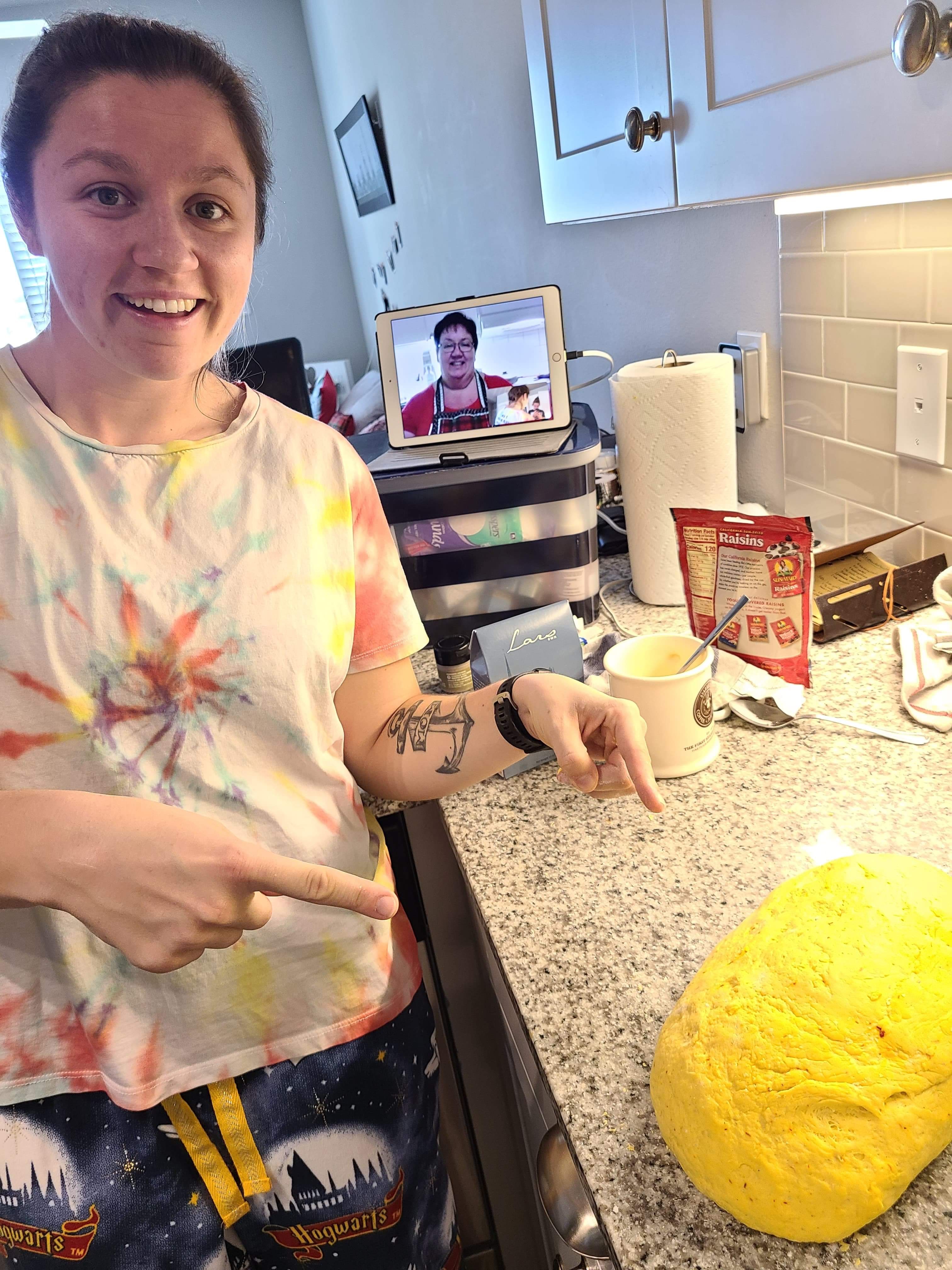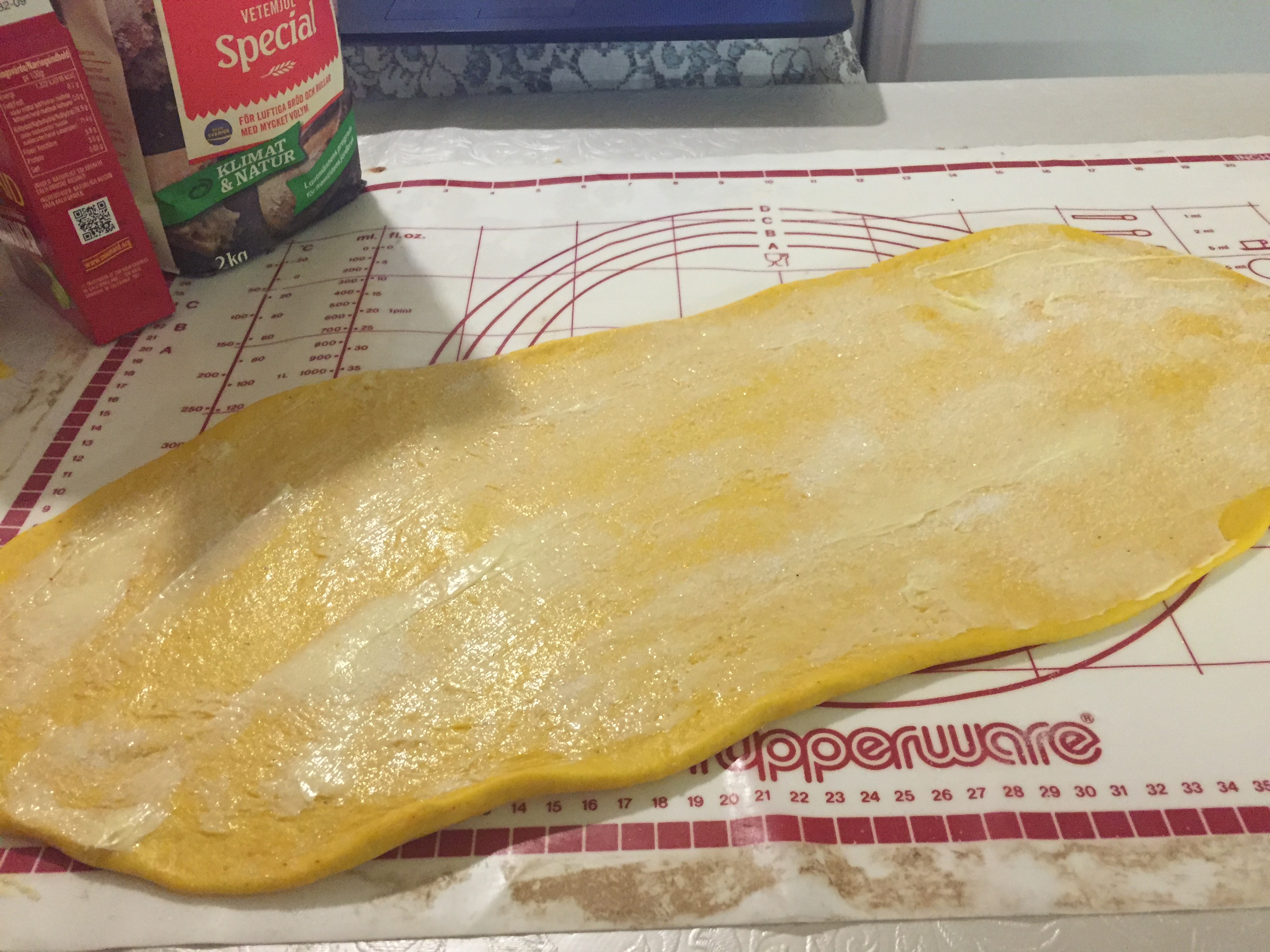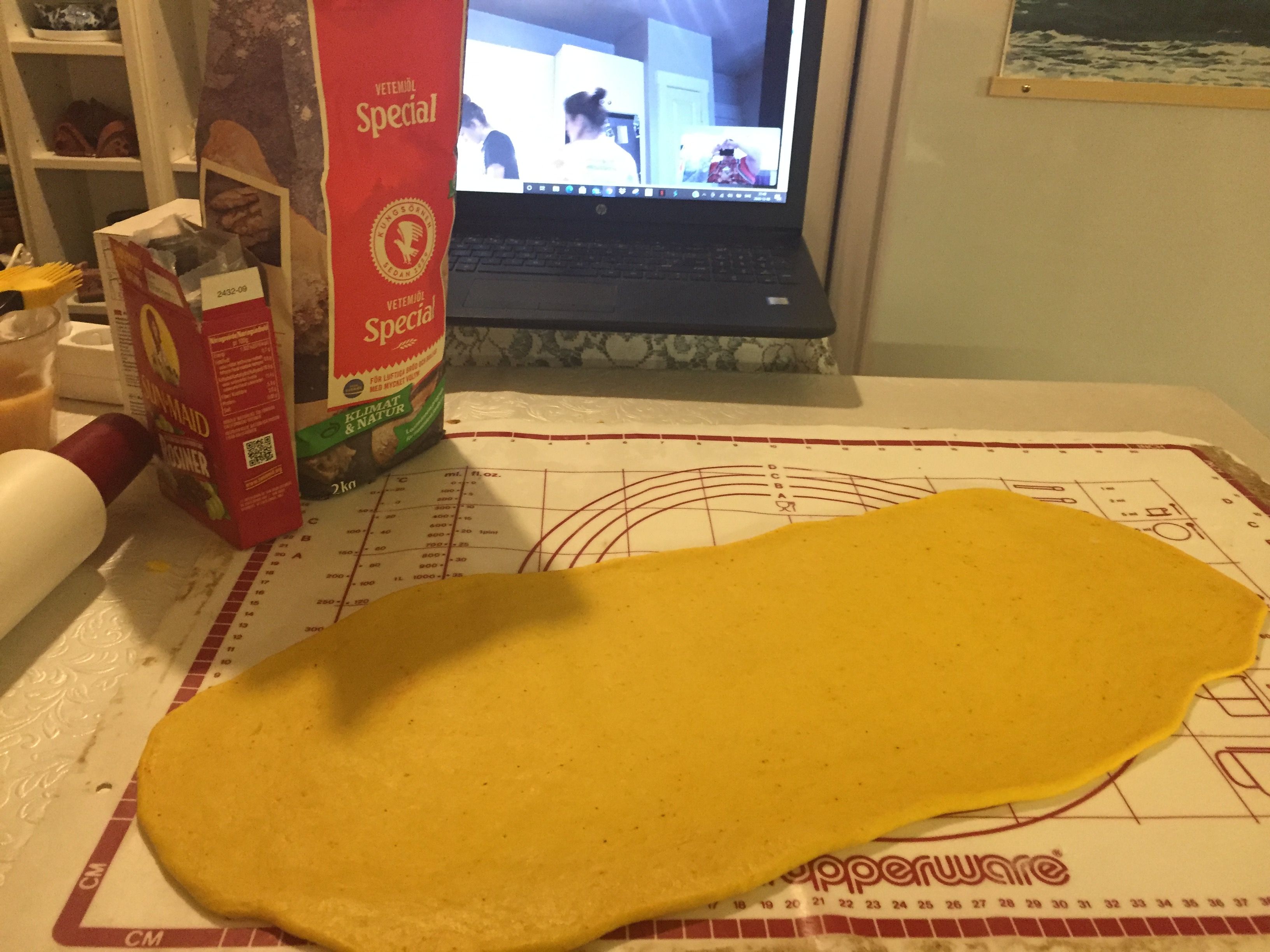 You make it from the same dough. Roll is out with a rolling pin and spread butter and suger över the whole. Some even spread raisins and/or pistagenuts and marzinpan. I made it simple this time with just butter and sugar. Roll it up like a snake and make a ring. Place the ring on a bakingtray on parchment paper. And than you cut. Start from one place and go in one direction as you cut all around. Fold the cut parts to each side to make the leaf formation. Do this around the whole. My mother taught me to make this kind of Cringle which is called Bladkrans in Norwegian when you make the leaf shape. A Cringle could even be braided.