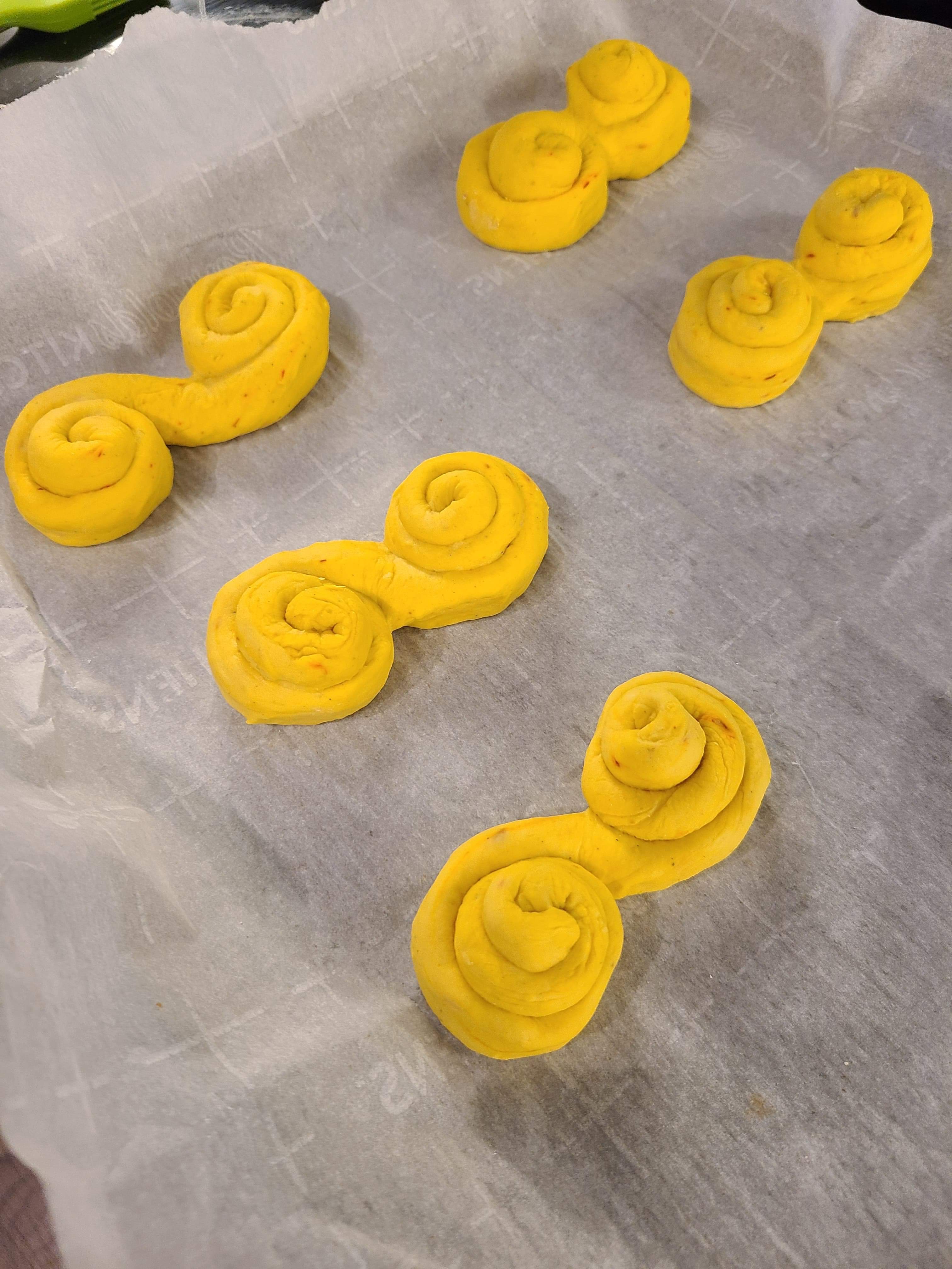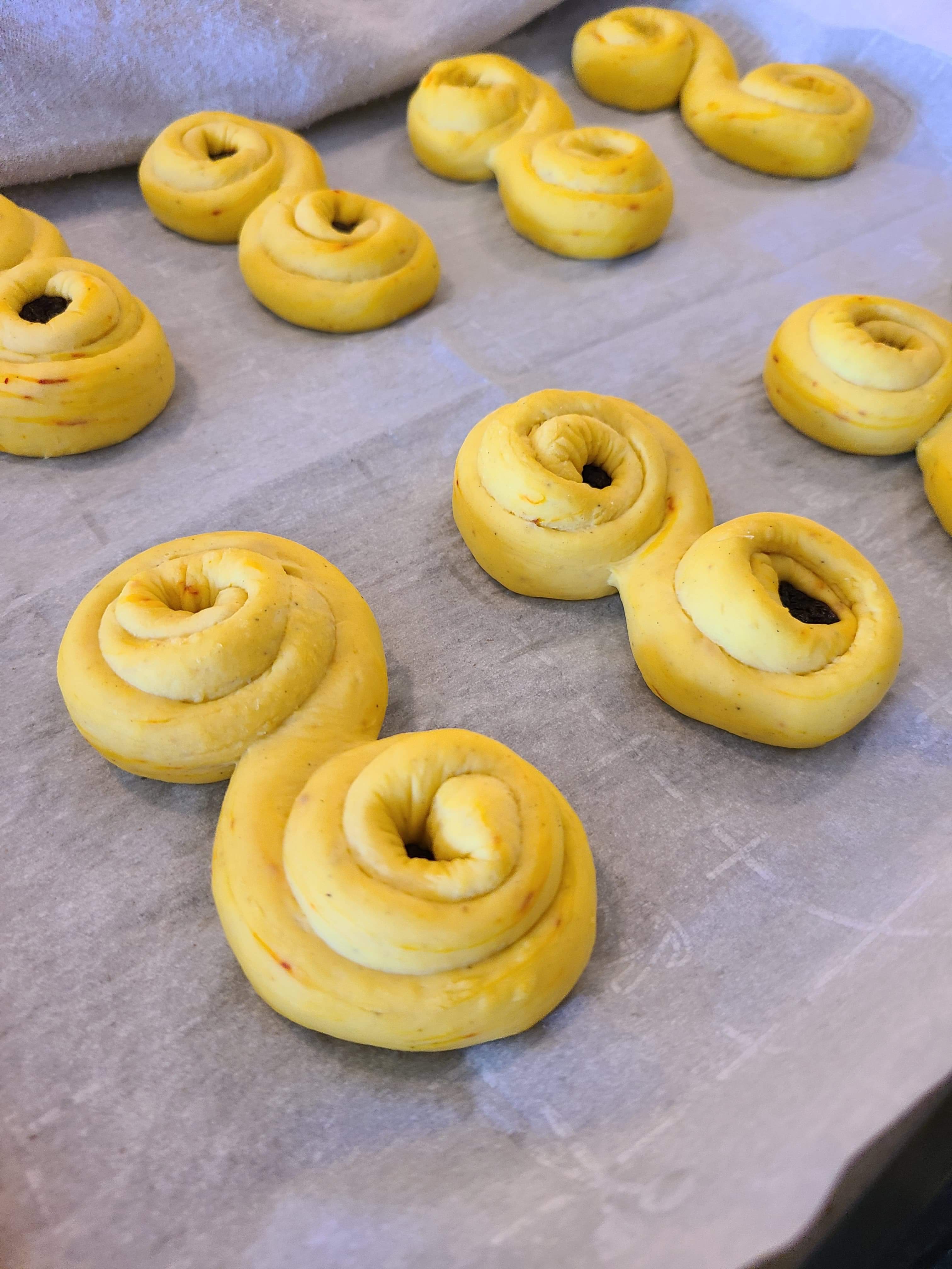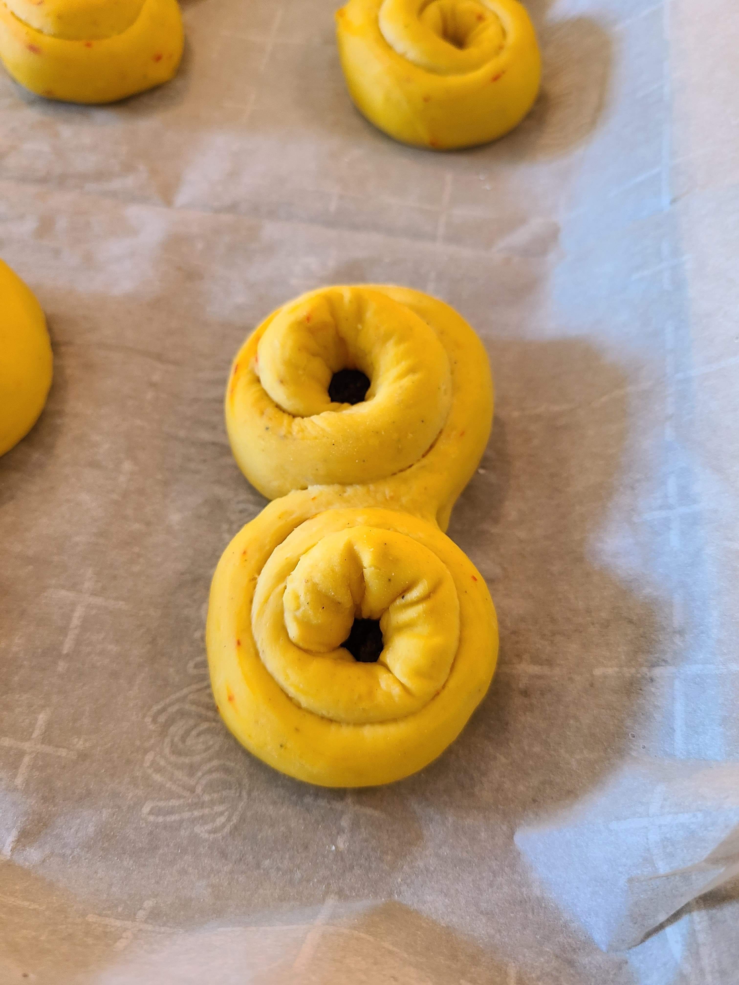 5. Line a baking sheet with parchment paper. Punch down the dough and transfer it to a lightly floured surface. Shape the dough into a log and divide it into 35 equal pieces. Shape each piece into Luciabuns, ”eights” as in picture and place the rolls apart on the prepared baking sheet. Wash with eggwash. Garnish with raisins. Cover with a kitchen towel and let rise for 20 minutes, or until almost doubled in size.