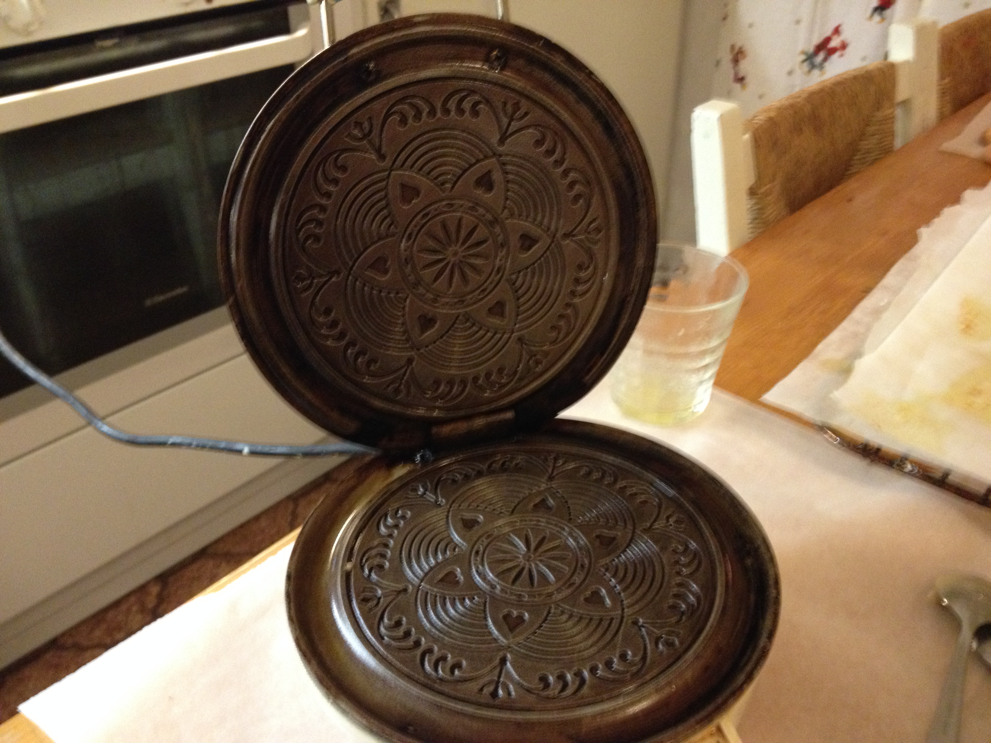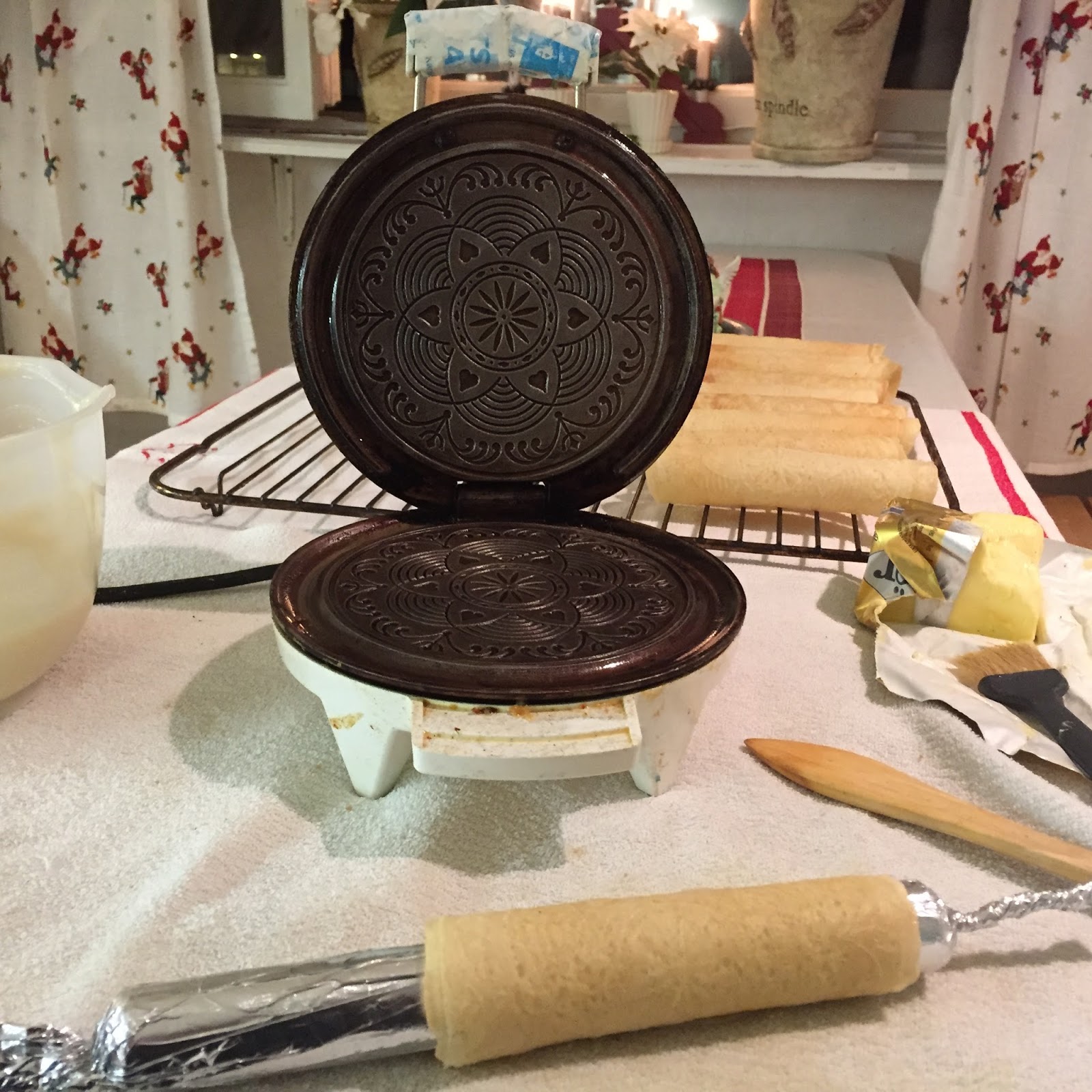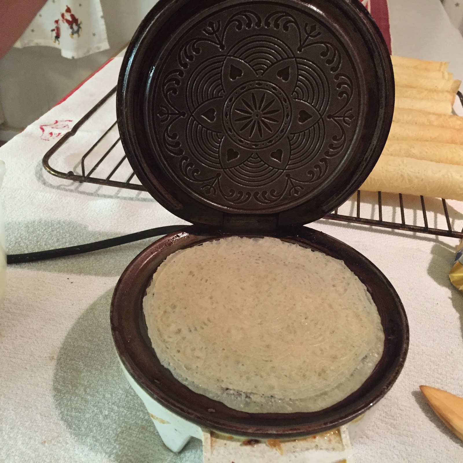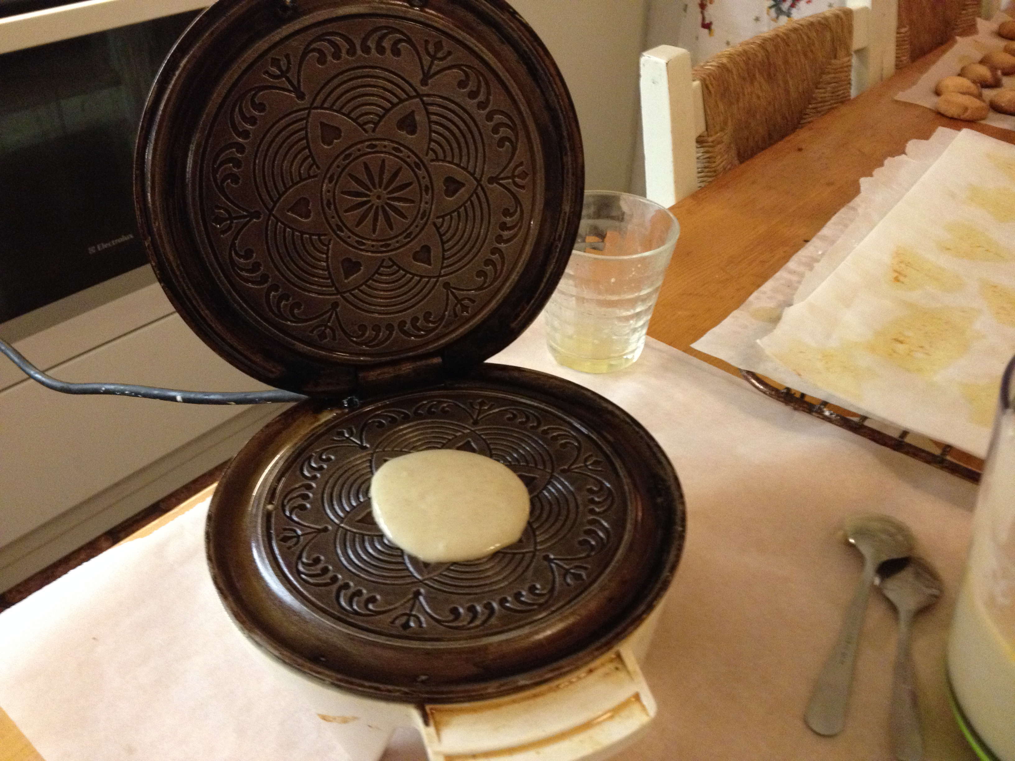 To fry the Krumkake you need a Krumkakejern (a special iron like the one in my picture which is a modern electrical one. There are also the old fashioned irons that you put on top of the stove. These can be found in secondhand stores or maybe with a old relative.
