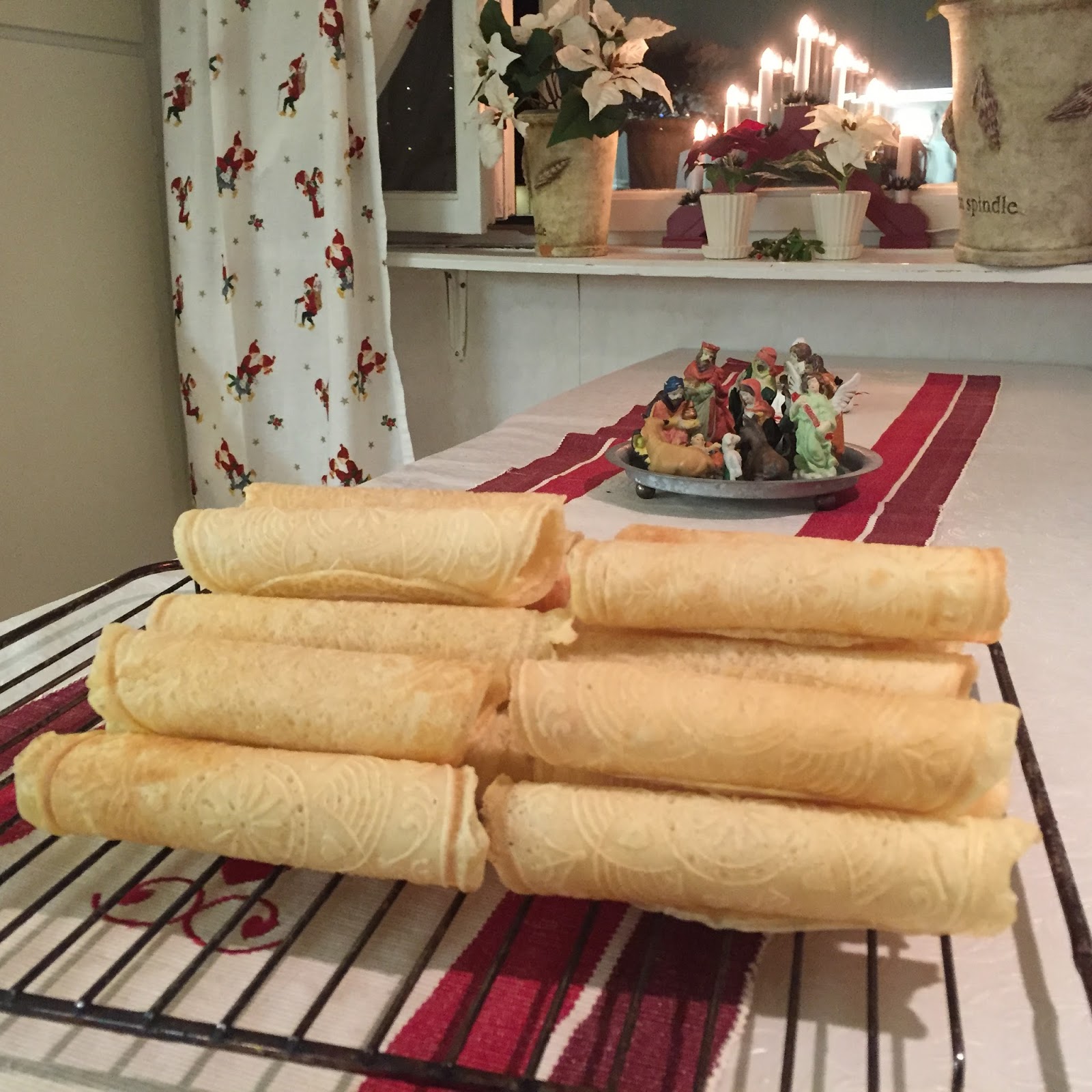 Krumkake is a traditional Norwegian cookie that is made for Christmas and also for other special celebrations. It is crispy and wafer like. To make the beautiful pattern a special iron is used for the frying. I have made these cookies as long as I can remember. My mother was an expert and I feel I sometimes succeed and sometimes fail. The trick is to get them thin and crispy. This cookie is also traditional in Sweden and here it is called Rullrån.