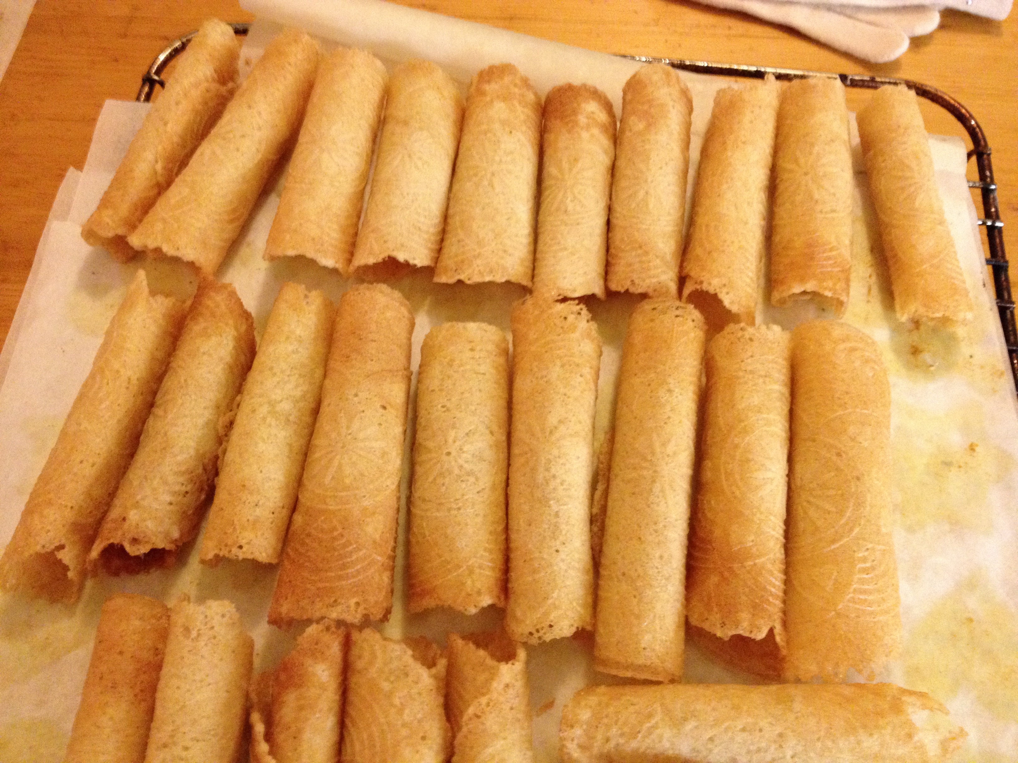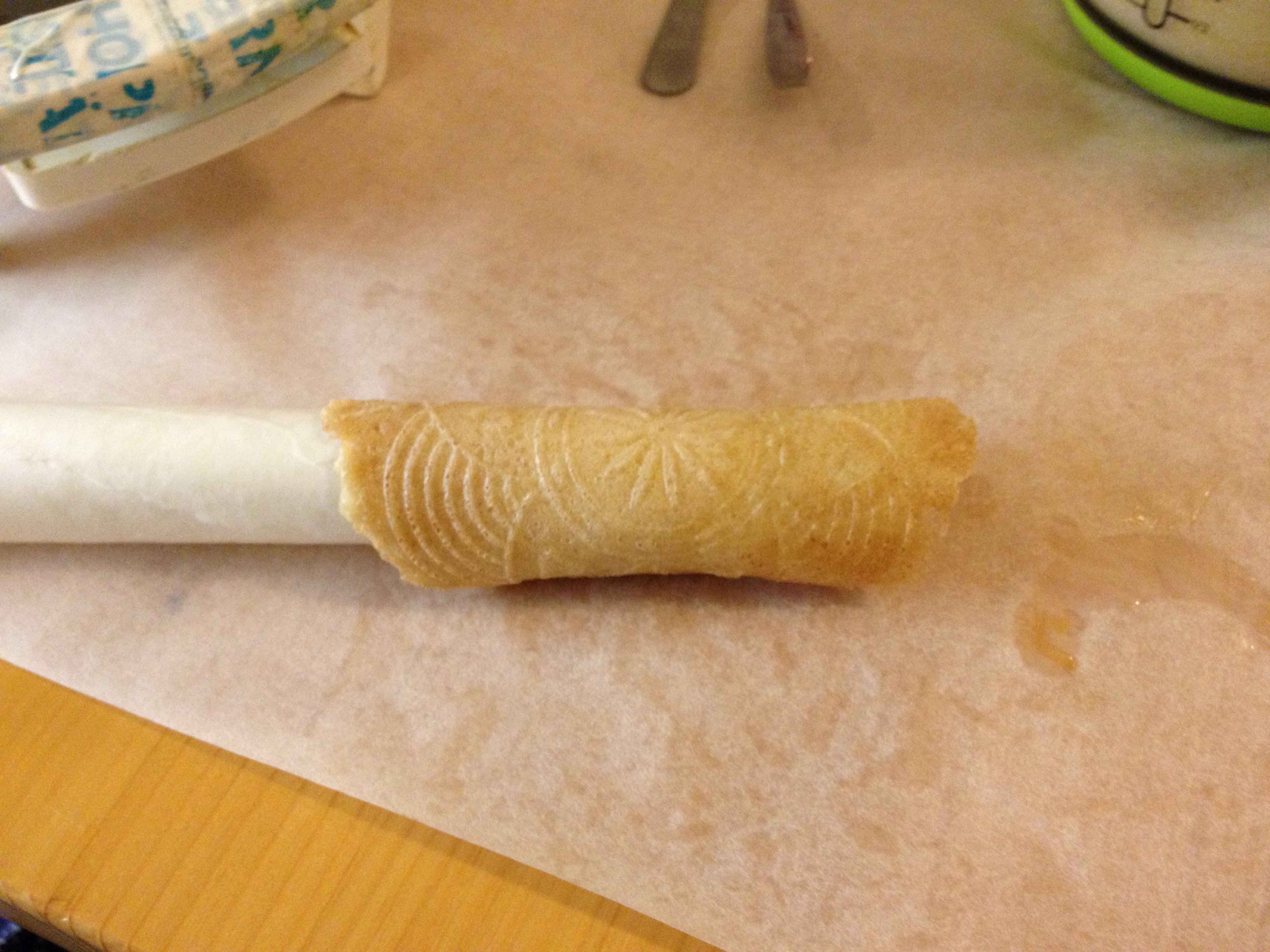 Remove the Krumkake from the iron and roll immediately around a wooden stick or a paperroll. It has to be done fast since the Krumkake get hard once you take them out of the iron. When rolled put on a rack to cool.