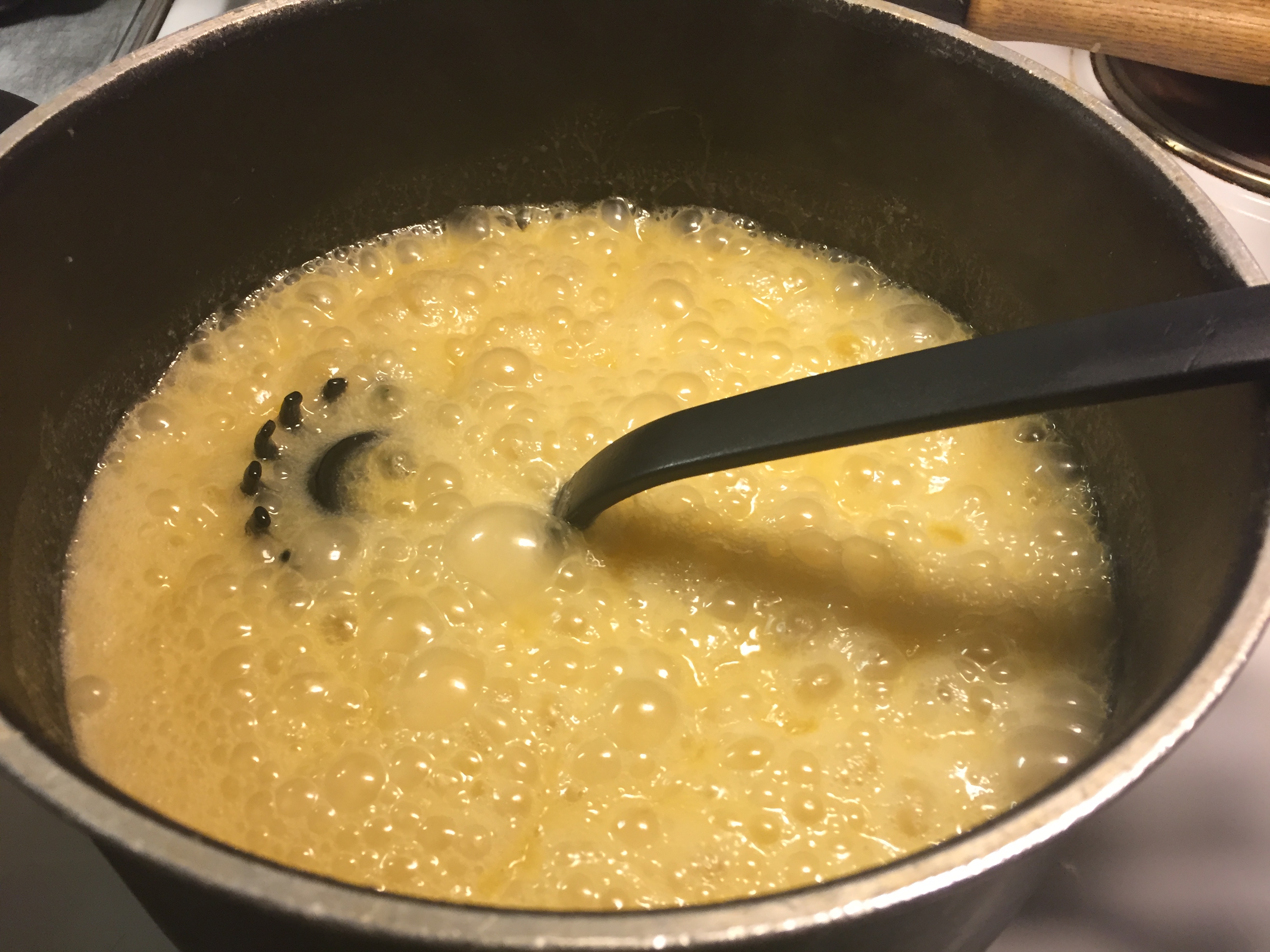 Melt the butter in a thick-bottomed, saucepan. Add cream, sugar, syrup and vanilla sugar.