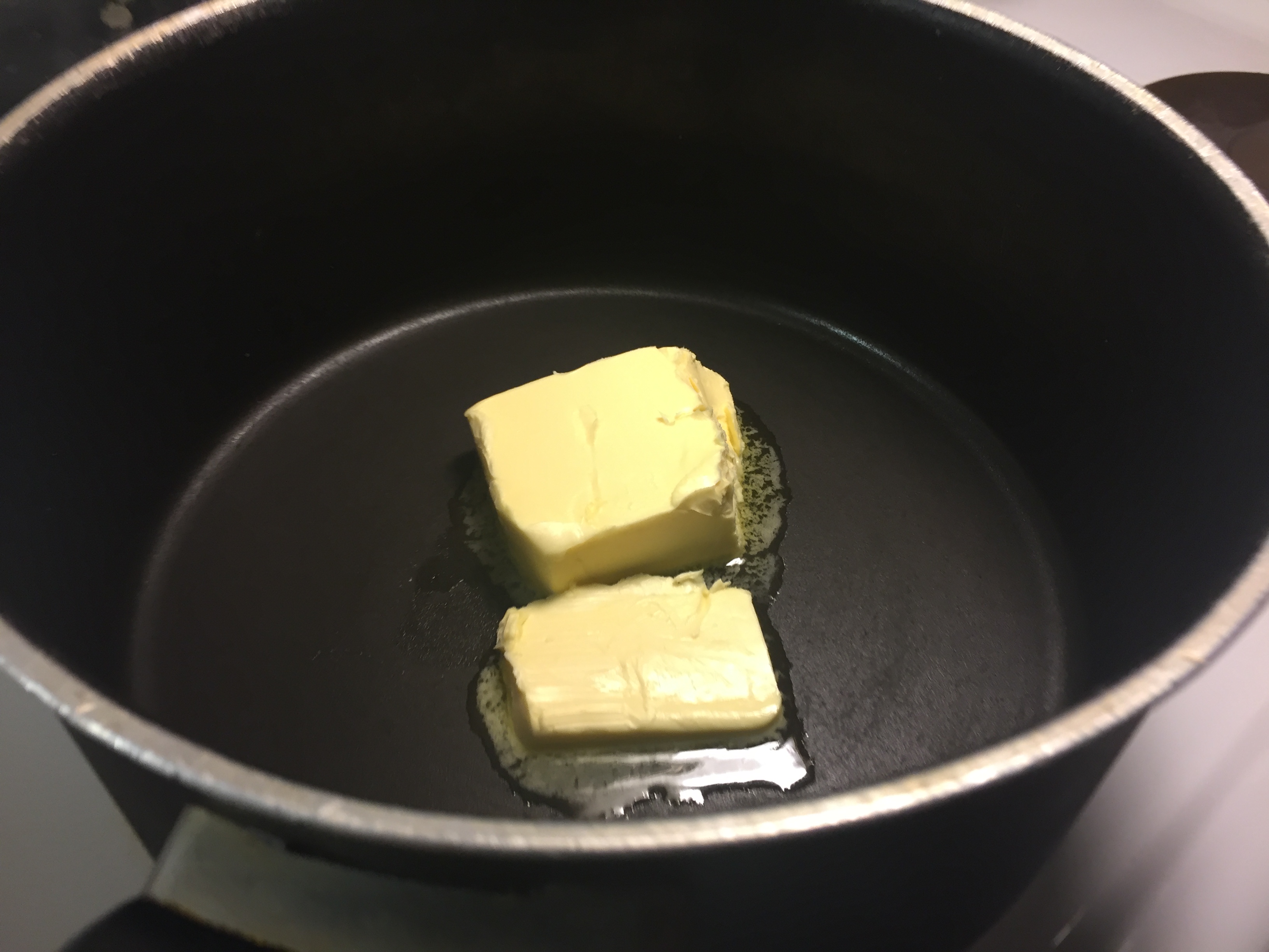 Melt the butter in a pot. Place parchment paper in a form, about 20×30 cm