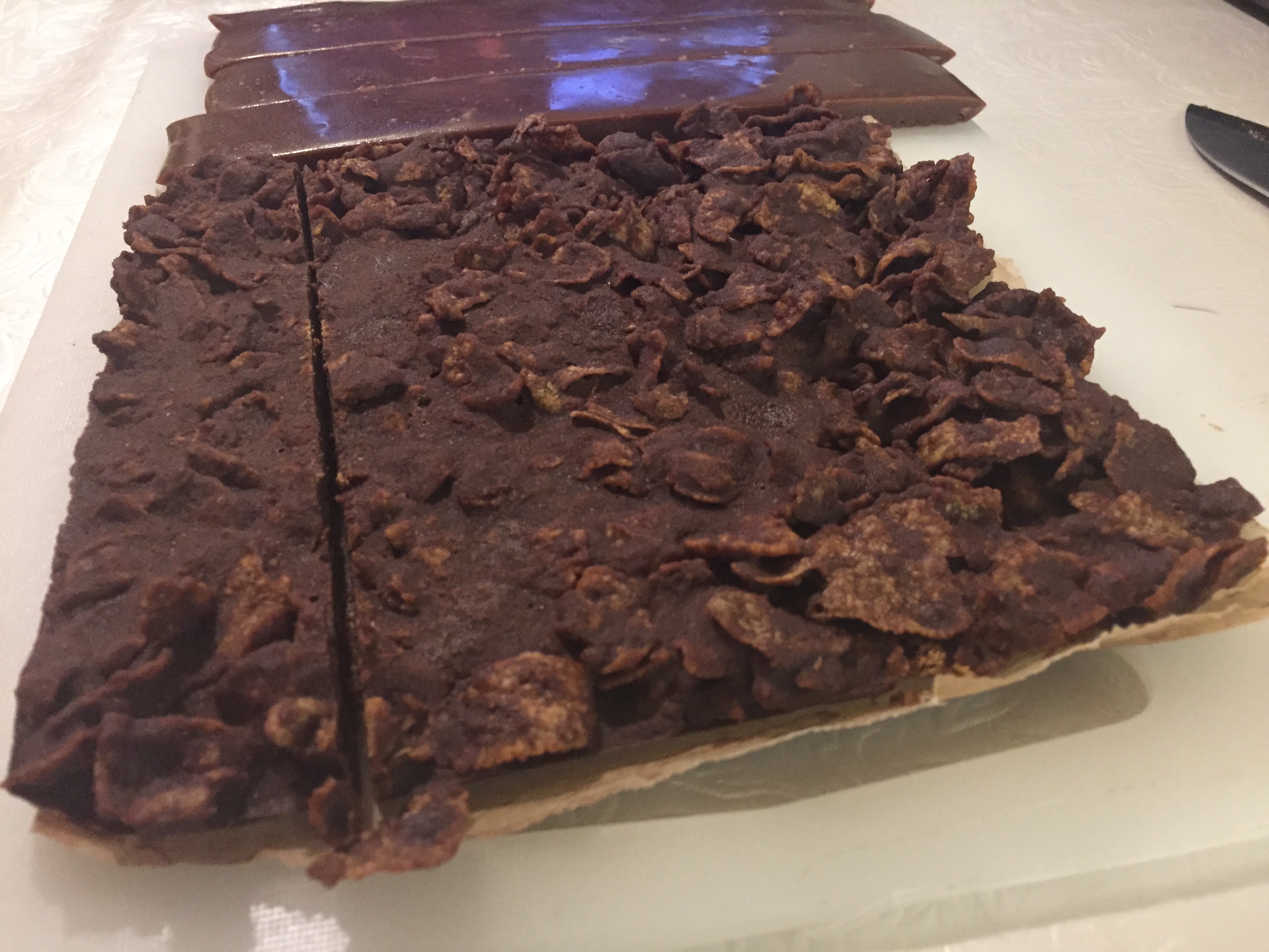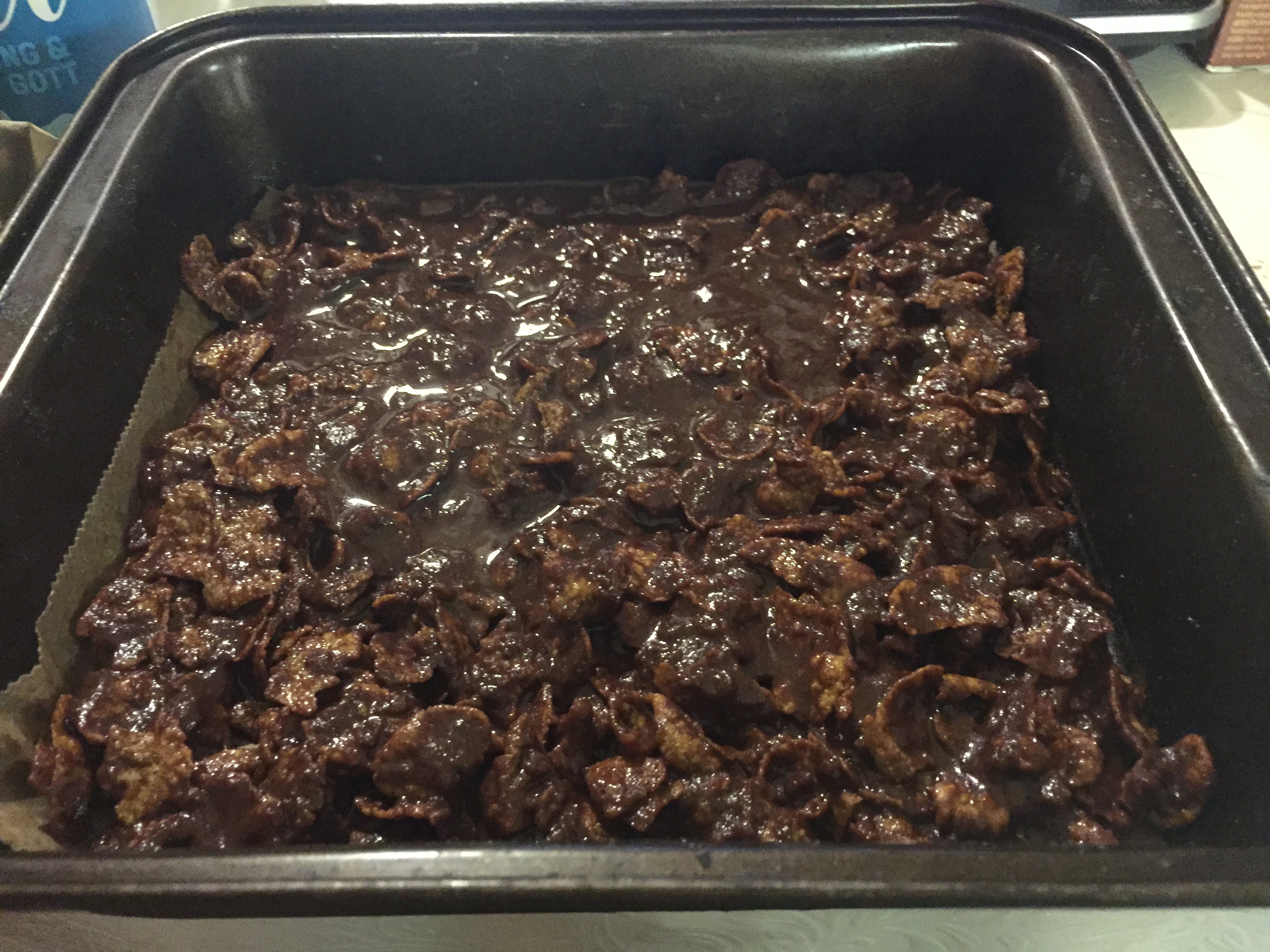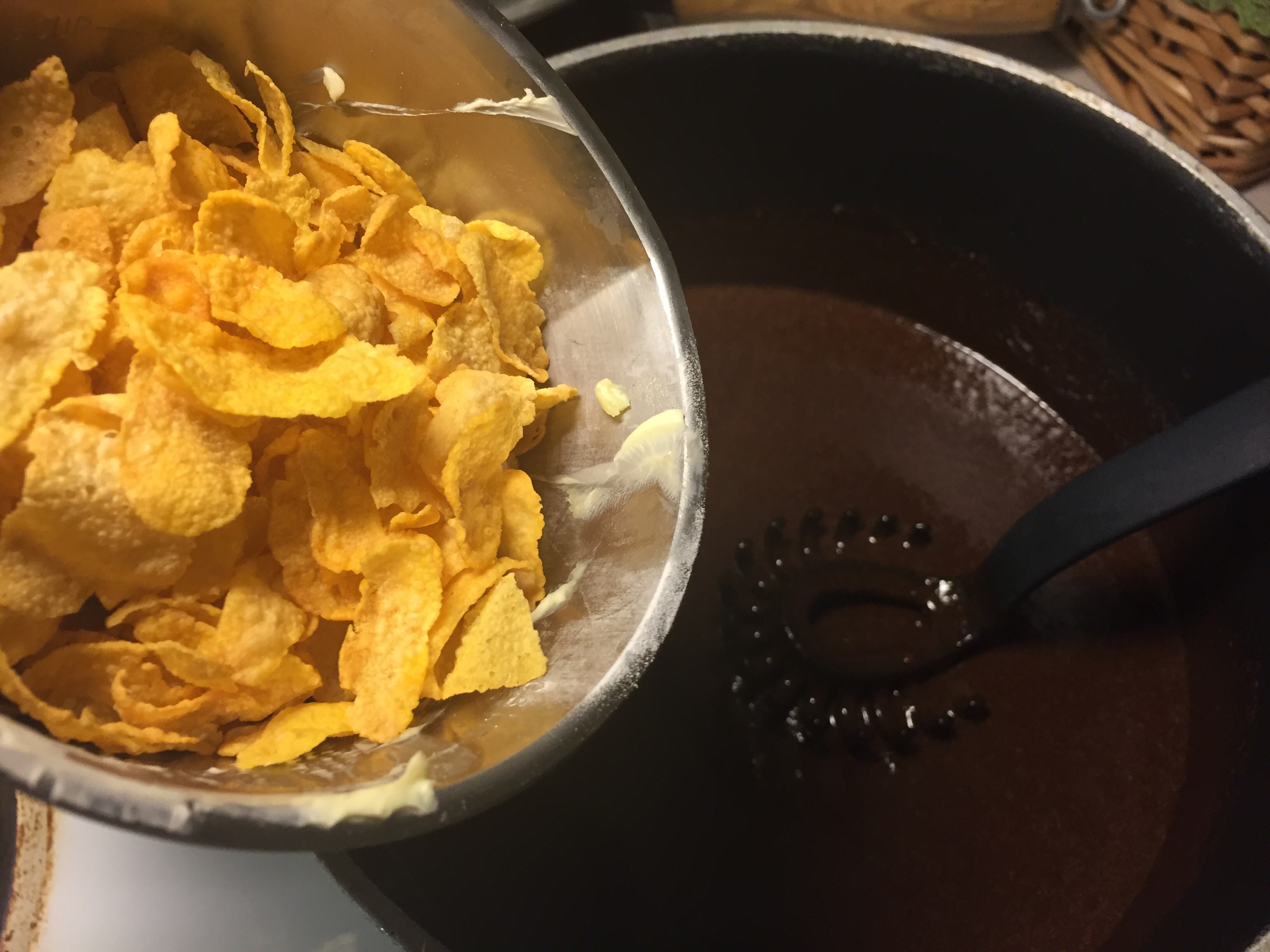 Add sugar, vanilla sugar, cocoa and syrup. Bring to the boil while stirring until the sugar has dissolved. Roughly chop the chocolate and place in the saucepan. Melt and stir to a smooth batter. Carefully turn over the cornflakes. Pour the batter into the mold and let solidify at room temperature, at least 1 hour. Cut into 30 pieces. Store in a cool place in a airtight container.