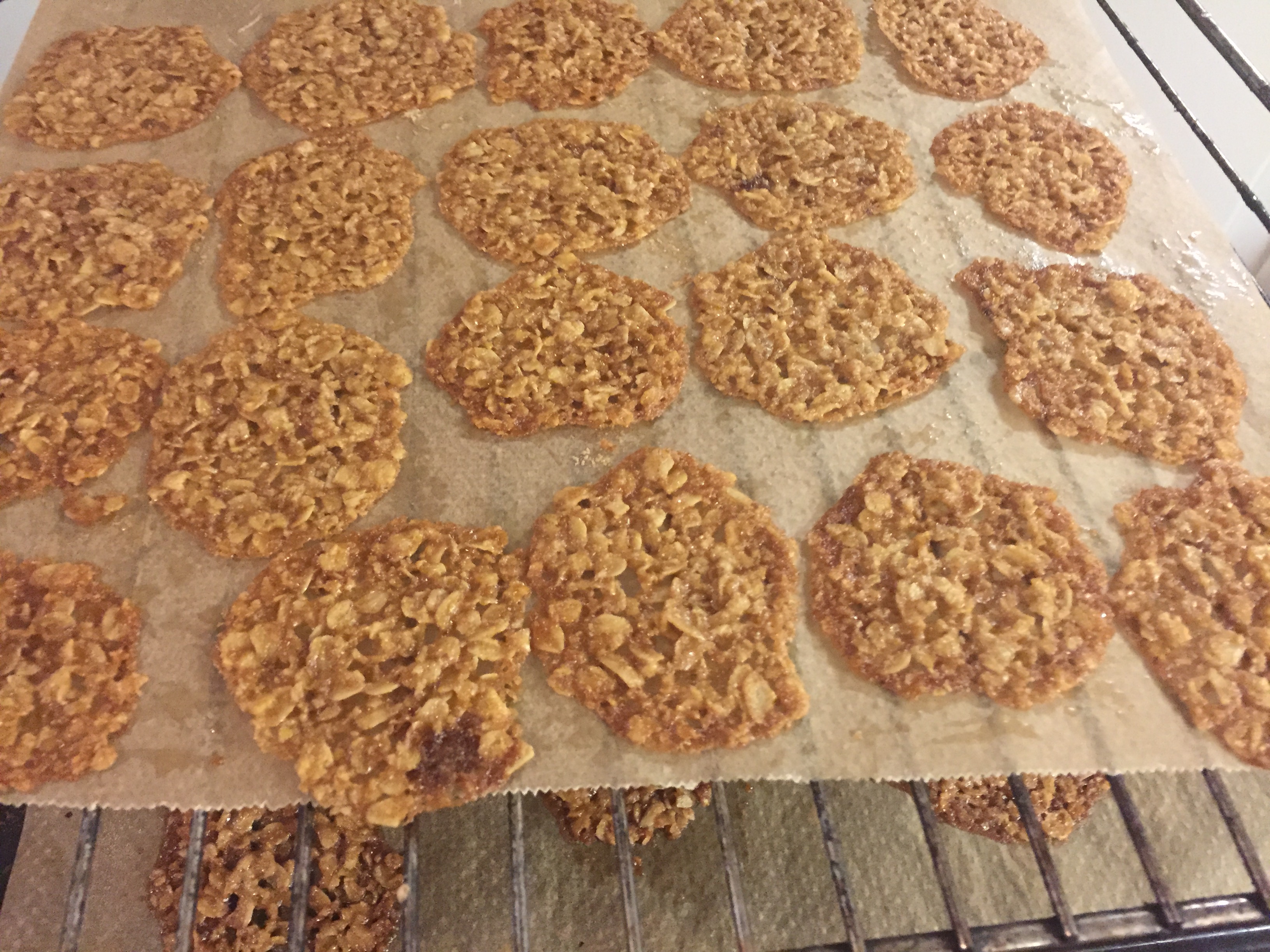 In Sweden these cookies are also traditional for Christmas and festive occations and are called Knäckflarn. Here they are filled with whipped cream right before serving. You cannot fill them long before because they would get soft from the cream. So if you want this filling you store the baked cookies until you want to serve them and then fill them.
