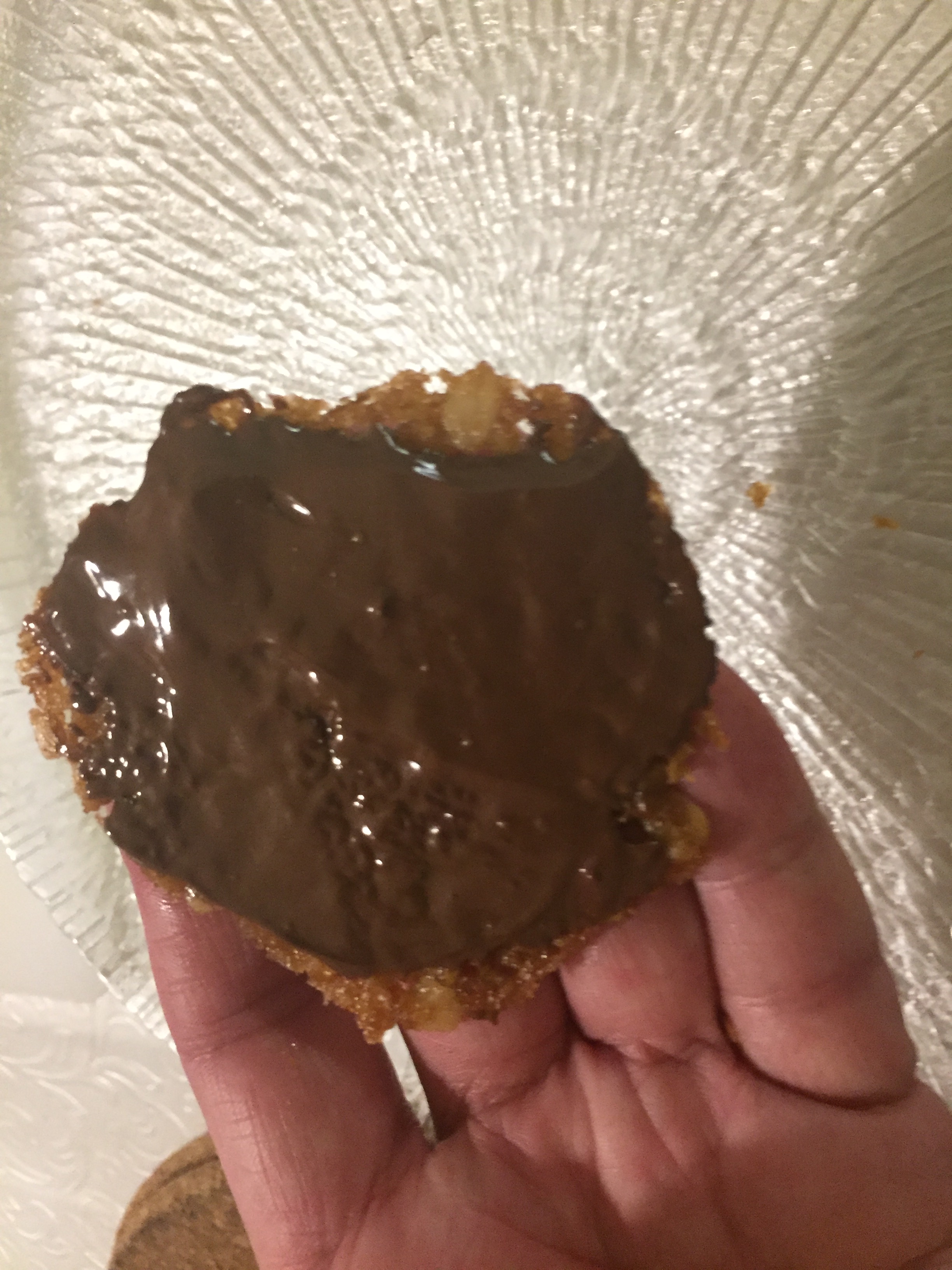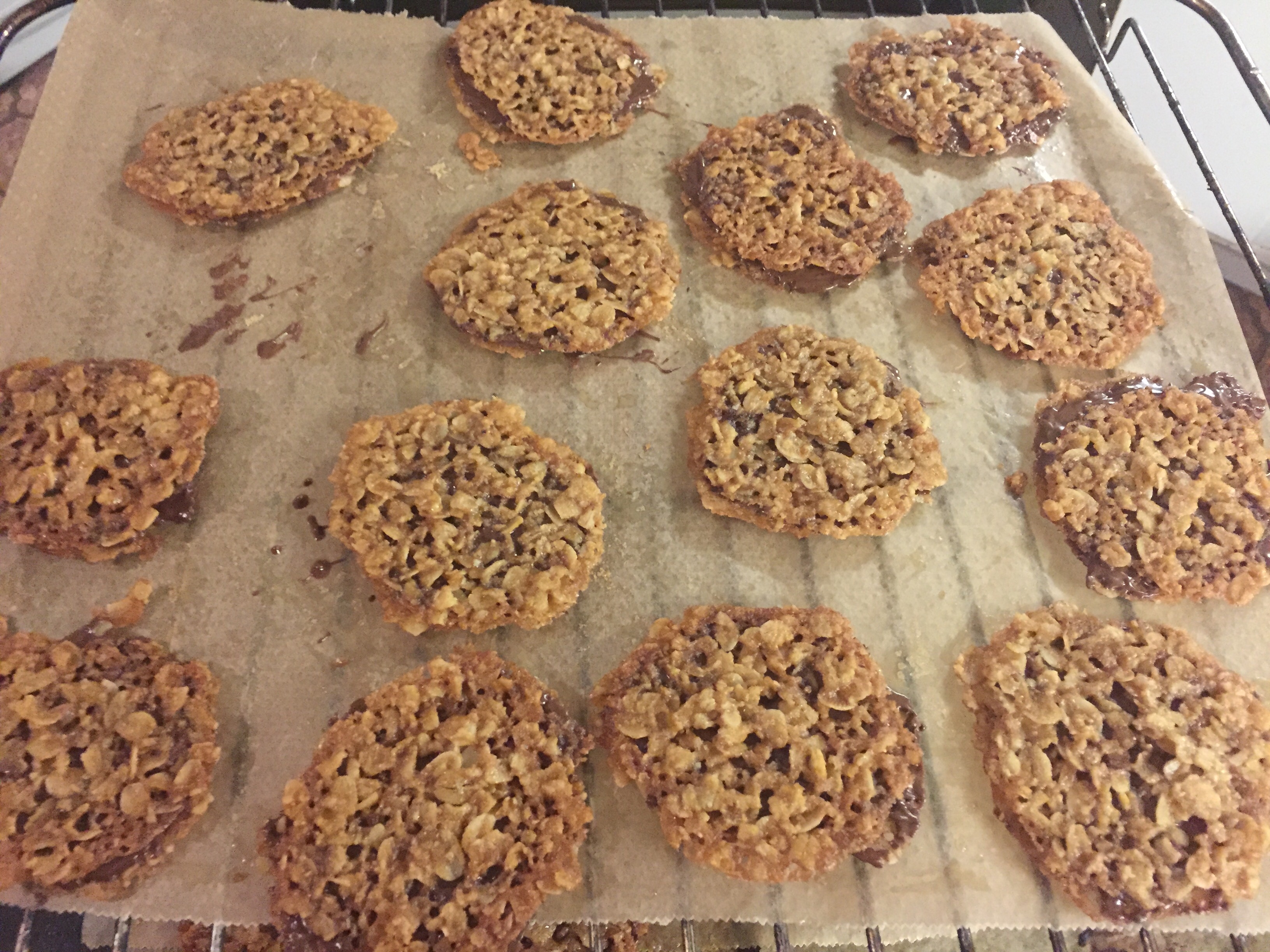 Quickly add the chocolate to the innerside of one cookie and put another with the inside on top. Now you have a filled Irish Lace Cookie. Leave the cookies to cool and chocolate to harden. You can put them in the refrigerator while the chocolate hardens.