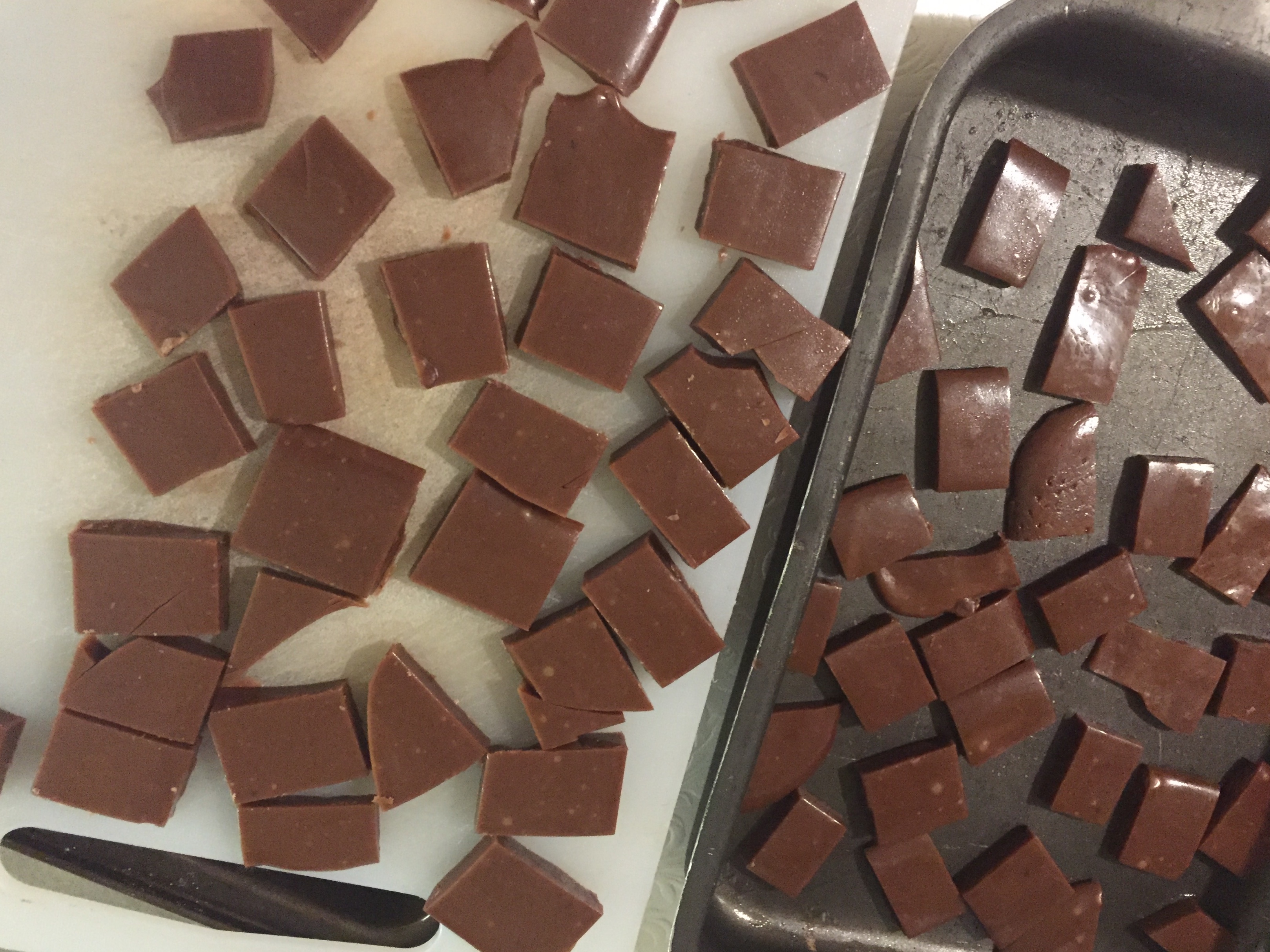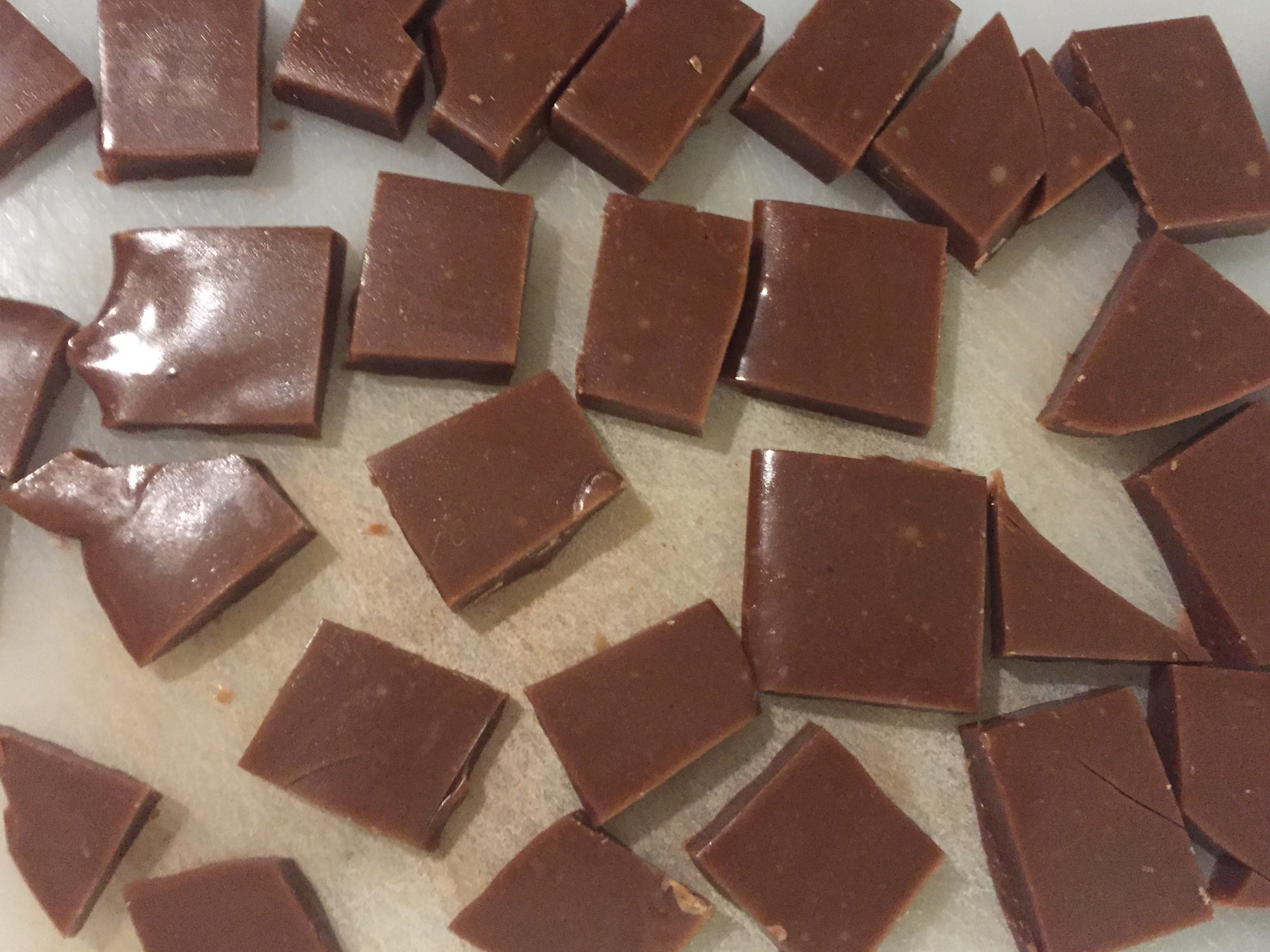 Cut into pieces. Wrap in nice paper if you want, foil or plastic or parchmentpaper. Store in a container in a cold space. If you don’t feel like wrapping every single piece place one layer in a box, place parchment paper, add another layer, put another paper and add another layer. This way the caramel will not stick together.