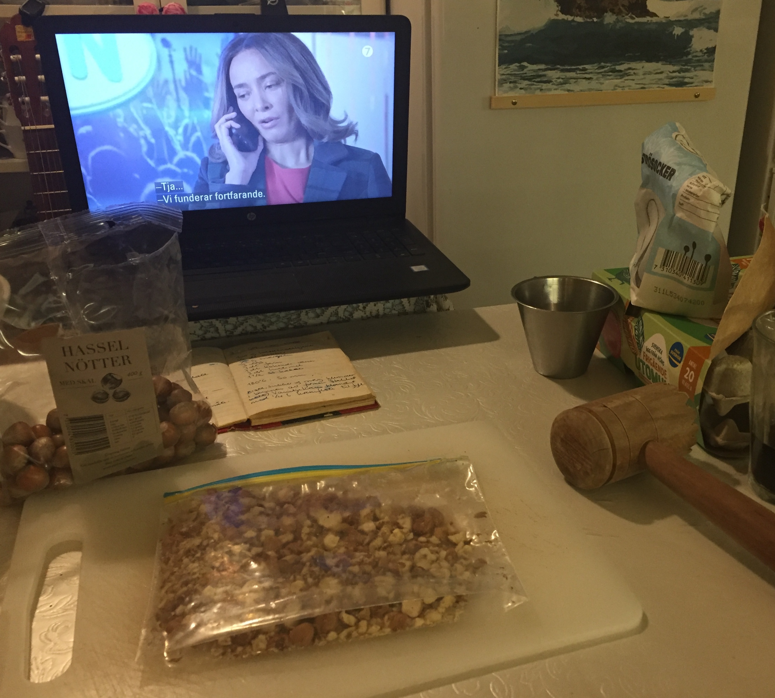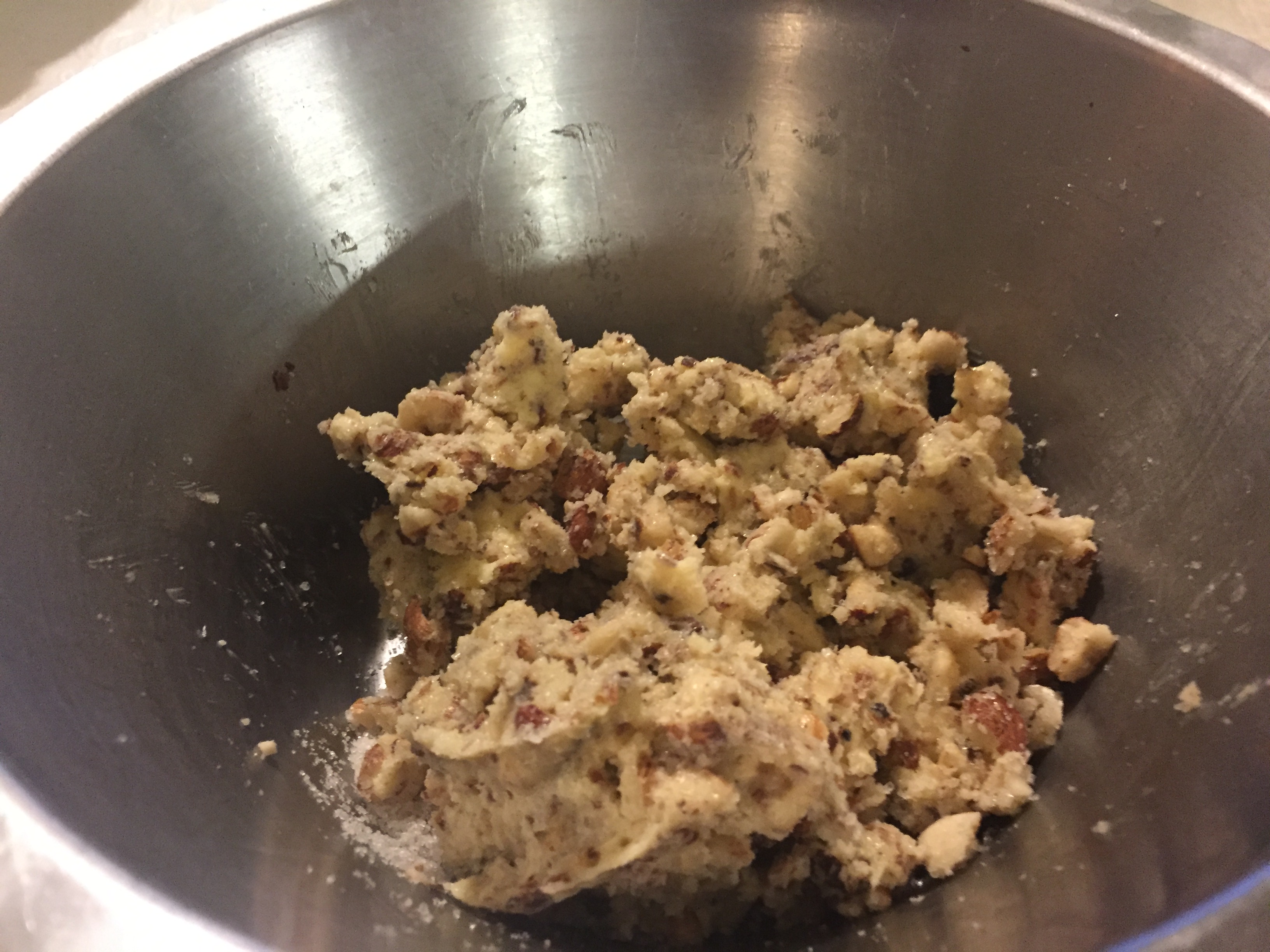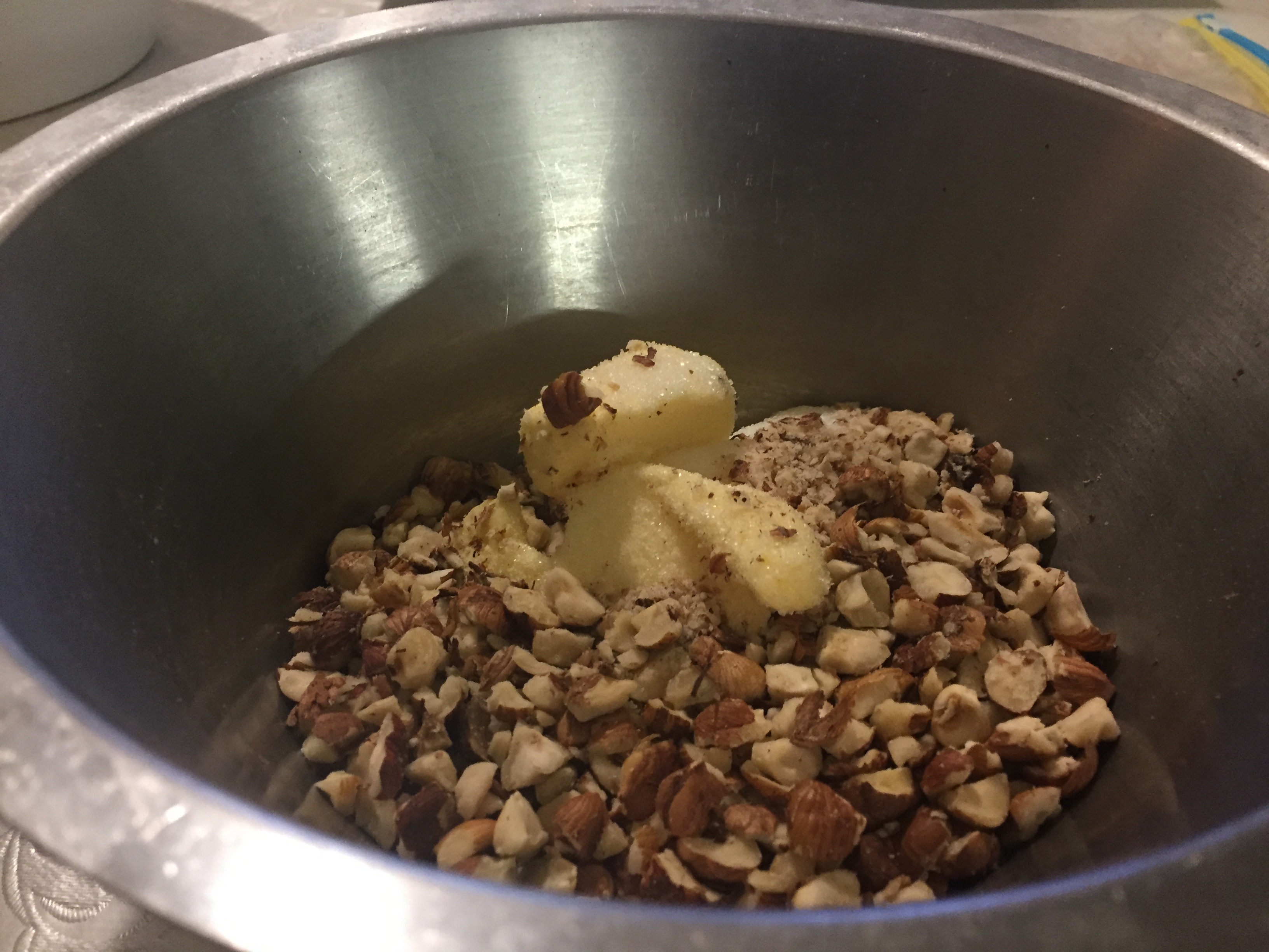 For the topping: Chop nuts. Mix nuts, sugar and room-tempered butter and press the mix into the bottom of a oven pan.