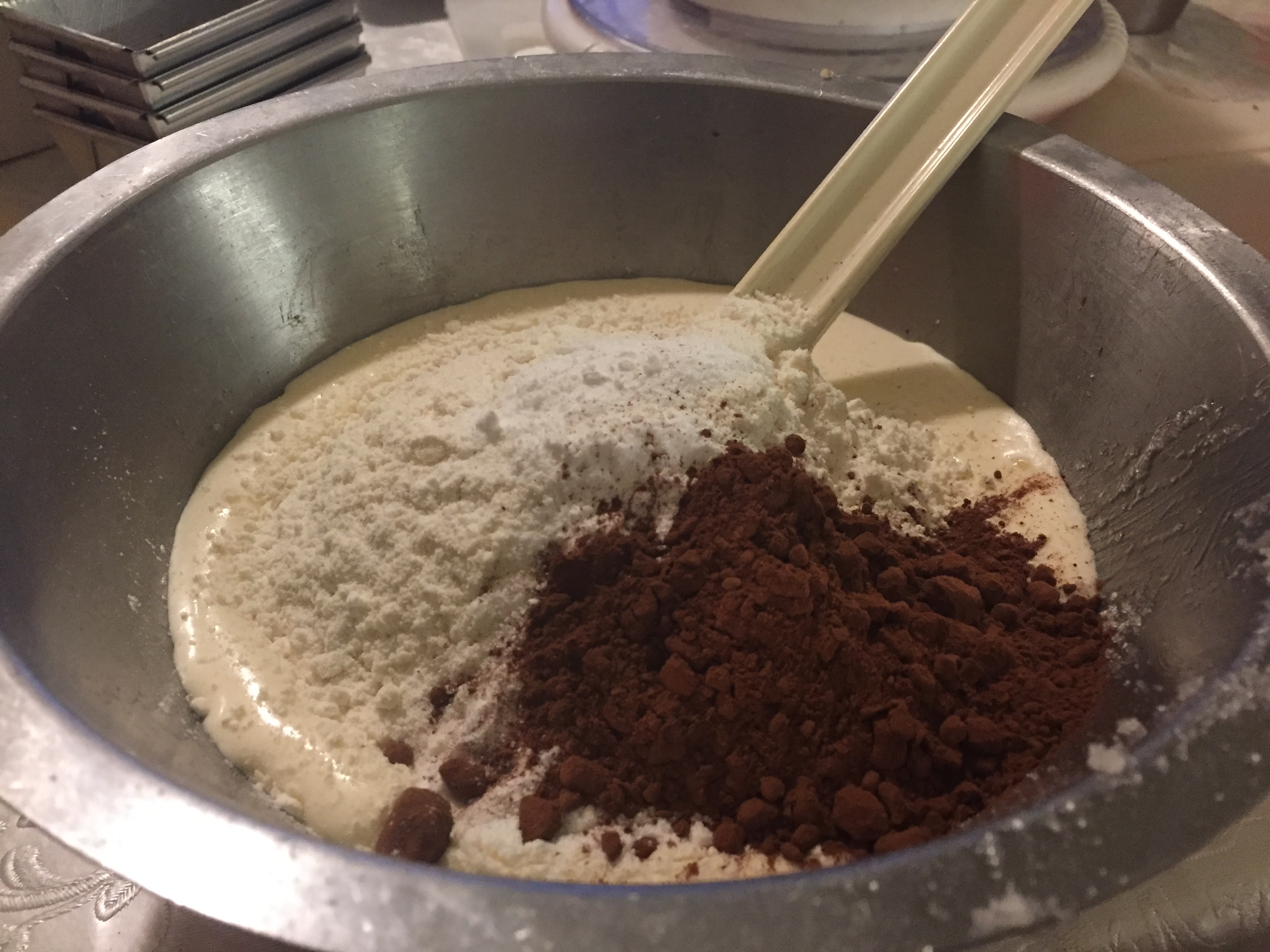 For the cake: Whisk eggs and sugar fluffy. Add boiling water, flour, cocoa and baking powder. Pour the mix over the filling in the oven pan.