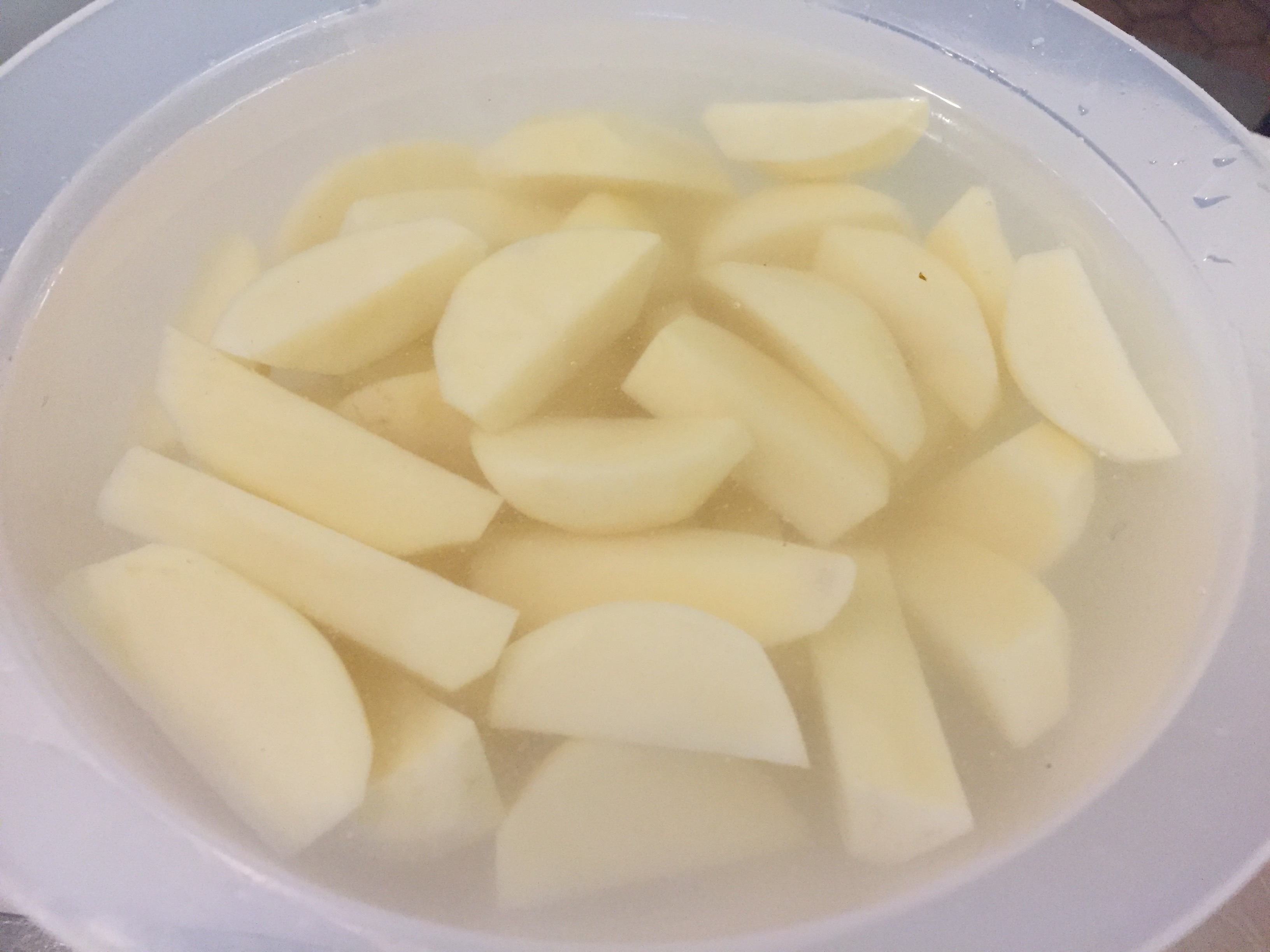 Place potatoes in a bowl and cover in water. Completely submerge the fries in water.