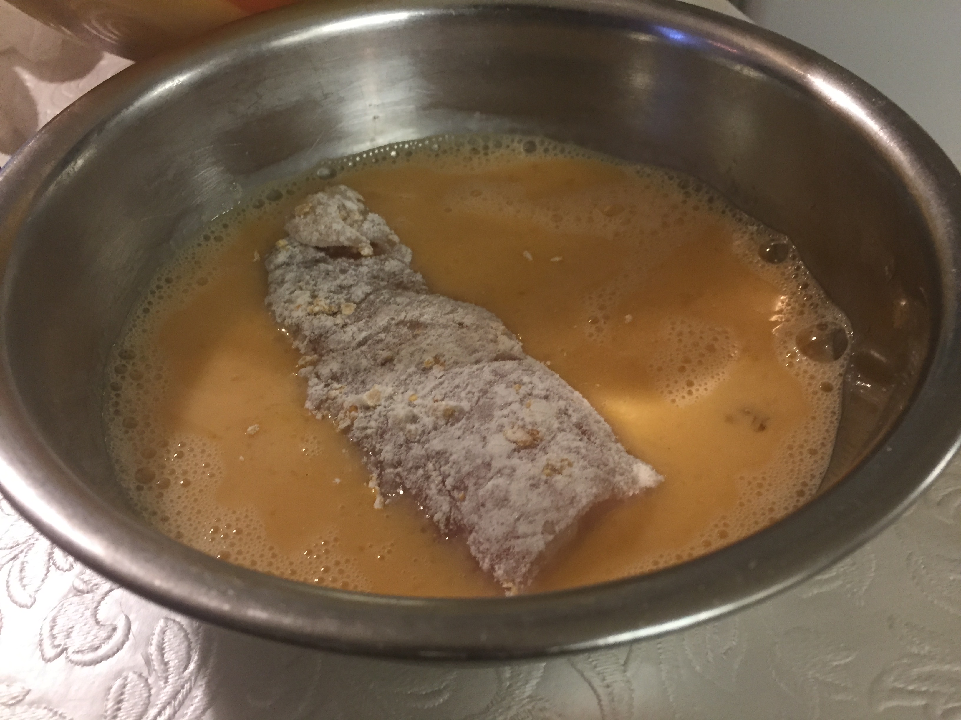Working one at a time, coat fish in flour, then in egg, and then in flourmixture again to coat.