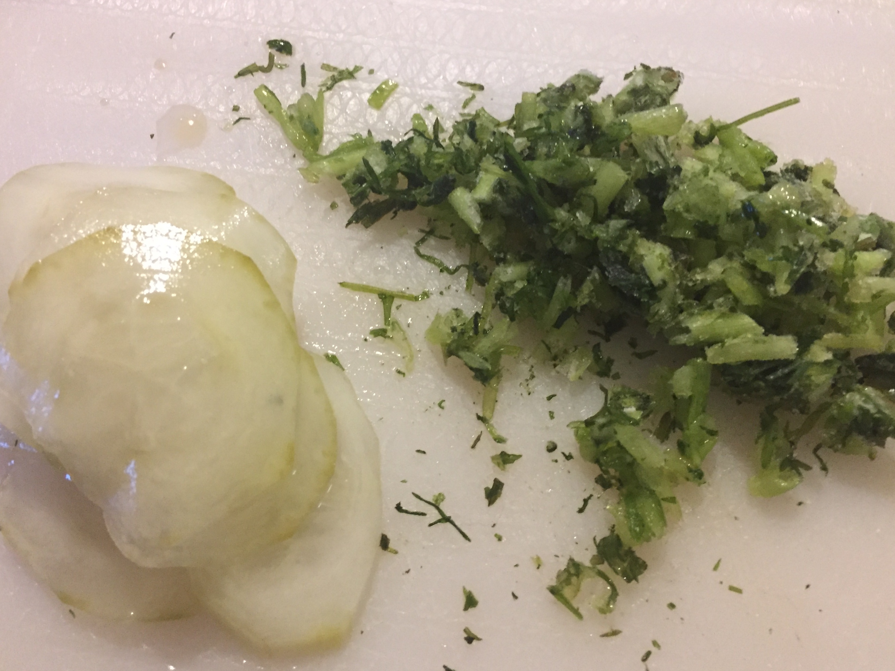 Prep the ingredients – finely dice the shallots, mini pickles, and capers.