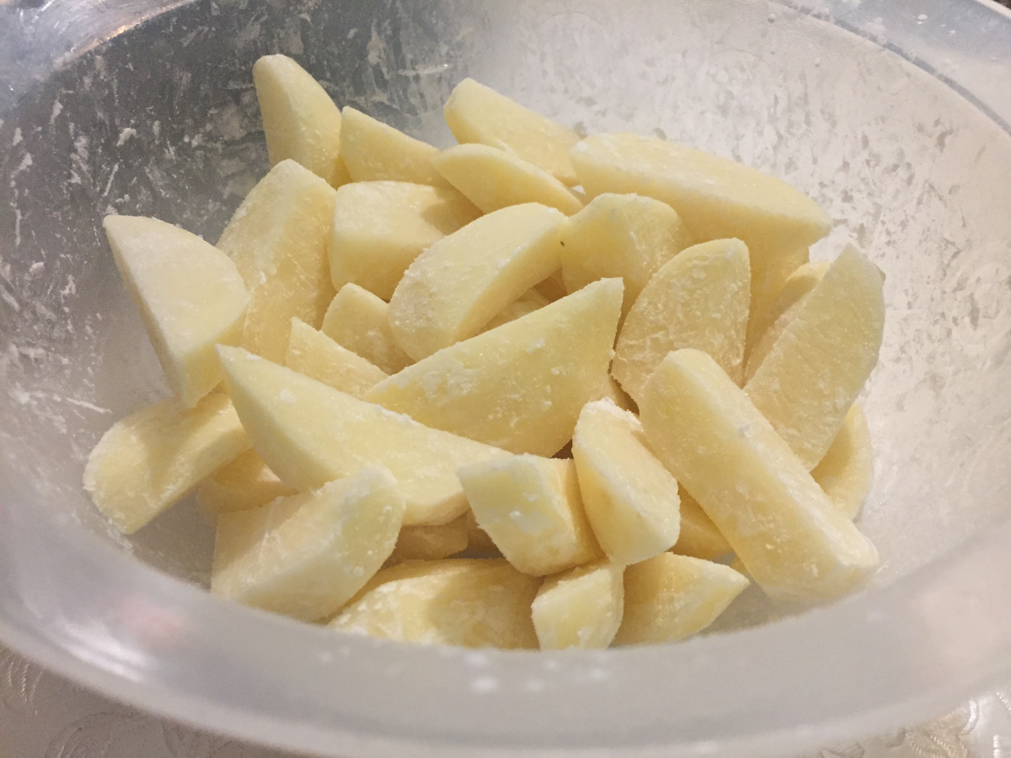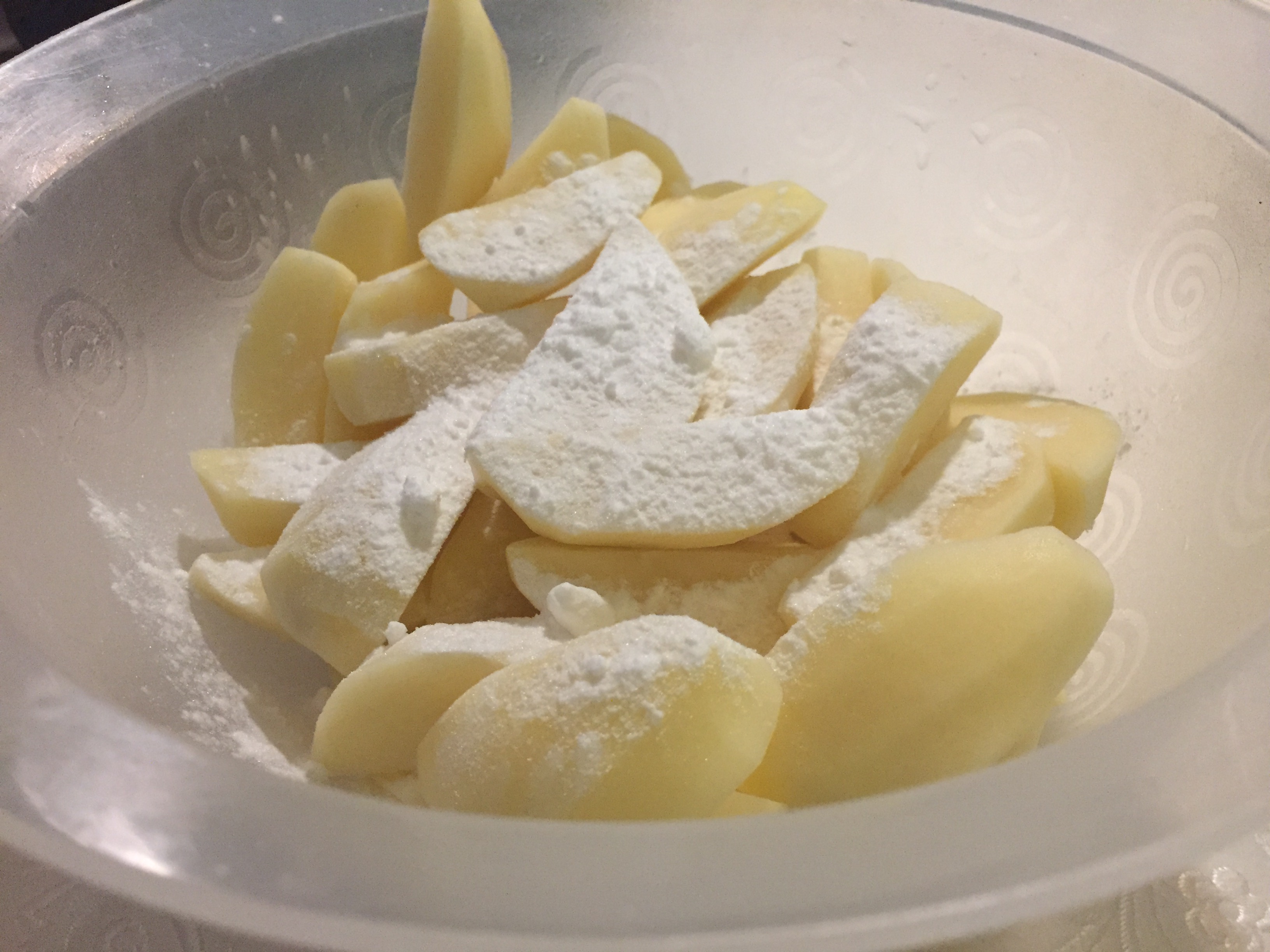 Toss the pototaes in the cornstarch or potatoestarch in a bowl.