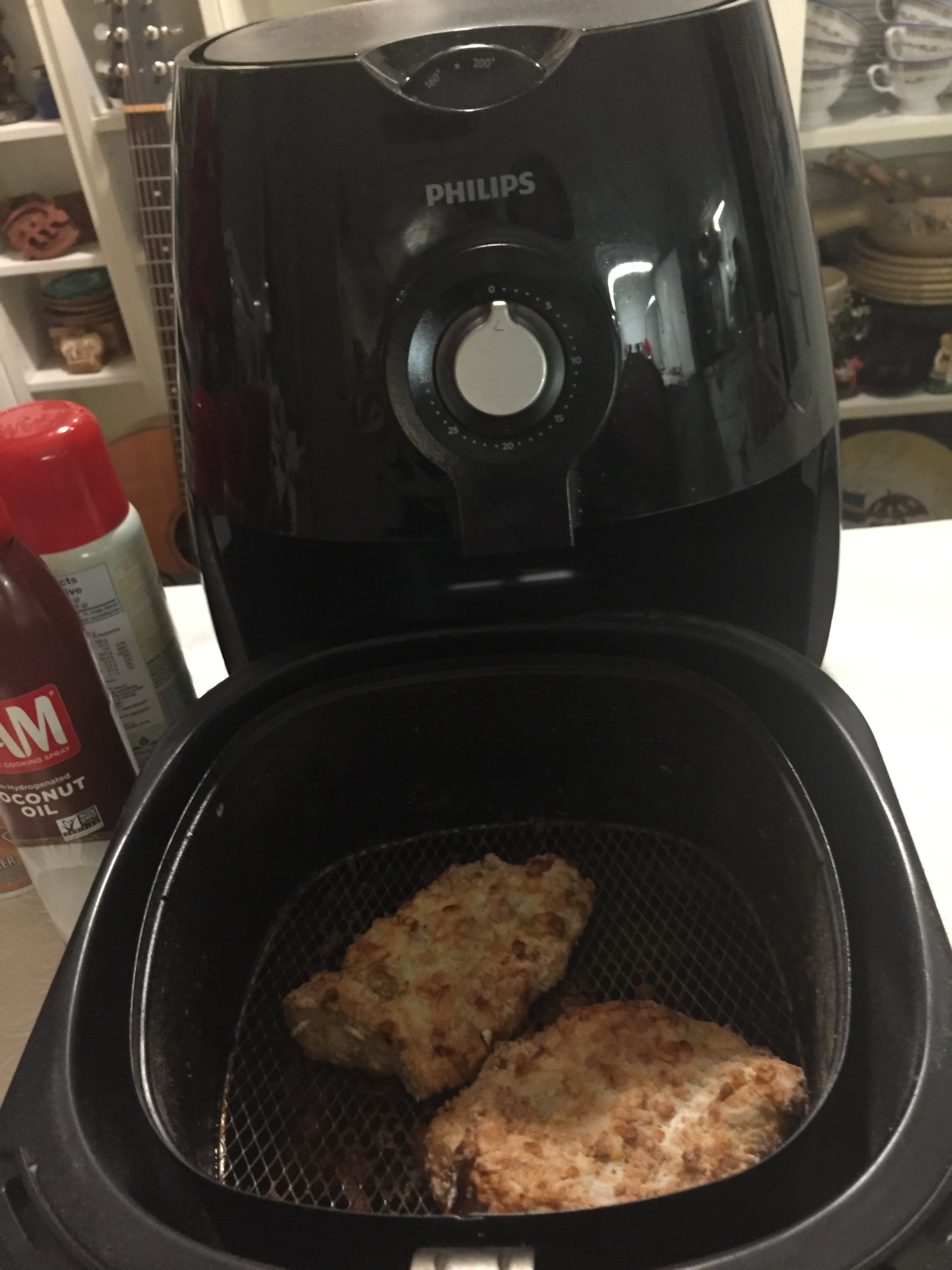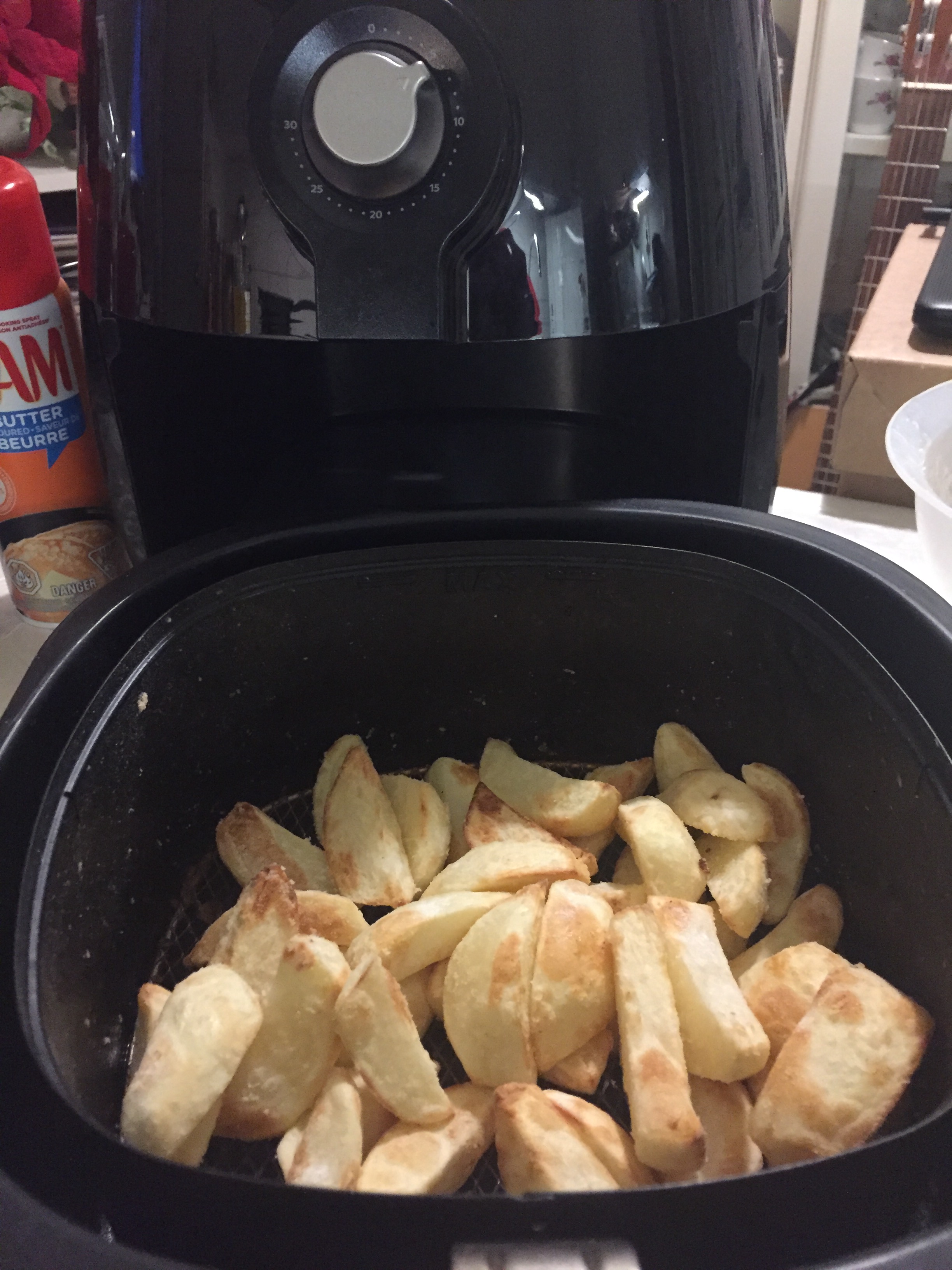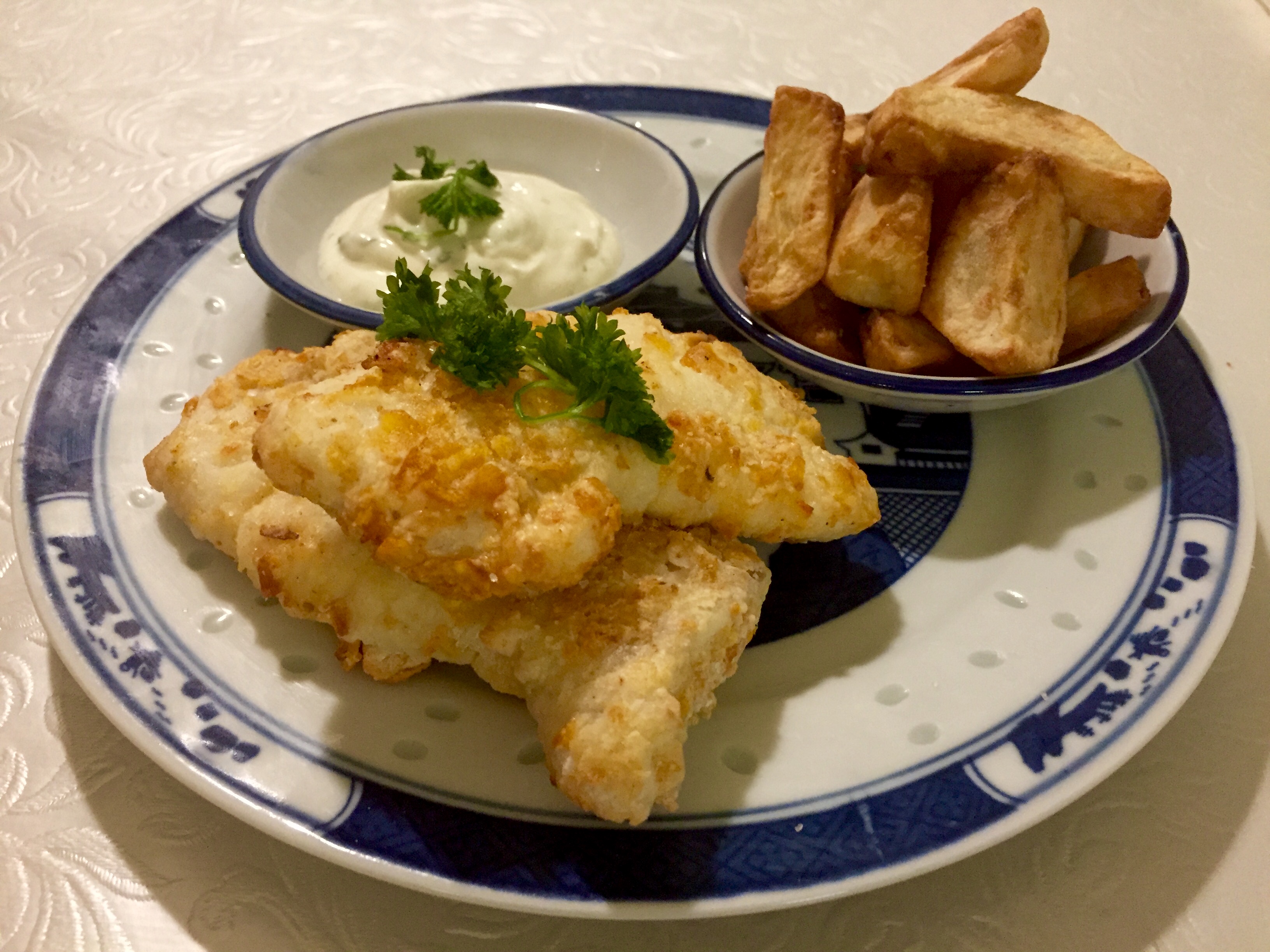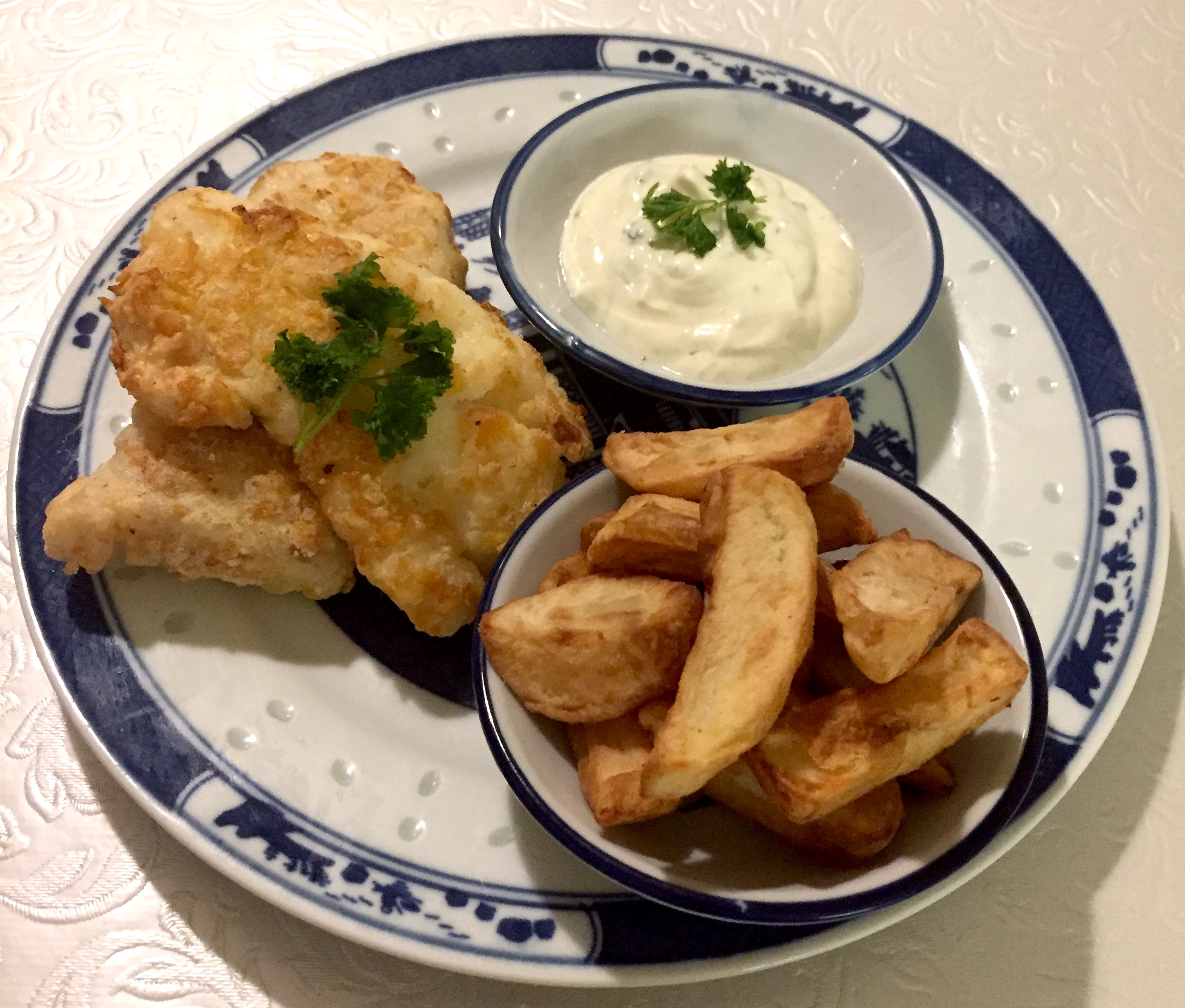 I have been experimenting with the Airfryer. Pollock and potatoes turned into crispy Fish And Chips without any greasy oil. A light dipping sauce with Youghurt, pickled cucumber and parsley.