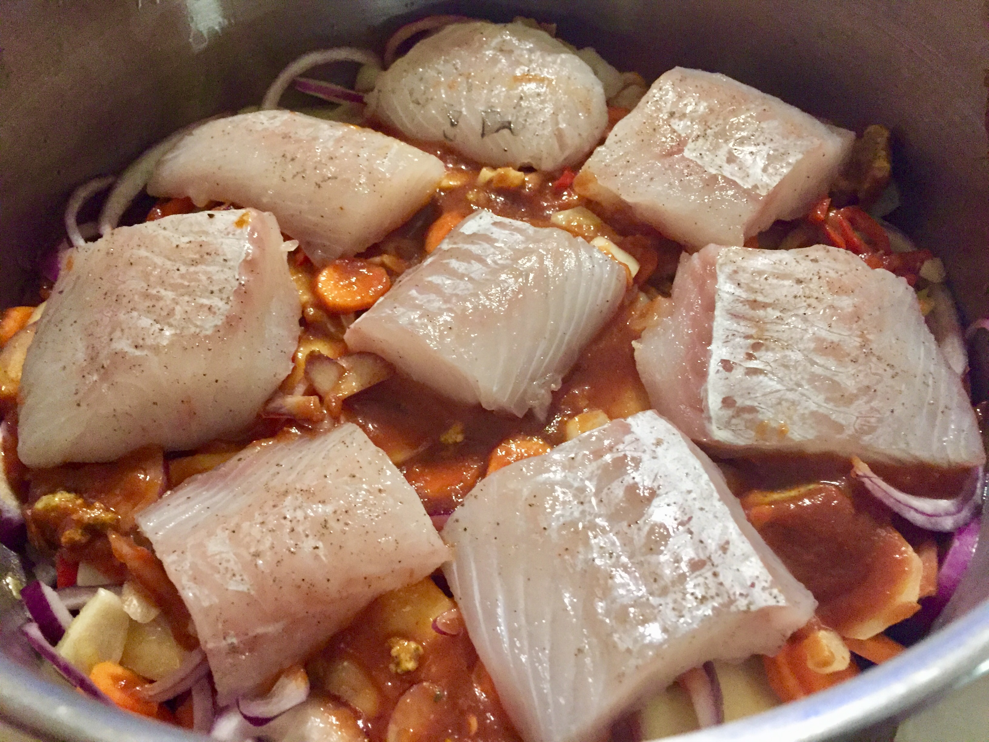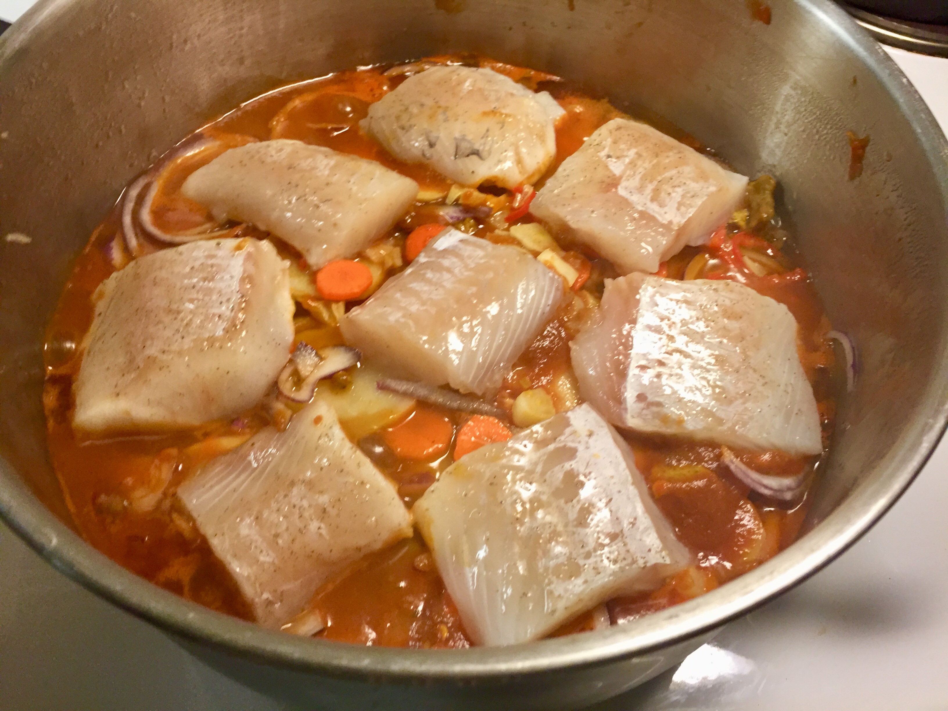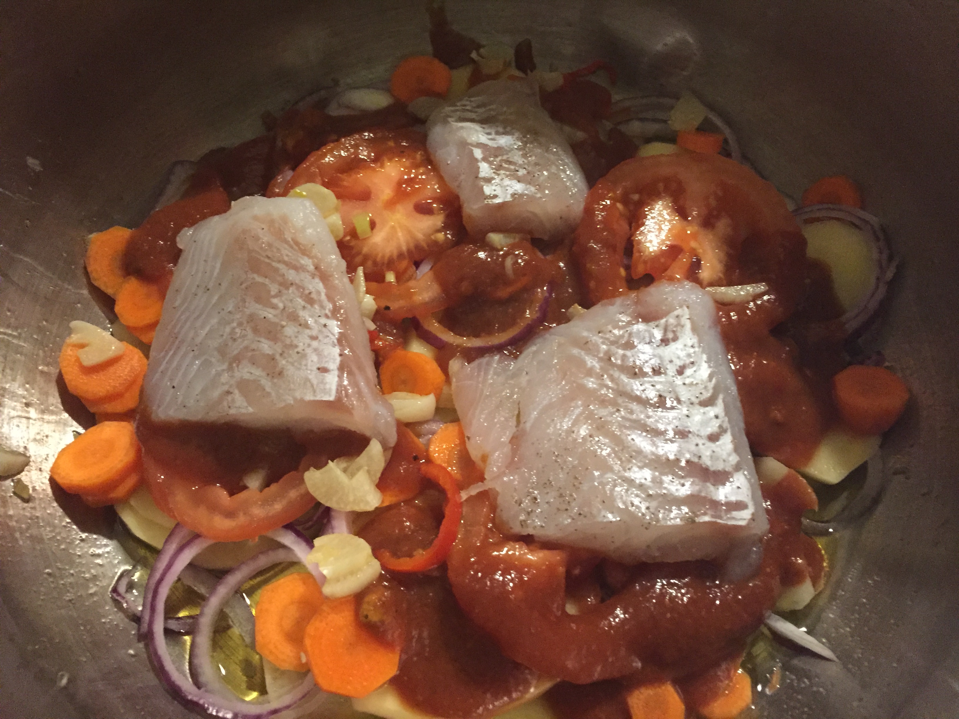 Top with the peppers and stoneless olives (I didn´t have olives so therefore I did omit it from the ingredients list, however it is traditional to use) and the last olive oil. I also chose to add one layer of fish on the top that was not totally covered in sauce. Stick in the cinnamon stick and bay leaves. After you have layered the pot place it back on the heat and put a lid on. Do not stir or touch the pot. You do not want it to get mushy and break the potatoes and fishcubes.