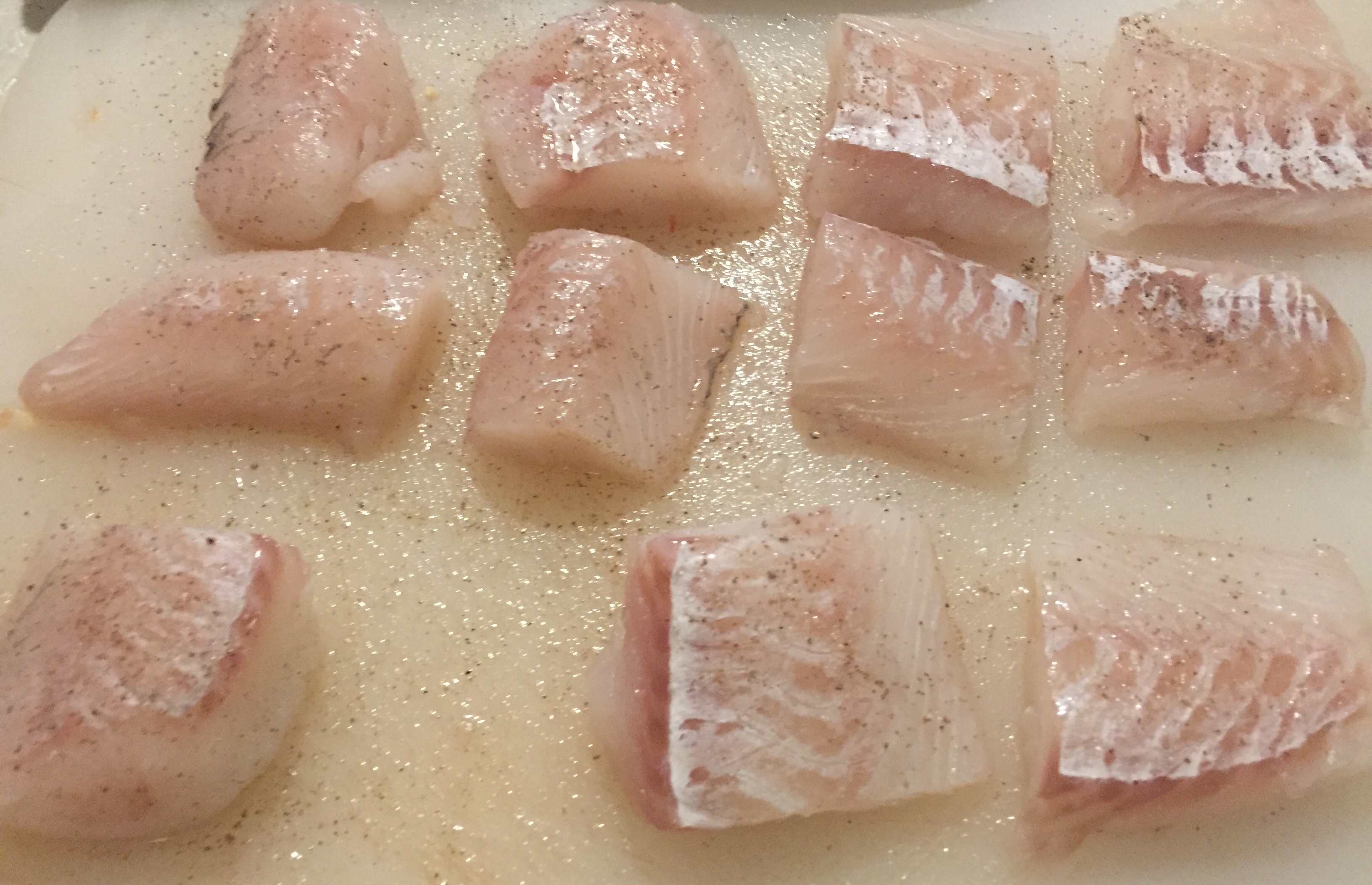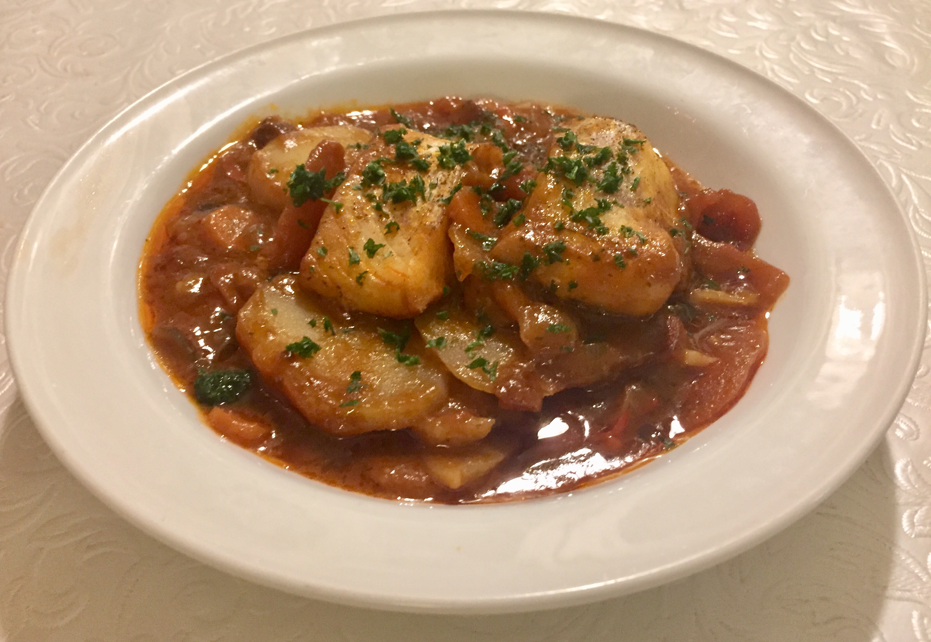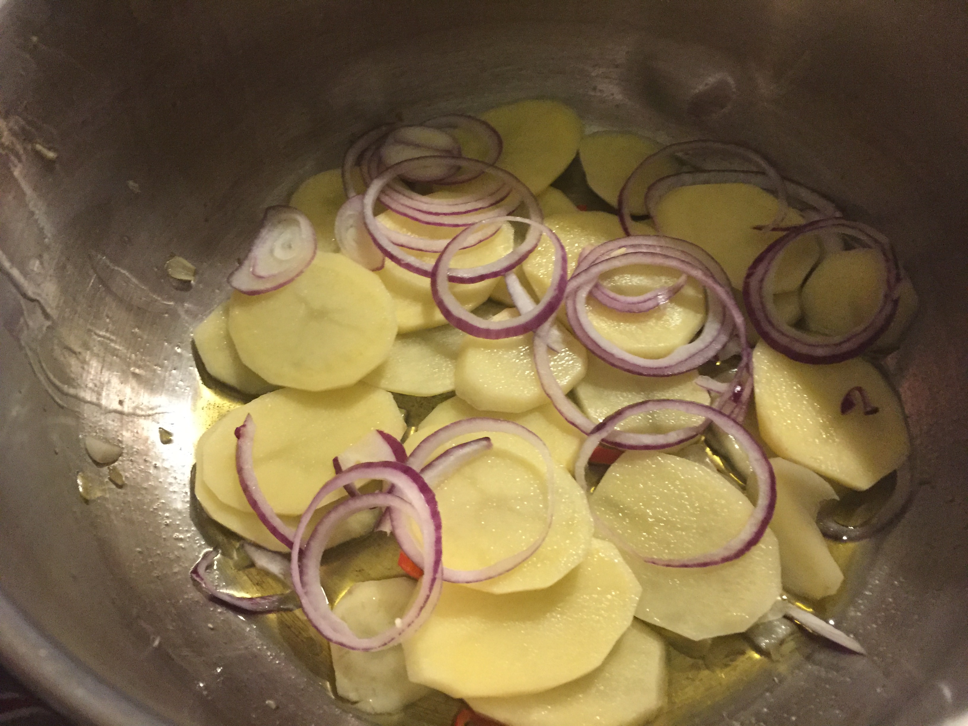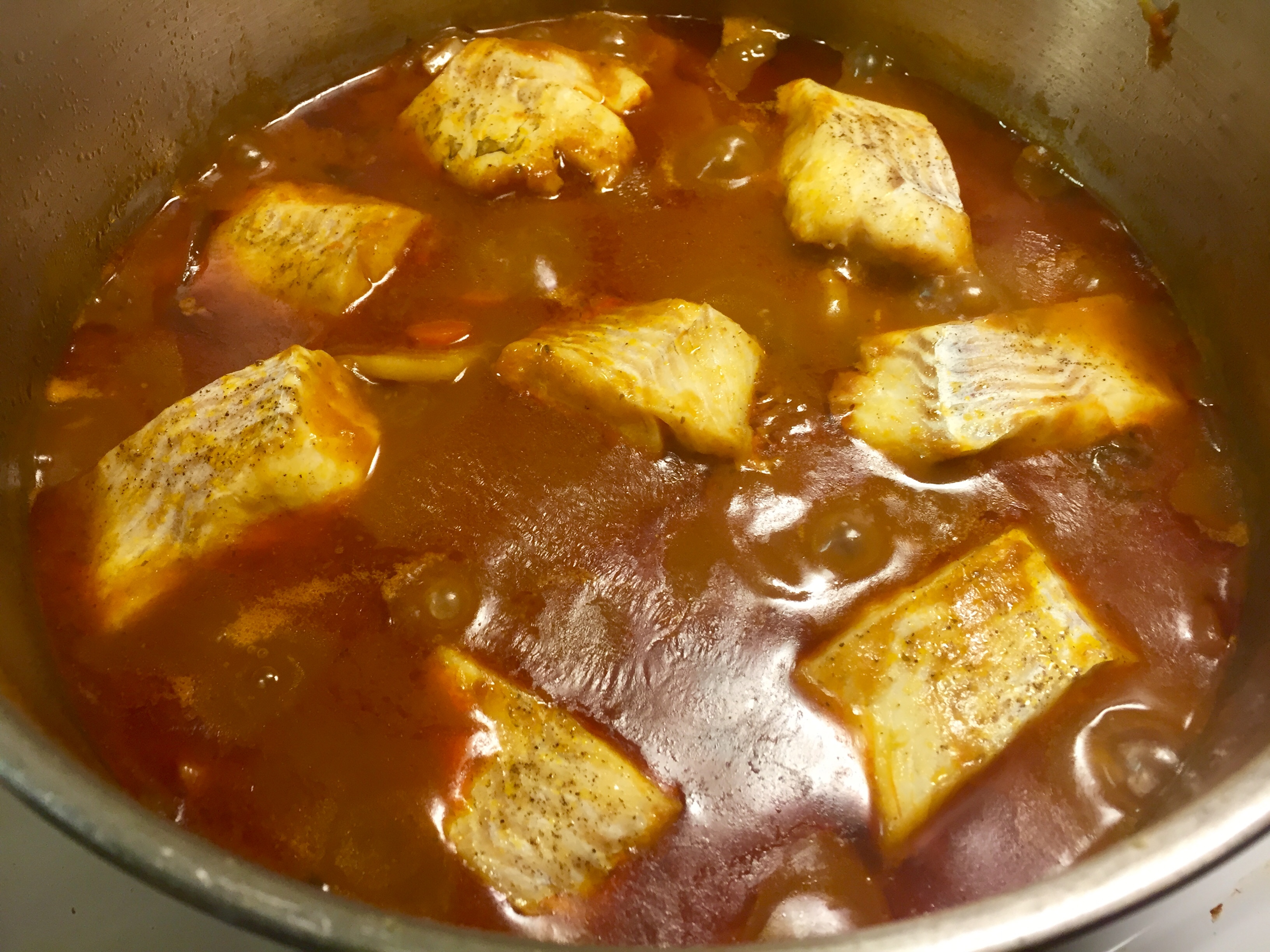 Top with the peppers and stoneless olives (I didn´t have olives so therefore I did omit it from the ingredients list, however it is traditional to use) and the last olive oil. I also chose to add one layer of fish on the top that was not totally covered in sauce. Stick in the cinnamon stick and bay leaves. After you have layered the pot place it back on the heat and put a lid on. Do not stir or touch the pot. You do not want it to get mushy and break the potatoes and fishcubes.