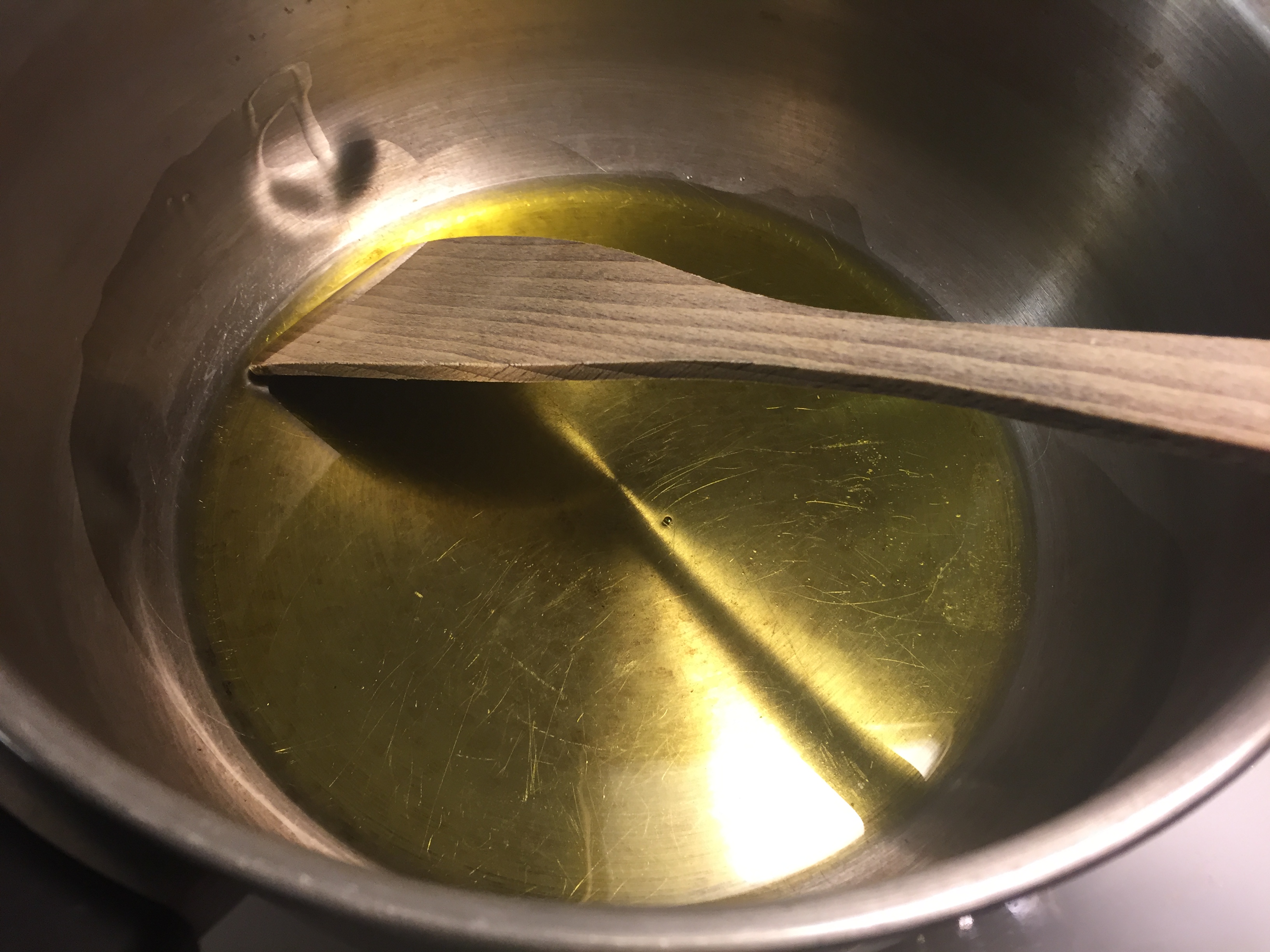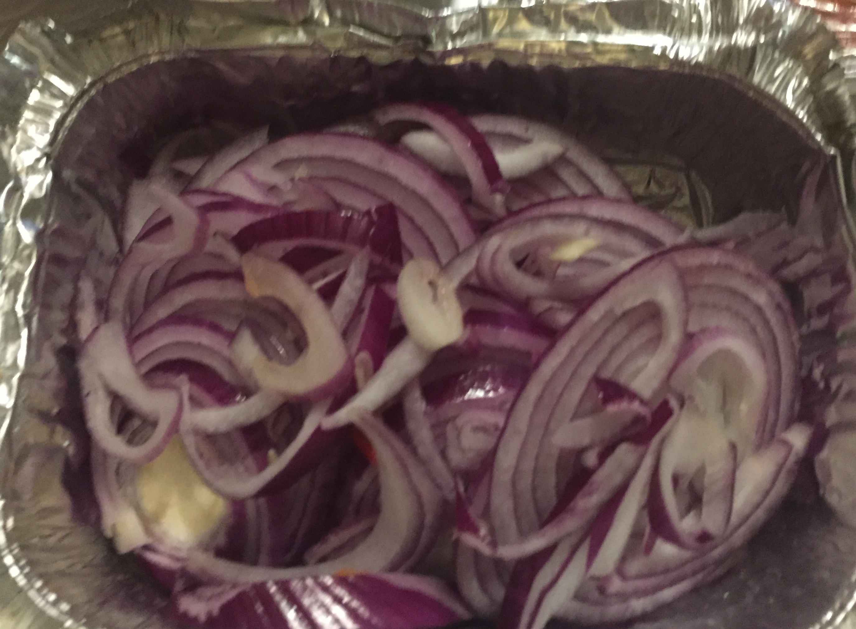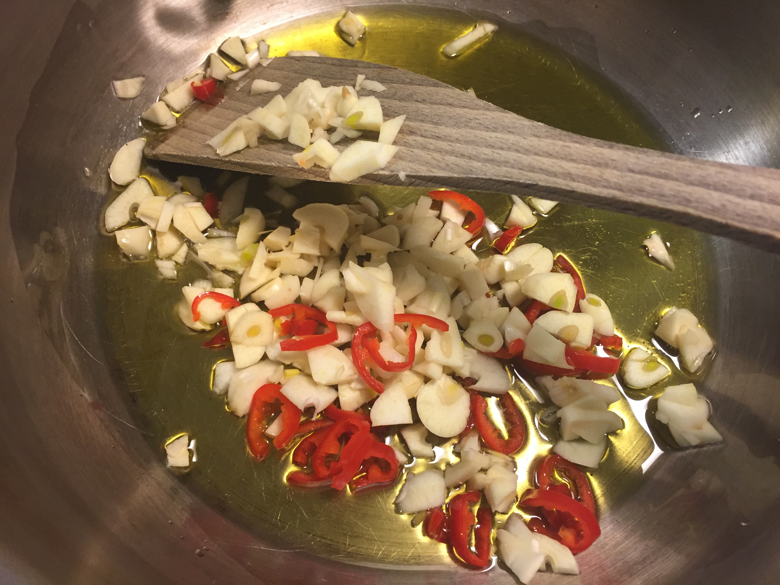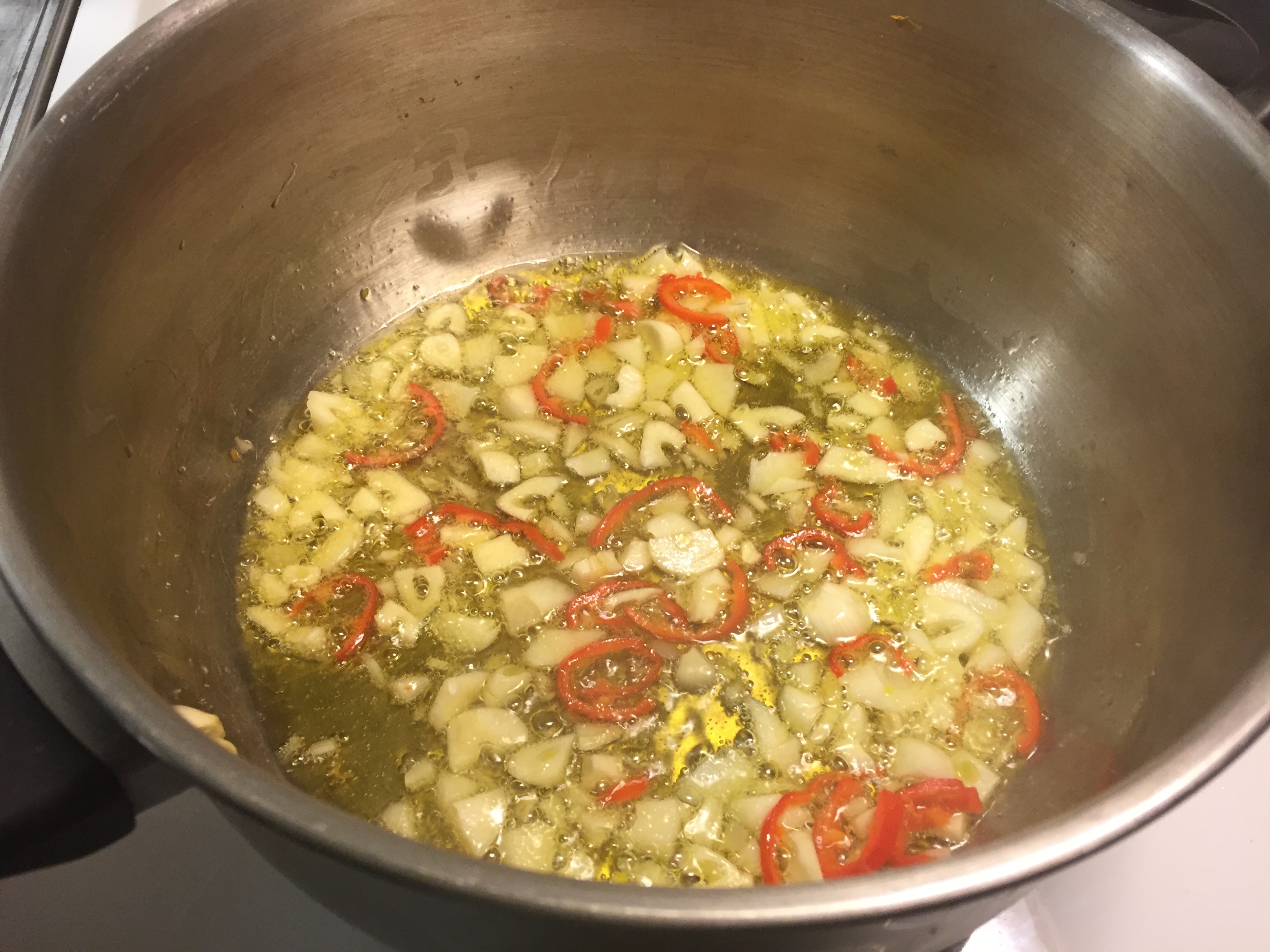 Chop pepper and garlic and sweat in the oil. Pick up most of the garlic and pepper and mix it into the sauce that you will add to each layer.