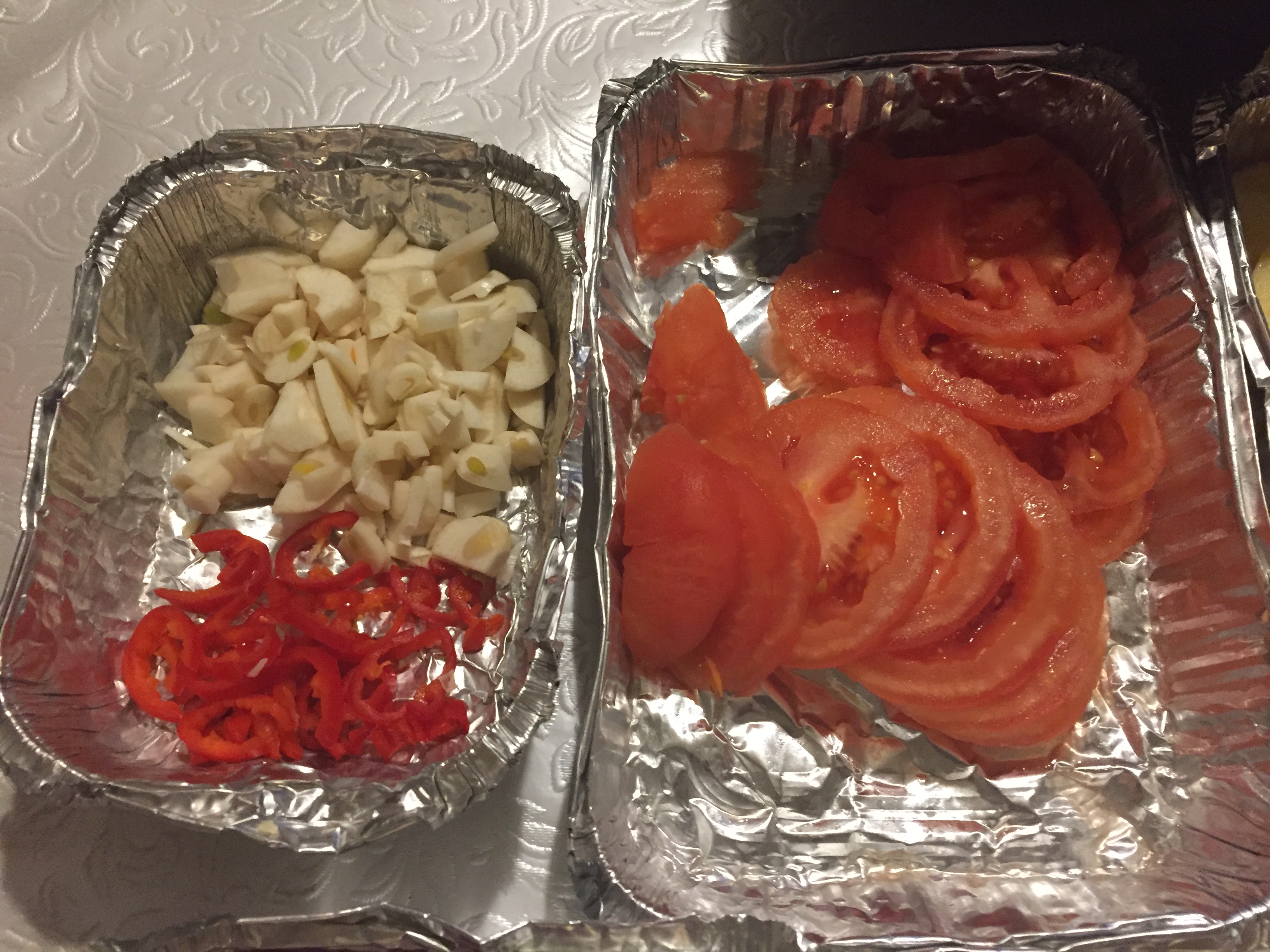 Layer with fish, onions, potatoes, tomatoes, carrots and tomatoe sauce. (It should be in layers just like lasagna).
