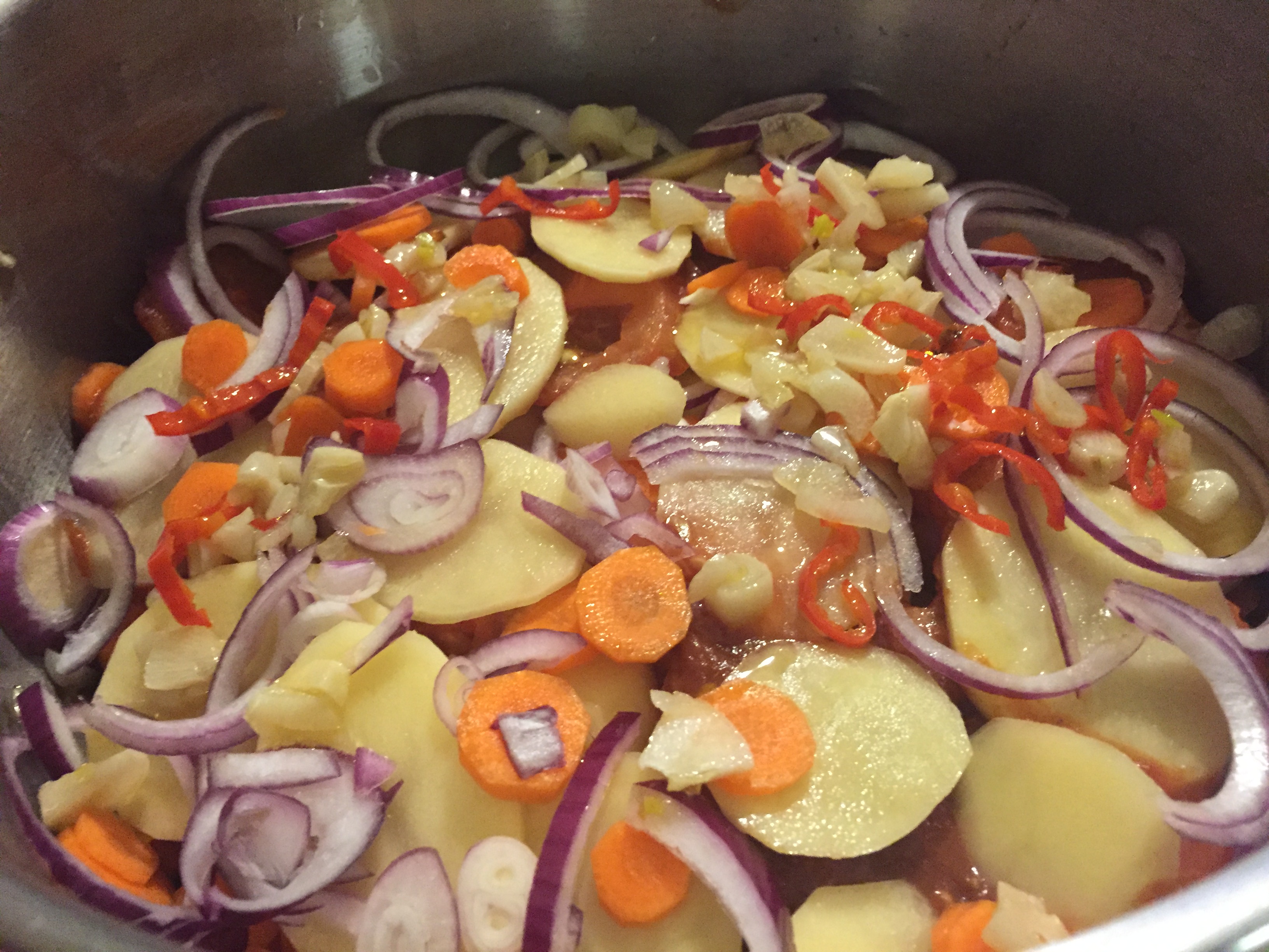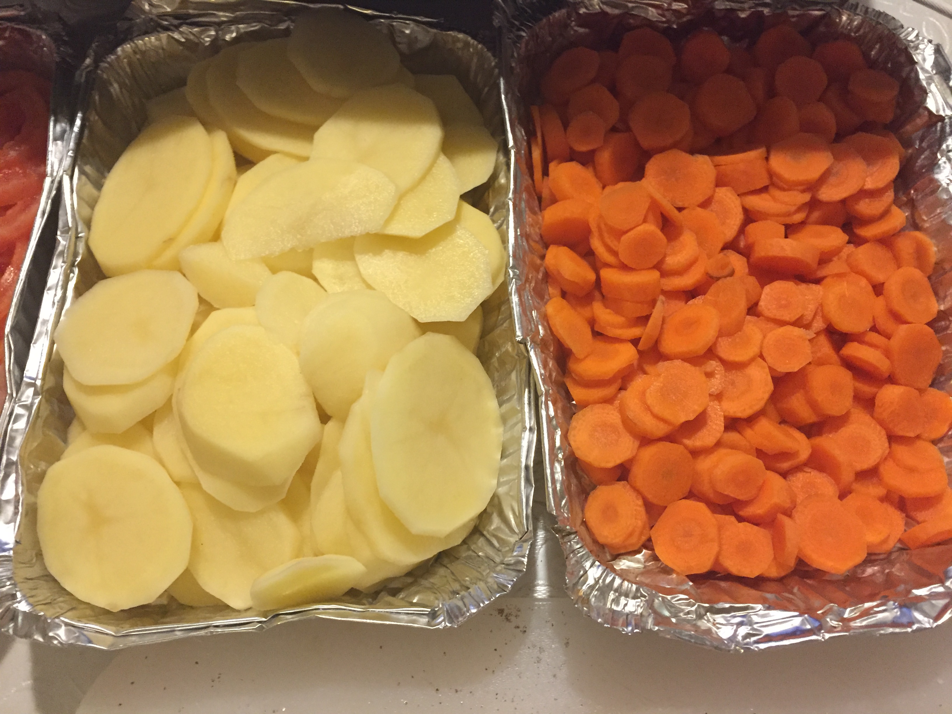 Cut tomatoes, potatoes, carrots, onions in slices.