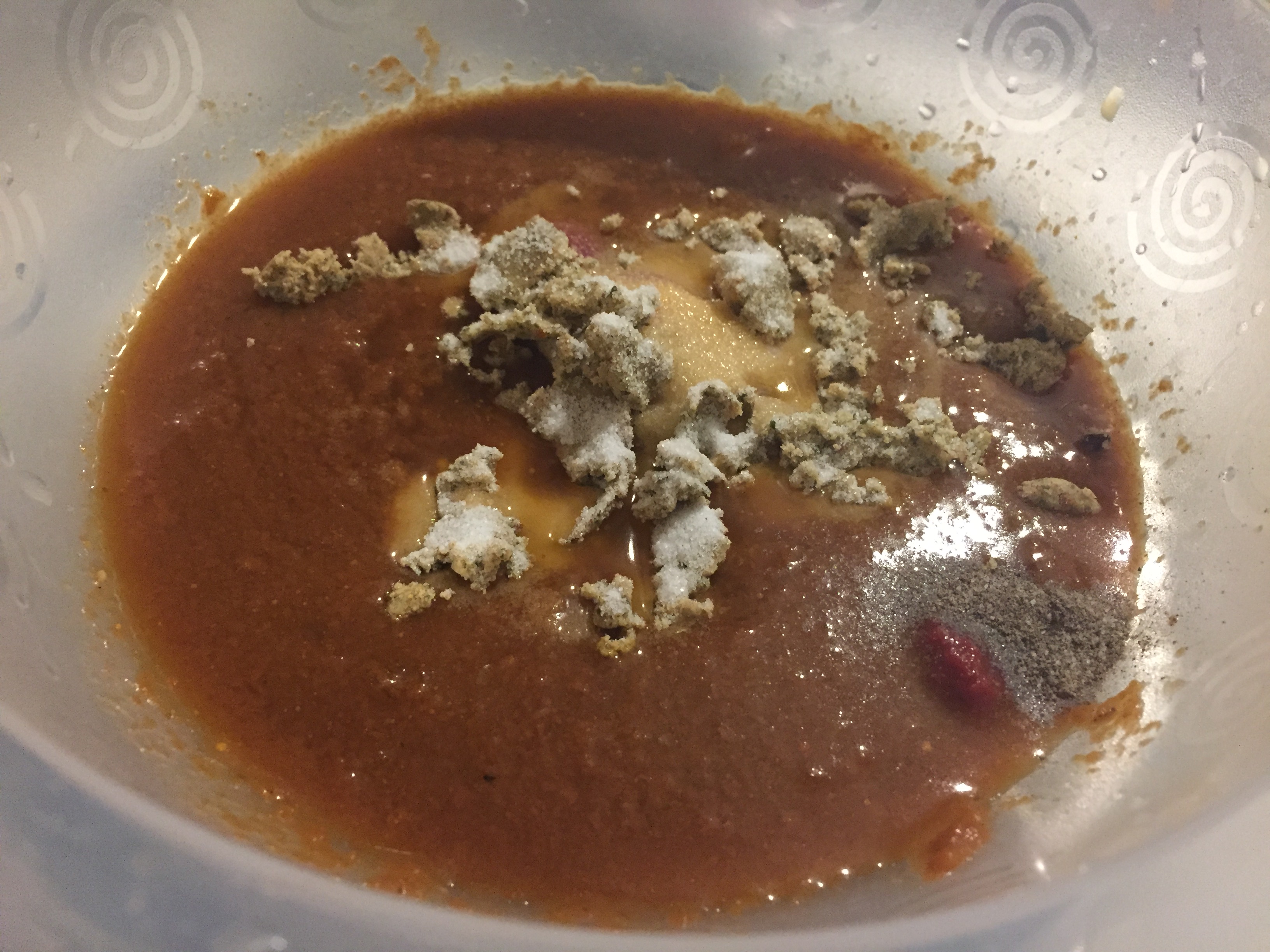 Mix crushed tomatoes or tomato soup with the salt, pepper, sweated garlic and pepper, vegetable stock cubes, tomatoe puré.