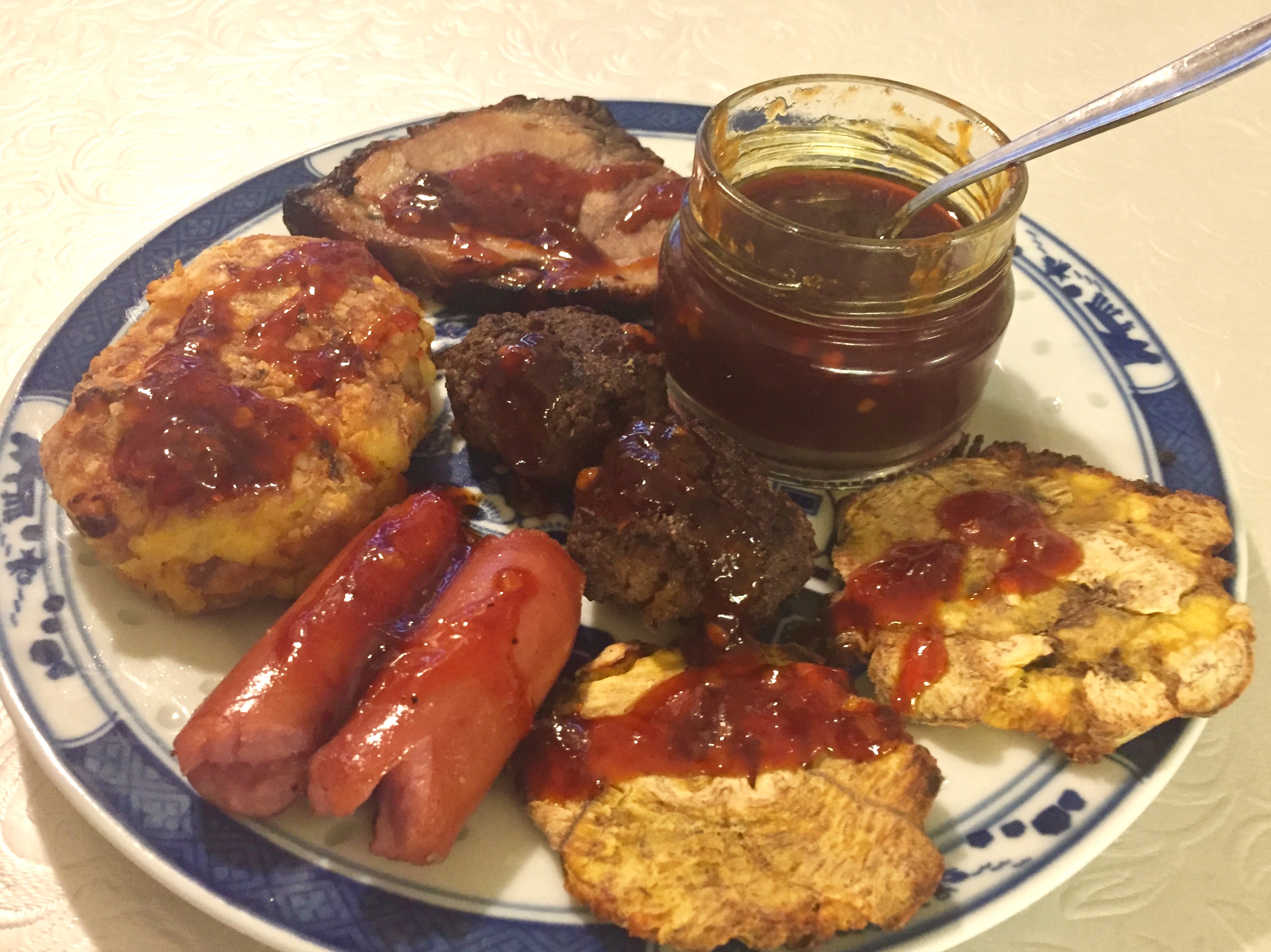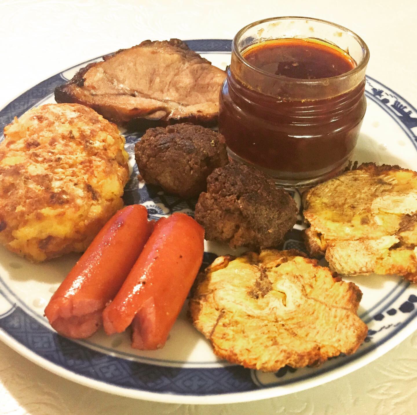 Tonight I mixed some traditional foodstuffs from many cultures on my plate. Fried Plantain like they are done in Haiti. However I do not have a Plantain Press like there so I used a Tacopress like in the Mexican kitchen. I also made Mashed Rutabaga Dippers. Rutabaga is used in a variety of ways in Sweden and Norway. I had some Mashed Rutabaga leftover from dinner the other night. I never made Dippers before. It really turned out great. I also had some Swedish Meatballs I made for Christmas, some slices Beefsteak and a special Swedish sausage named ”Prinskorv”. I had some Hot Sauce in the freezer which I made some time ago when making Buffalo Chicken Wings. A quite International plate that tasted so great. I made all in the airfryer. I love I can fry now and no greasy oil, just a little spray.