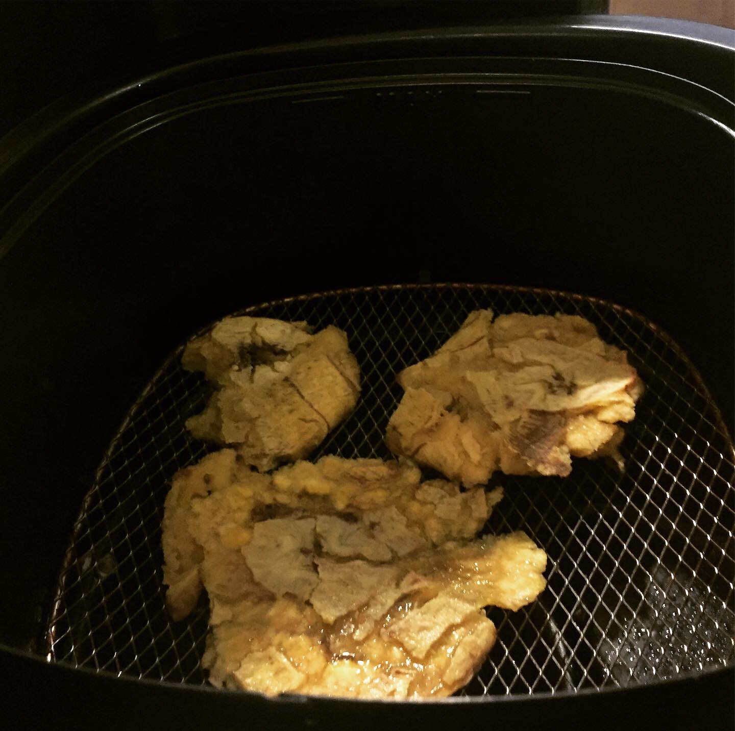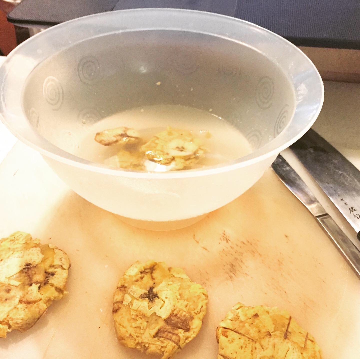 Soak the flattened plantains in the hot water and place carefully back in the airfryer or oil for an additional 5 min.