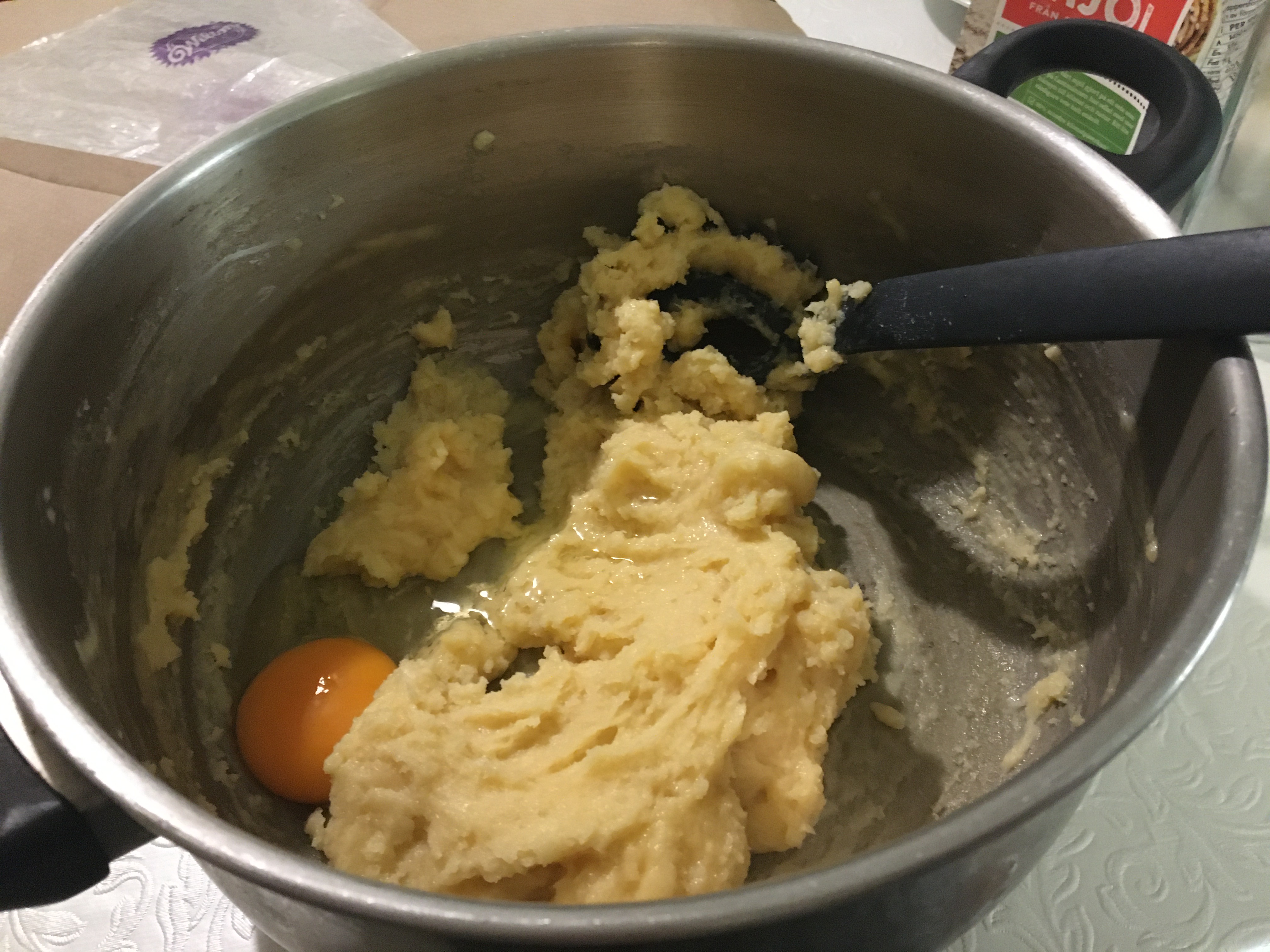 Add the eggs one at a time while all the time whisking.
