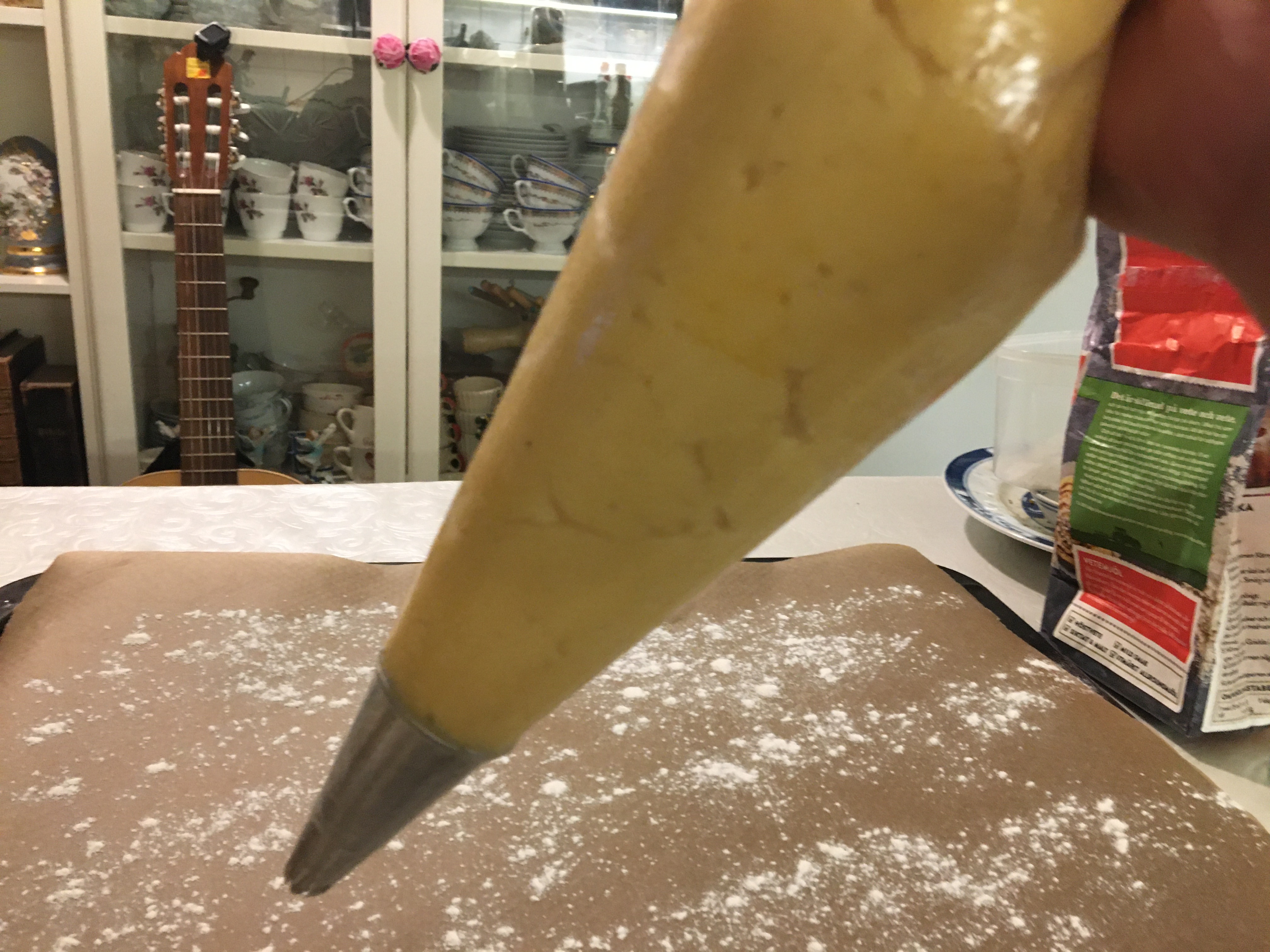 Fill a piping bag with the dough and pipe the dough on a tray covered with a floured baking sheet.