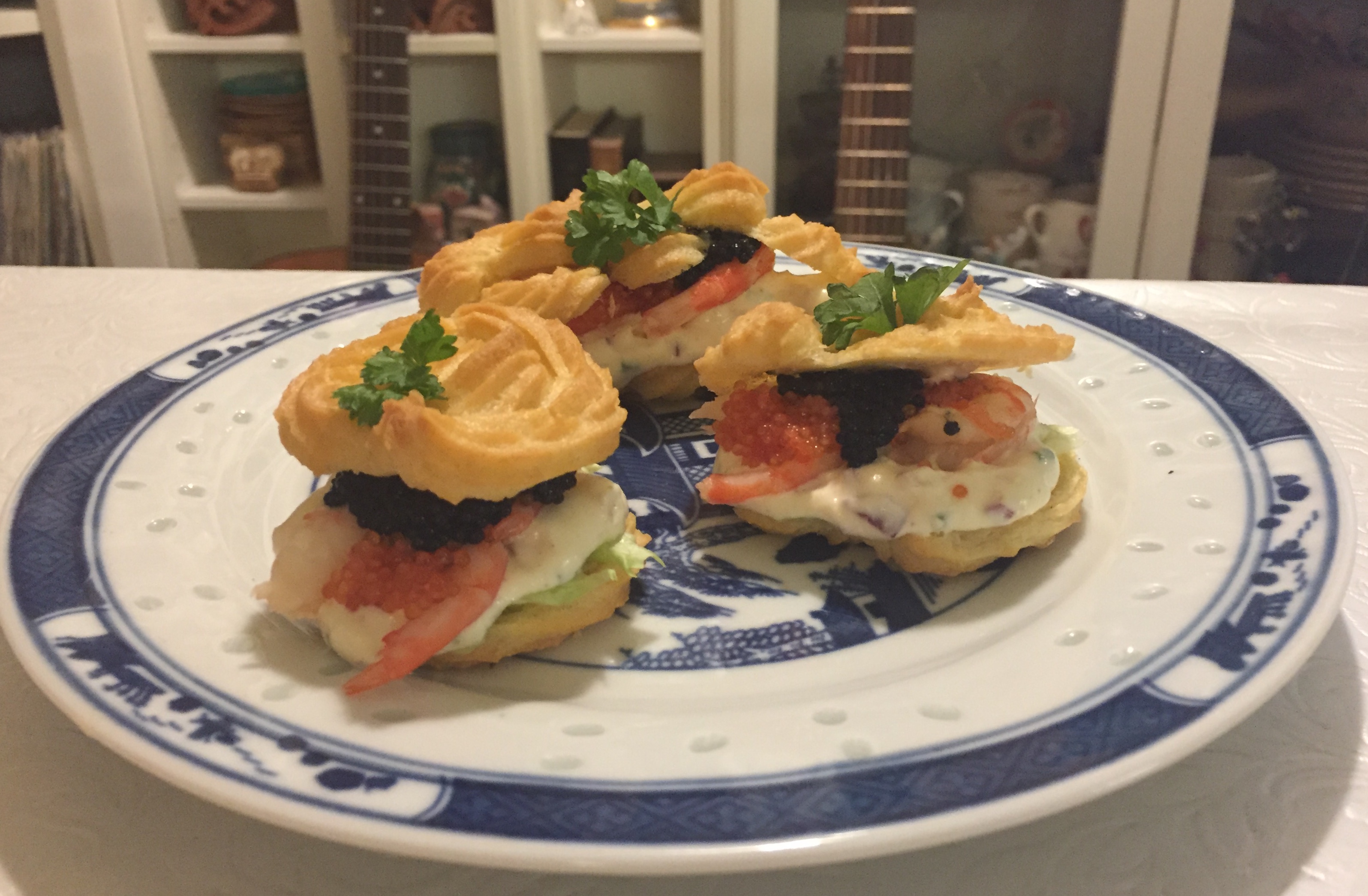 The other night I made Norwegian Vannbakkels (Petit Choux) with Savory filling made from shrimps, red onion, caviar, Youghurt, mayonnaise , Mustard, salt and pepper.