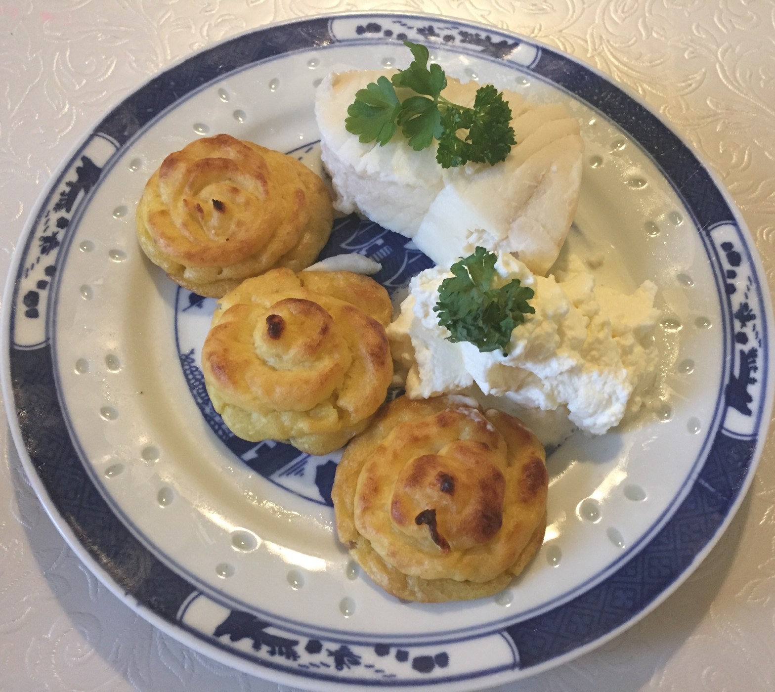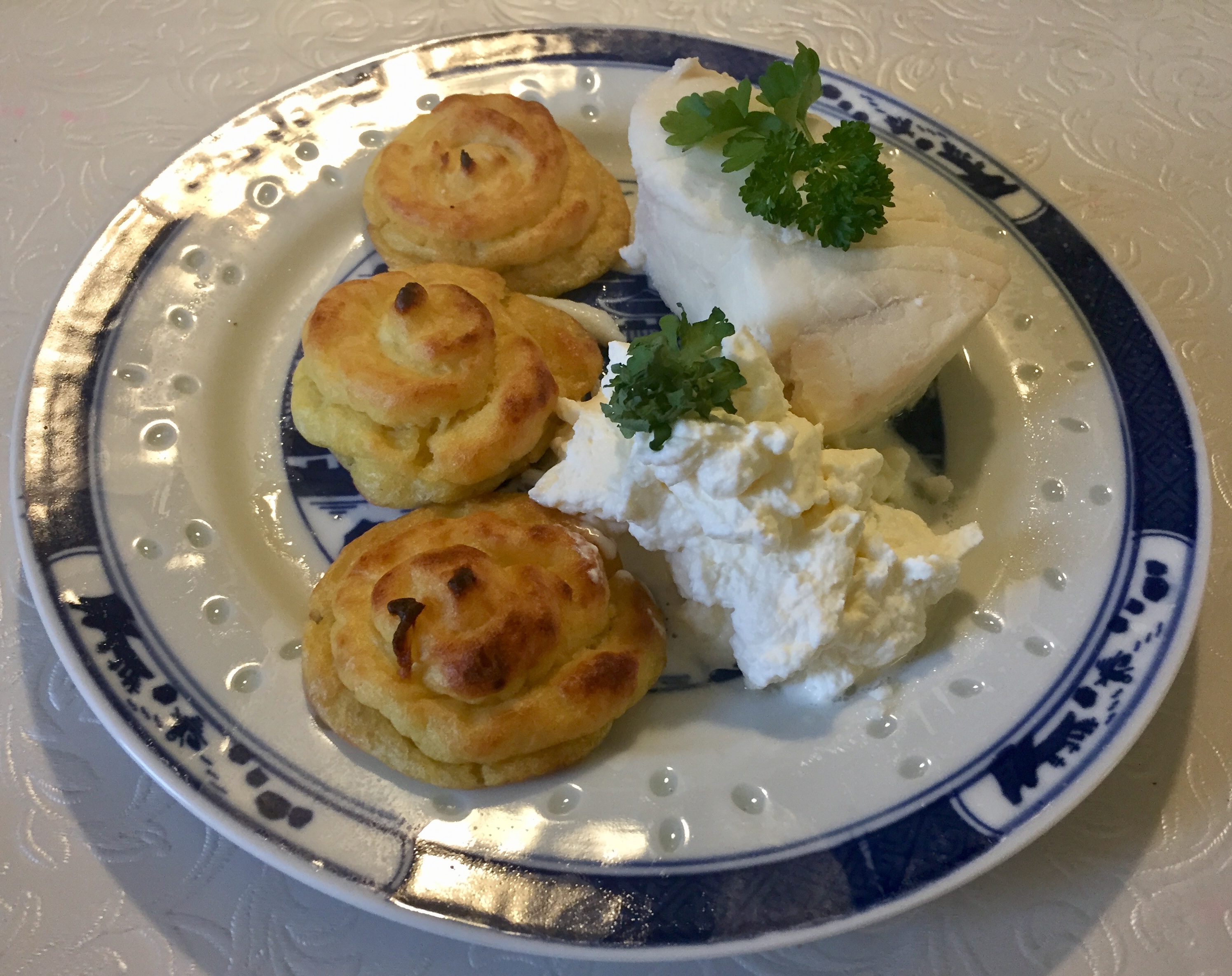 This fish called Kveite in Norwegian my mother used to make for special occations like the first Day of Christmas or New Years Day. It was my favorite dish and we did not eat this more than a couple times a year during special Holidays. She used to boil it in a special way and serve it cold with hot potatoes, vegetables and sour cream that she made with whipped cream, vinegar and a pinch of sugar. The fish was always served as whole steaks and she would decorate the serving tray beautifully. I made it like my mom used to before and have posted the recipe on my website here. Today I made it with Pommes Duchesse.