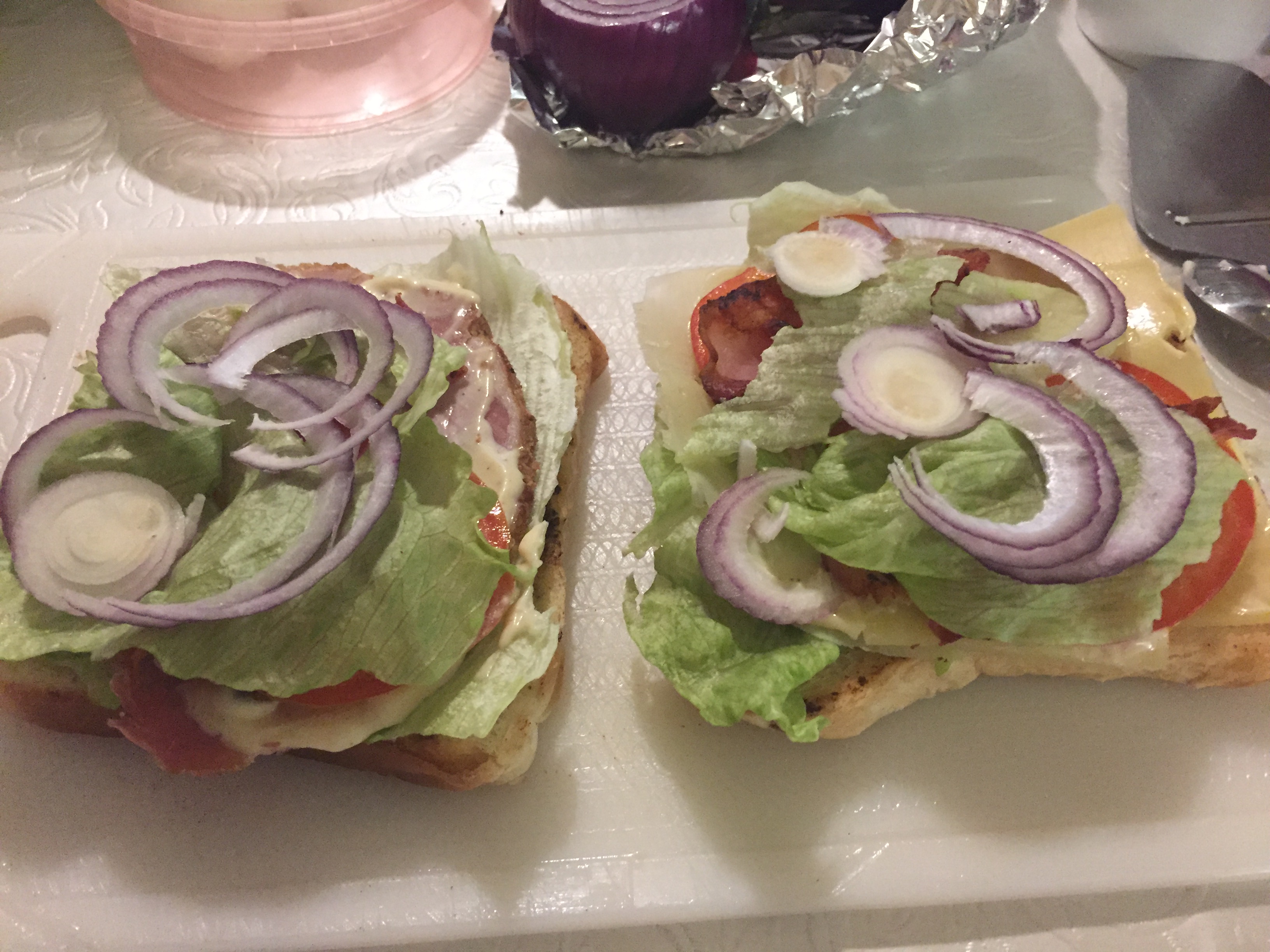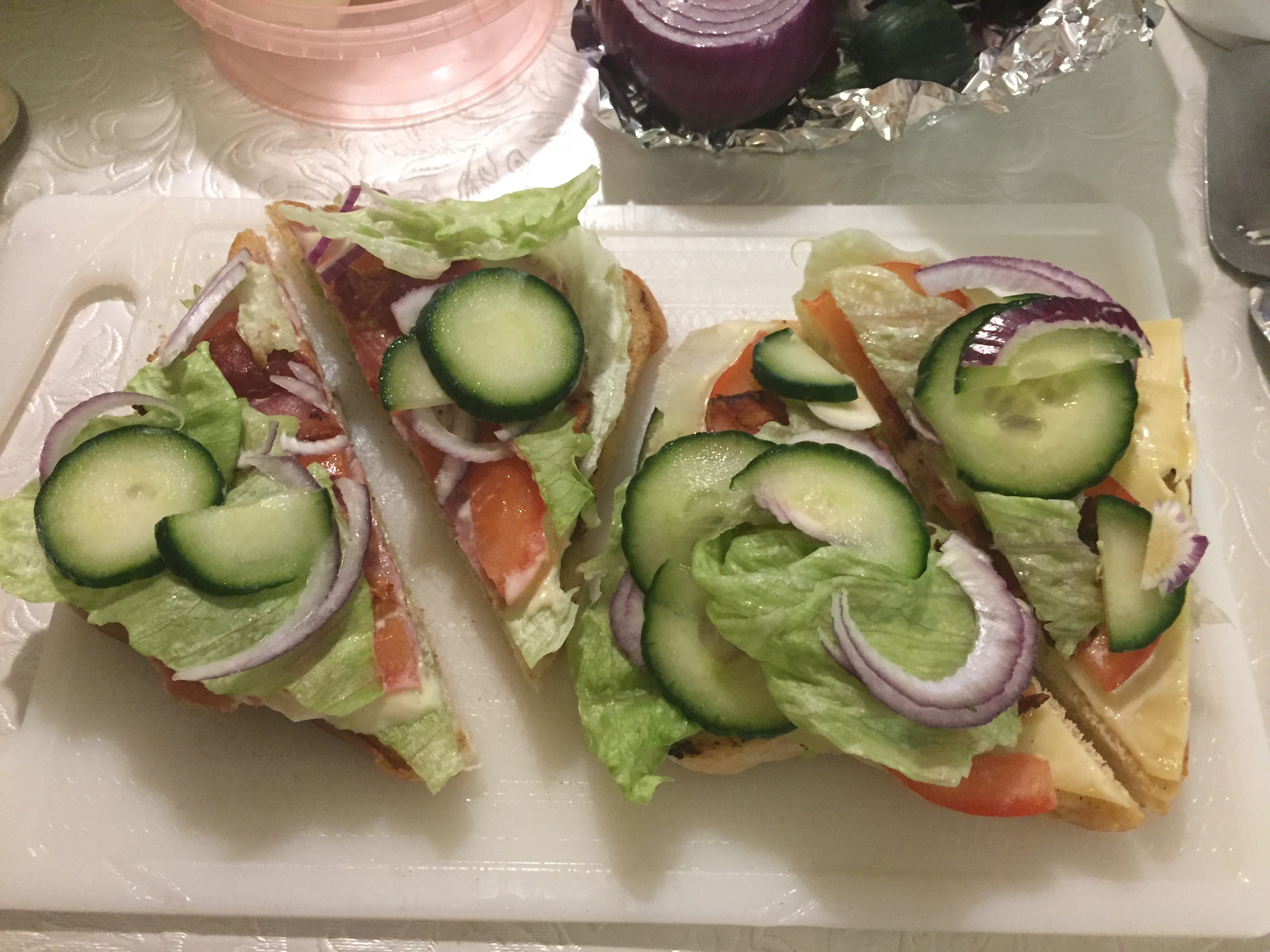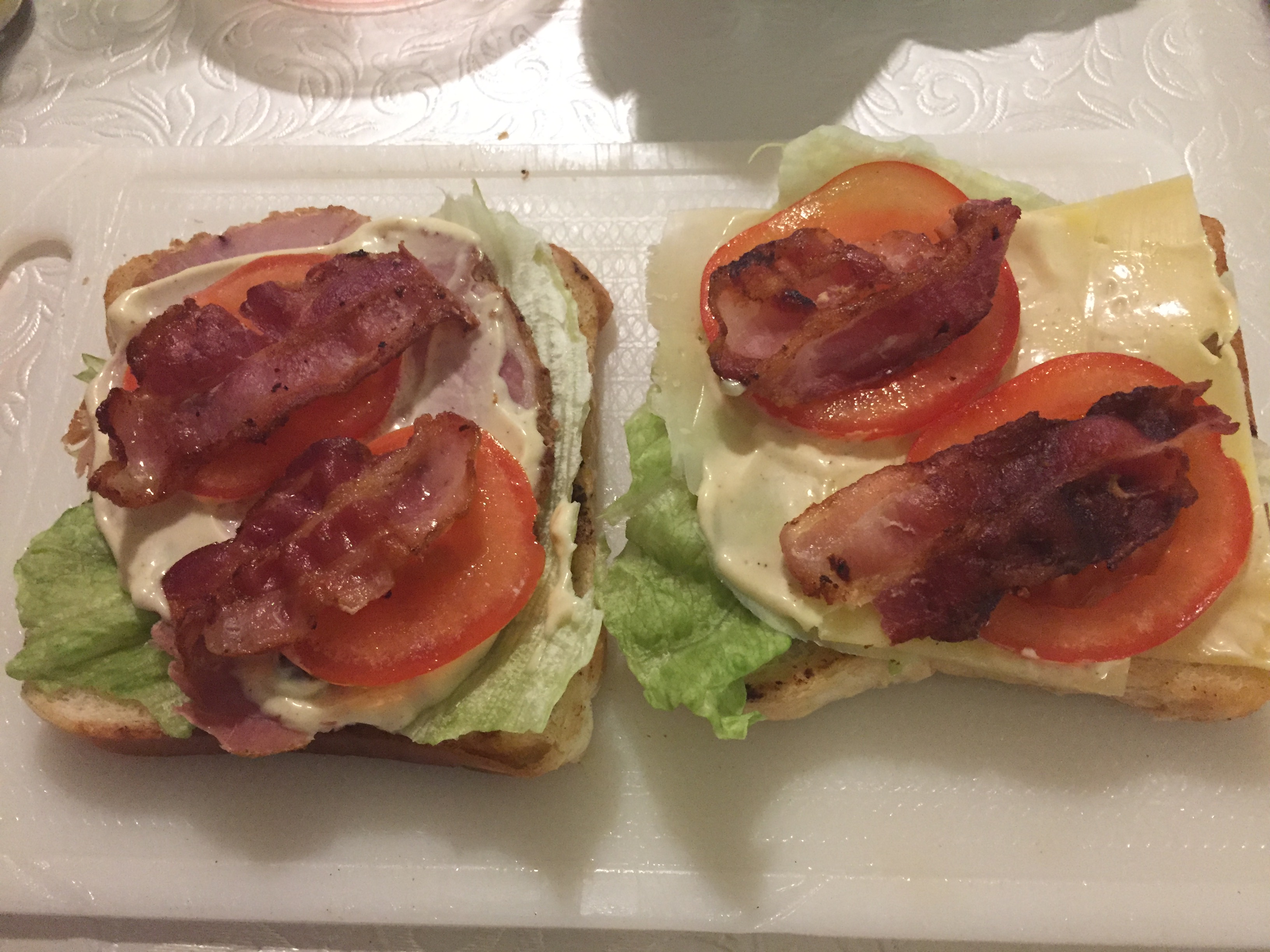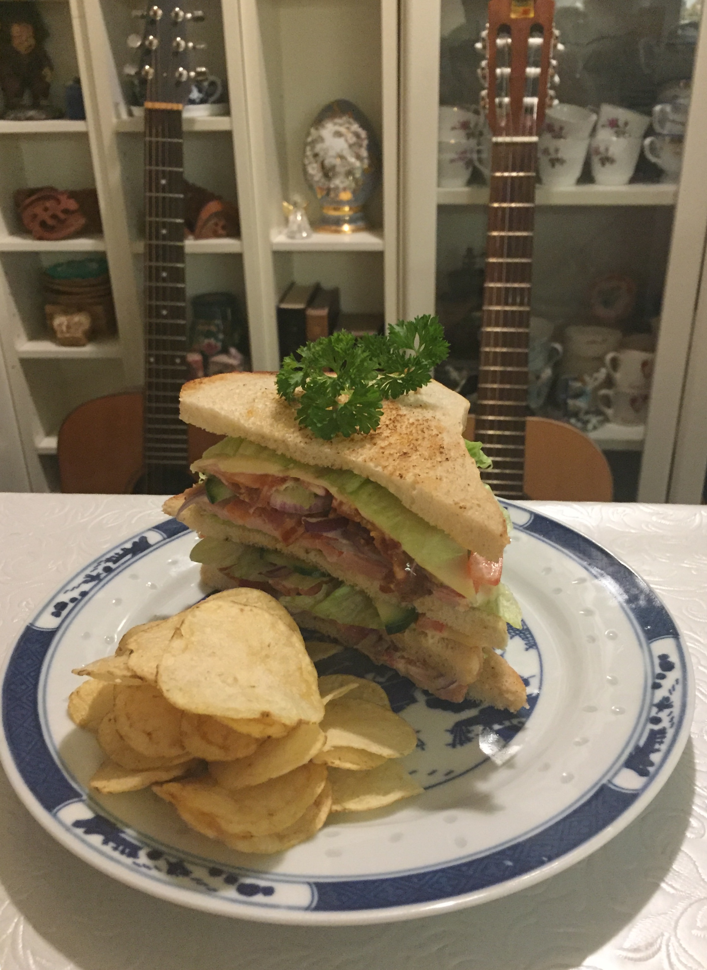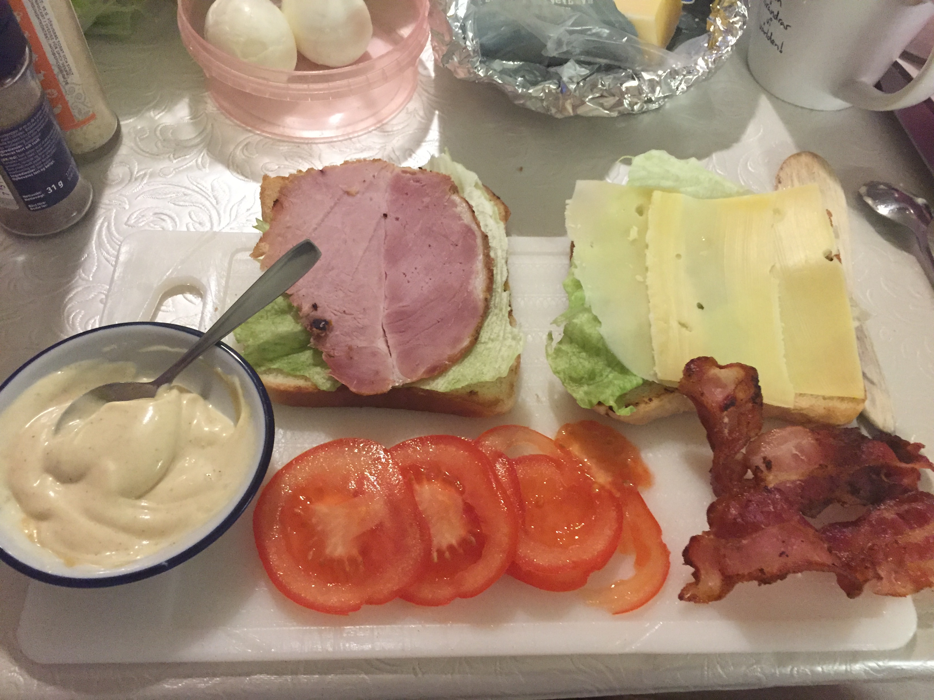 Sliced ham (or other meat). Lightly salt and pepper it. Toast the bread slices and edge cut if you like them to be the exakt same size. I didn’t do that. Fry the bacon slices. Slice the tomato. Peel and slice the red onion thinly. Slice cucumber. Mix mayonnaise, youghurt, mustard, sweet and sour sauce or hot sauce. Add salt and pepper to your taste. Spread butter on two of the breadslices. Place salad on the bread slices. Spread mayonnaisemix on top of the saladleaves. Wrap meat, bacon, cheese, tomato, cucumber and red onion. Place the bread slices on top of each other with the topping. Top with the a slice of bread. Stick a wooden skewer through all the layers to keep everything in place. Garnish with parsley. Serve with some potato chips or french fries if you like.