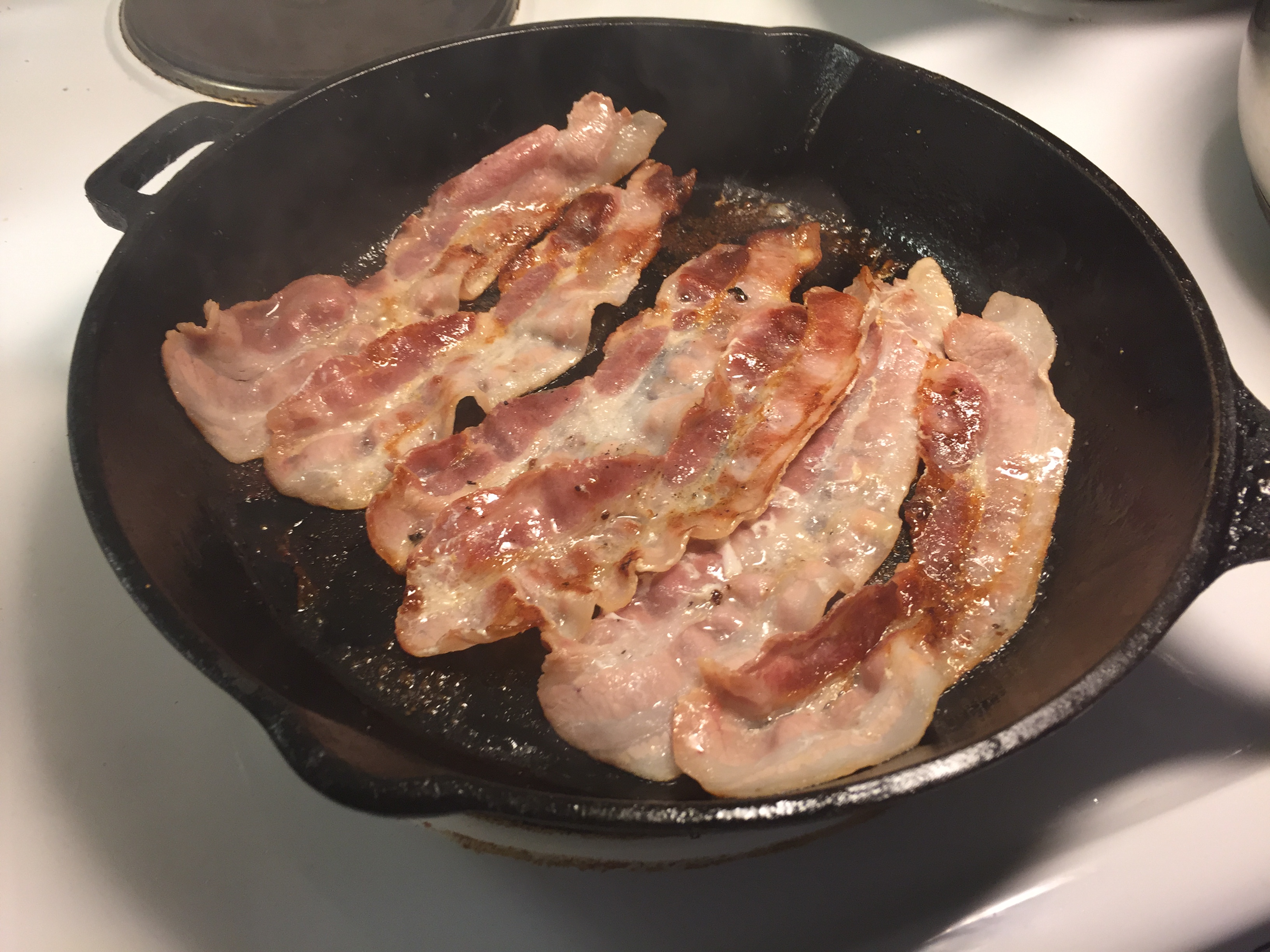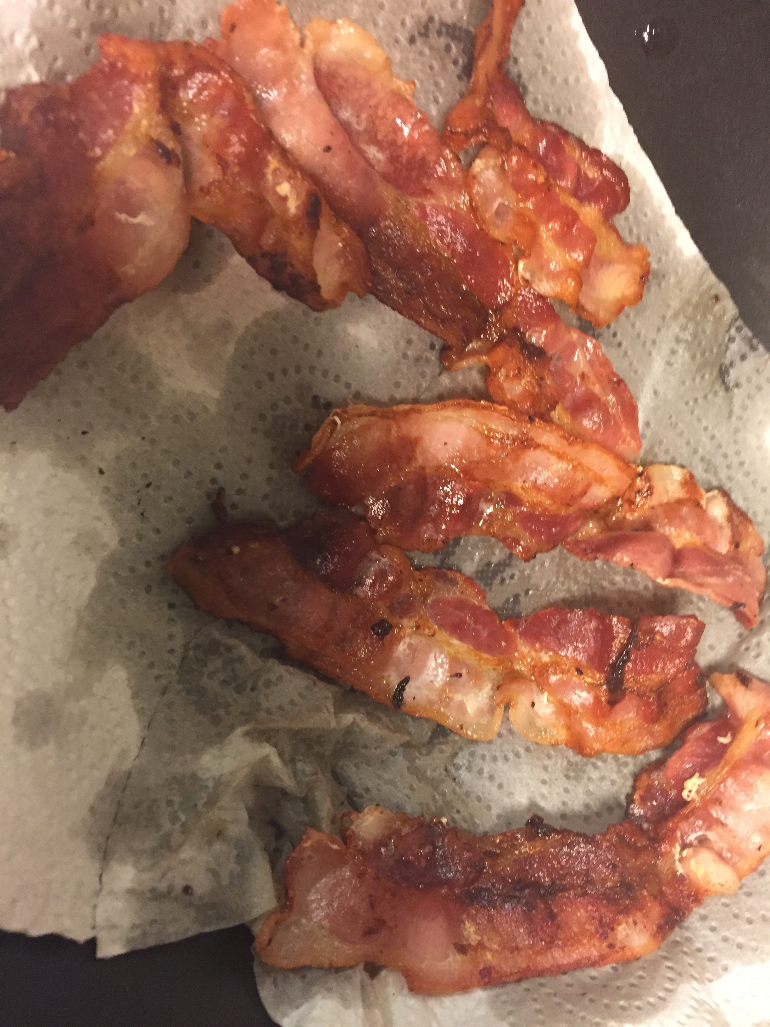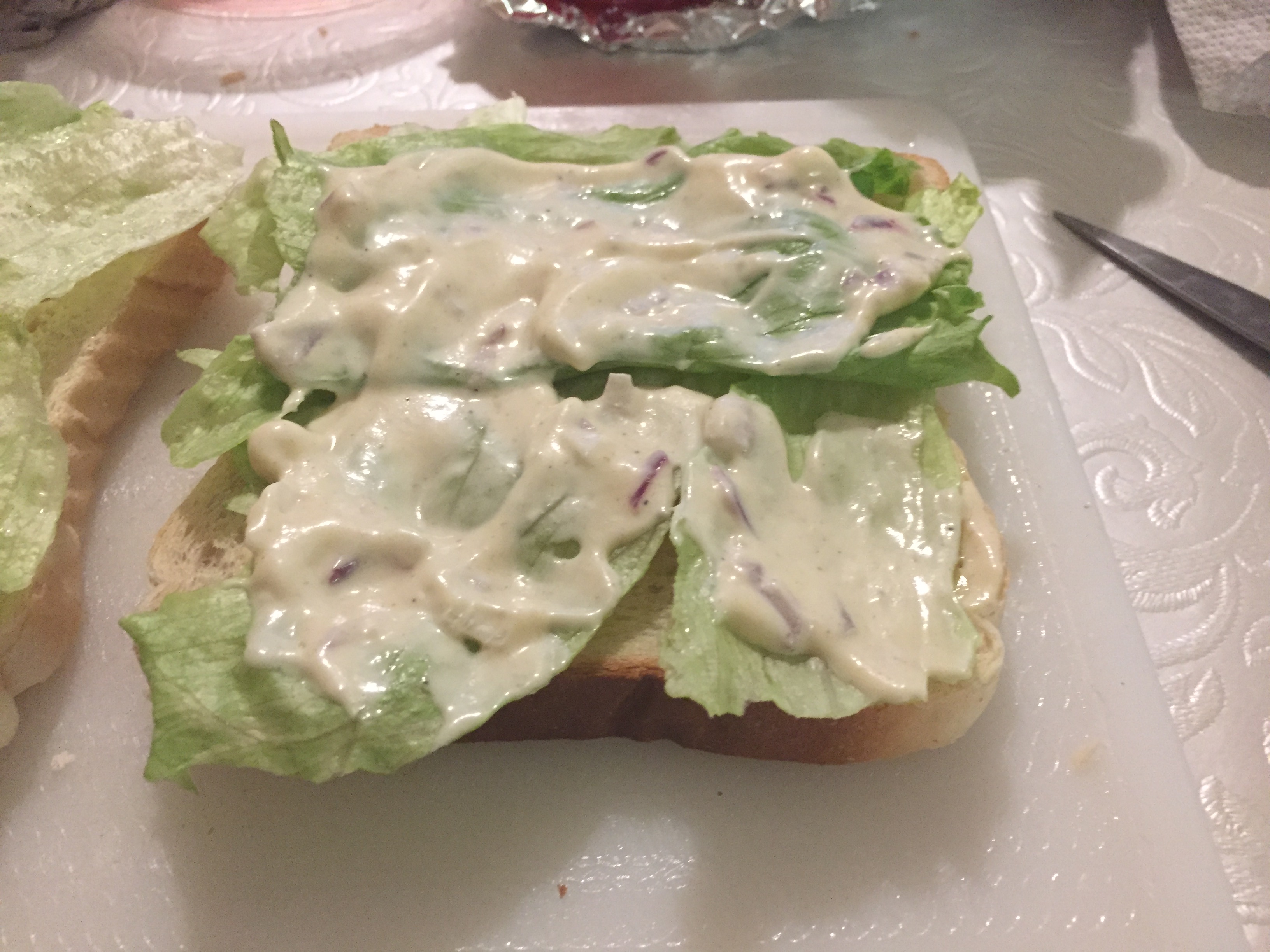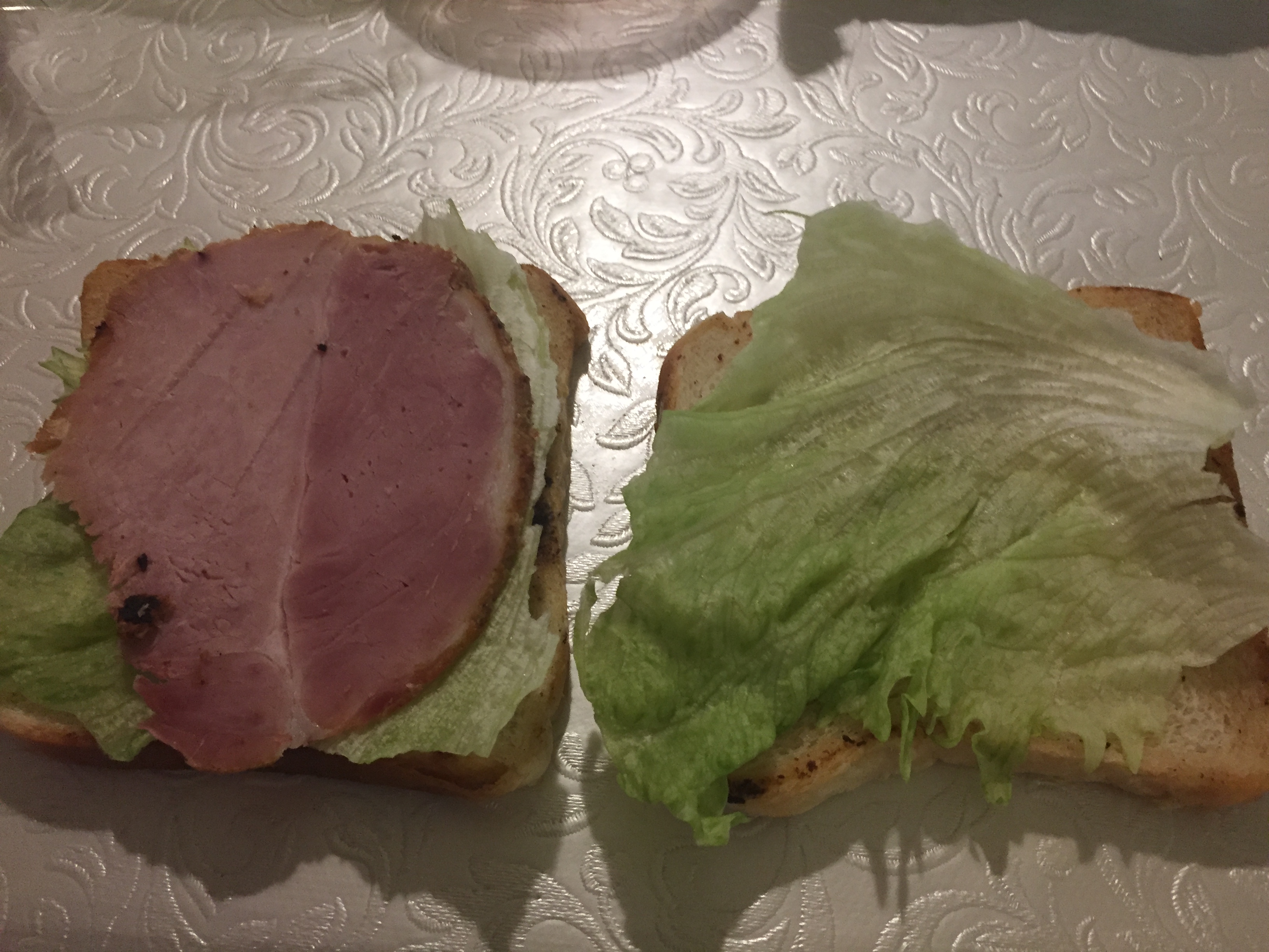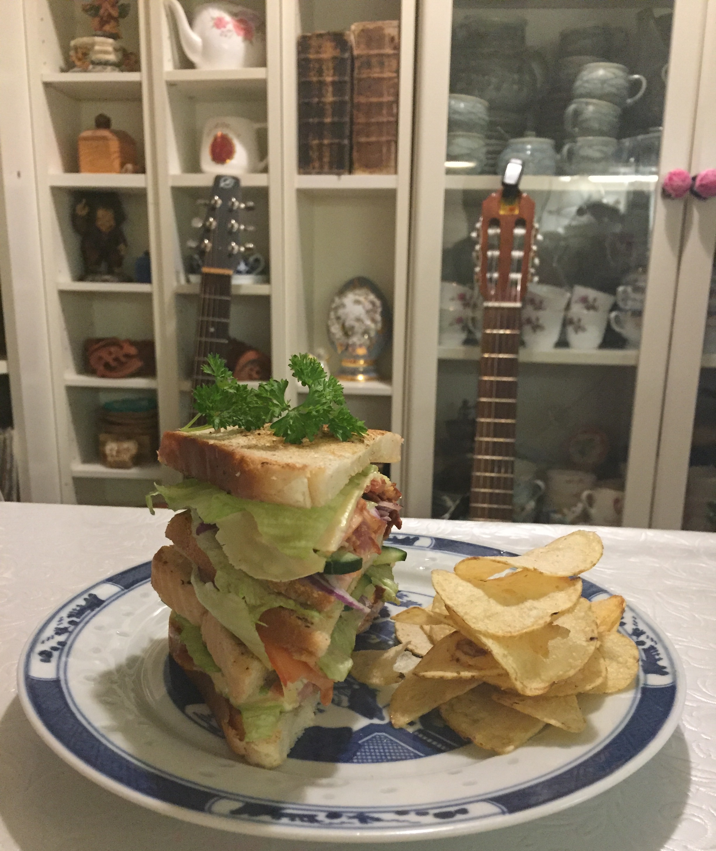 Sliced ham (or other meat). Lightly salt and pepper it. Toast the bread slices and edge cut if you like them to be the exakt same size. I didn’t do that. Fry the bacon slices. Slice the tomato. Peel and slice the red onion thinly. Slice cucumber. Mix mayonnaise, youghurt, mustard, sweet and sour sauce or hot sauce. Add salt and pepper to your taste. Spread butter on two of the breadslices. Place salad on the bread slices. Spread mayonnaisemix on top of the saladleaves. Wrap meat, bacon, cheese, tomato, cucumber and red onion. Place the bread slices on top of each other with the topping. Top with the a slice of bread. Stick a wooden skewer through all the layers to keep everything in place. Garnish with parsley. Serve with some potato chips or french fries if you like.