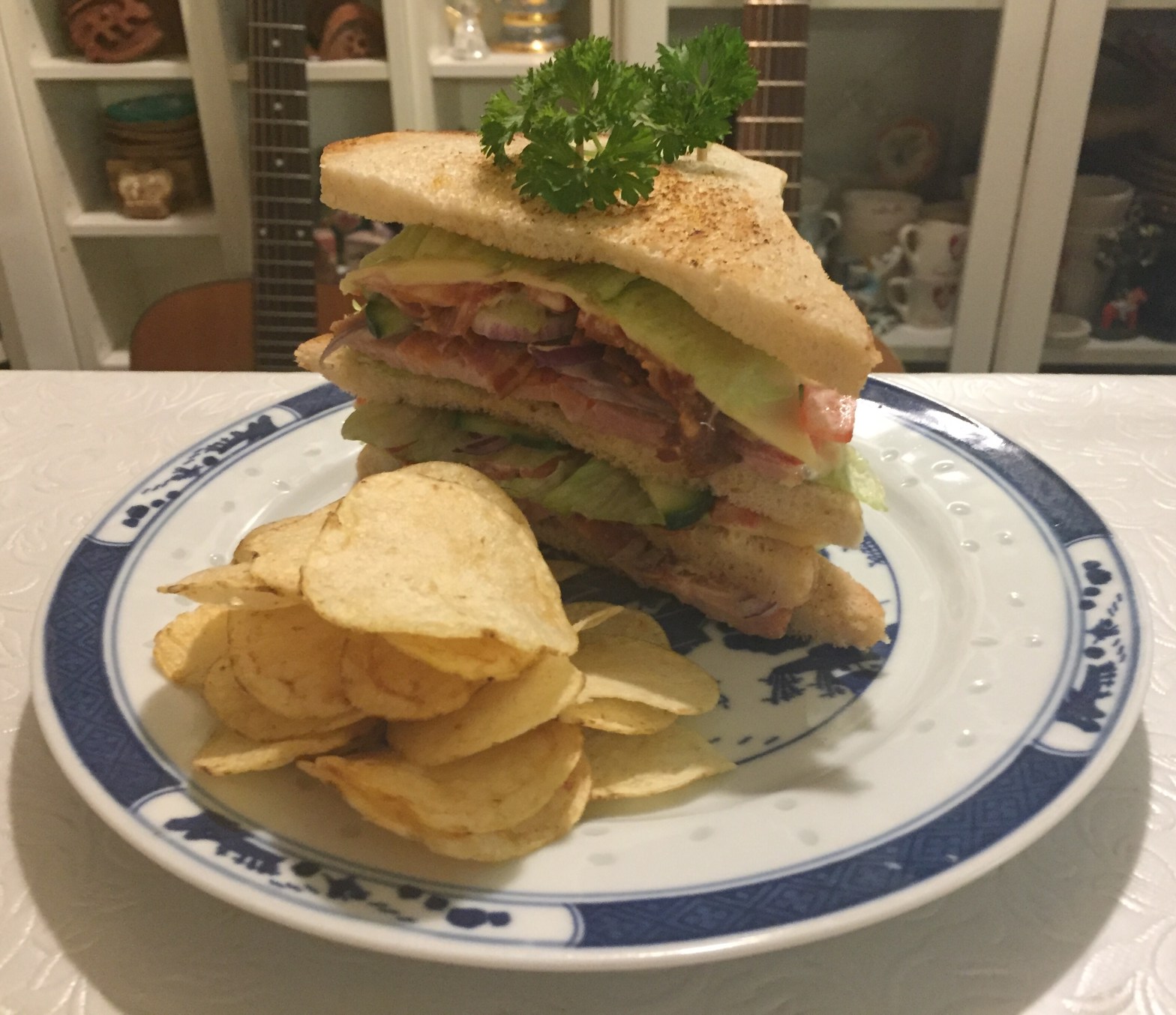 Sliced ham (or other meat). Lightly salt and pepper it. Toast the bread slices and edge cut if you like them to be the exakt same size. I didn’t do that. Fry the bacon slices. Slice the tomato. Peel and slice the red onion thinly. Slice cucumber. Mix mayonnaise, youghurt, mustard, sweet and sour sauce or hot sauce. Add salt and pepper to your taste. Spread butter on two of the breadslices. Place salad on the bread slices. Spread mayonnaisemix on top of the saladleaves. Wrap meat, bacon, cheese, tomato, cucumber and red onion. Place the bread slices on top of each other with the topping. Top with the a slice of bread. Stick a wooden skewer through all the layers to keep everything in place. Garnish with parsley. Serve with some potato chips or french fries if you like.