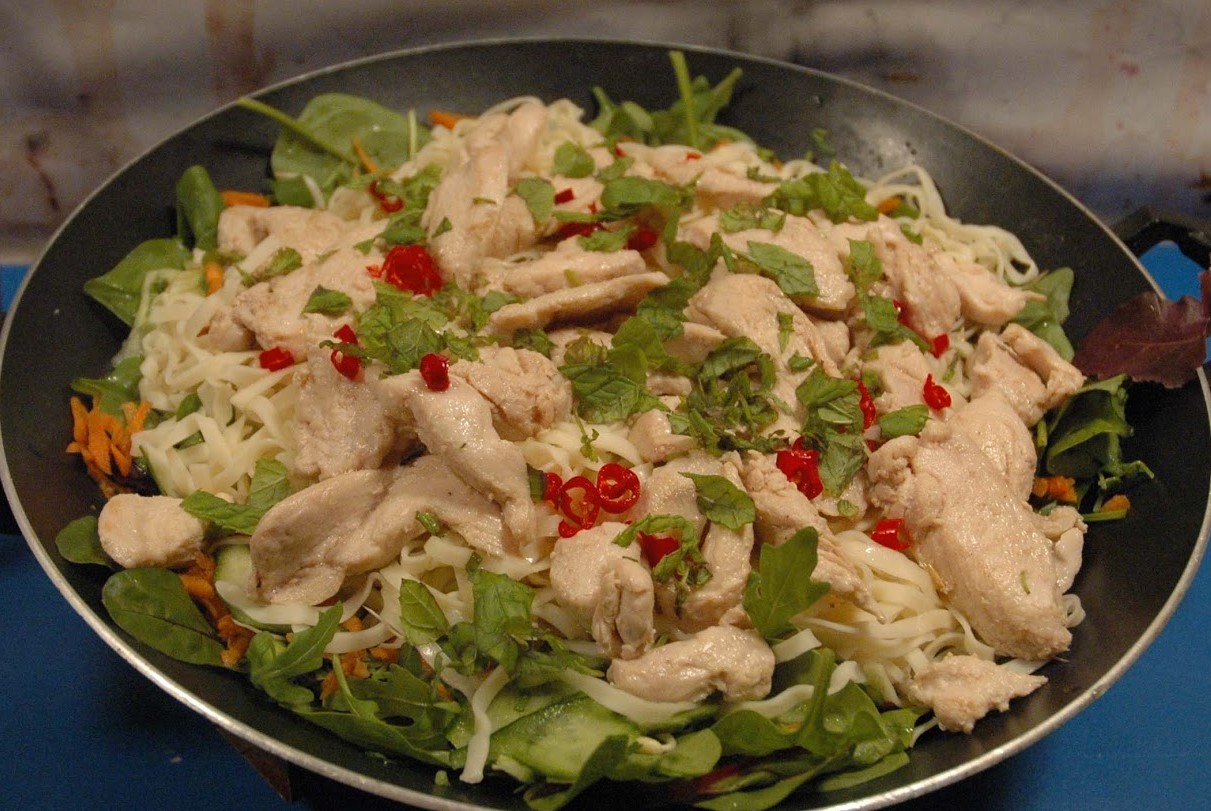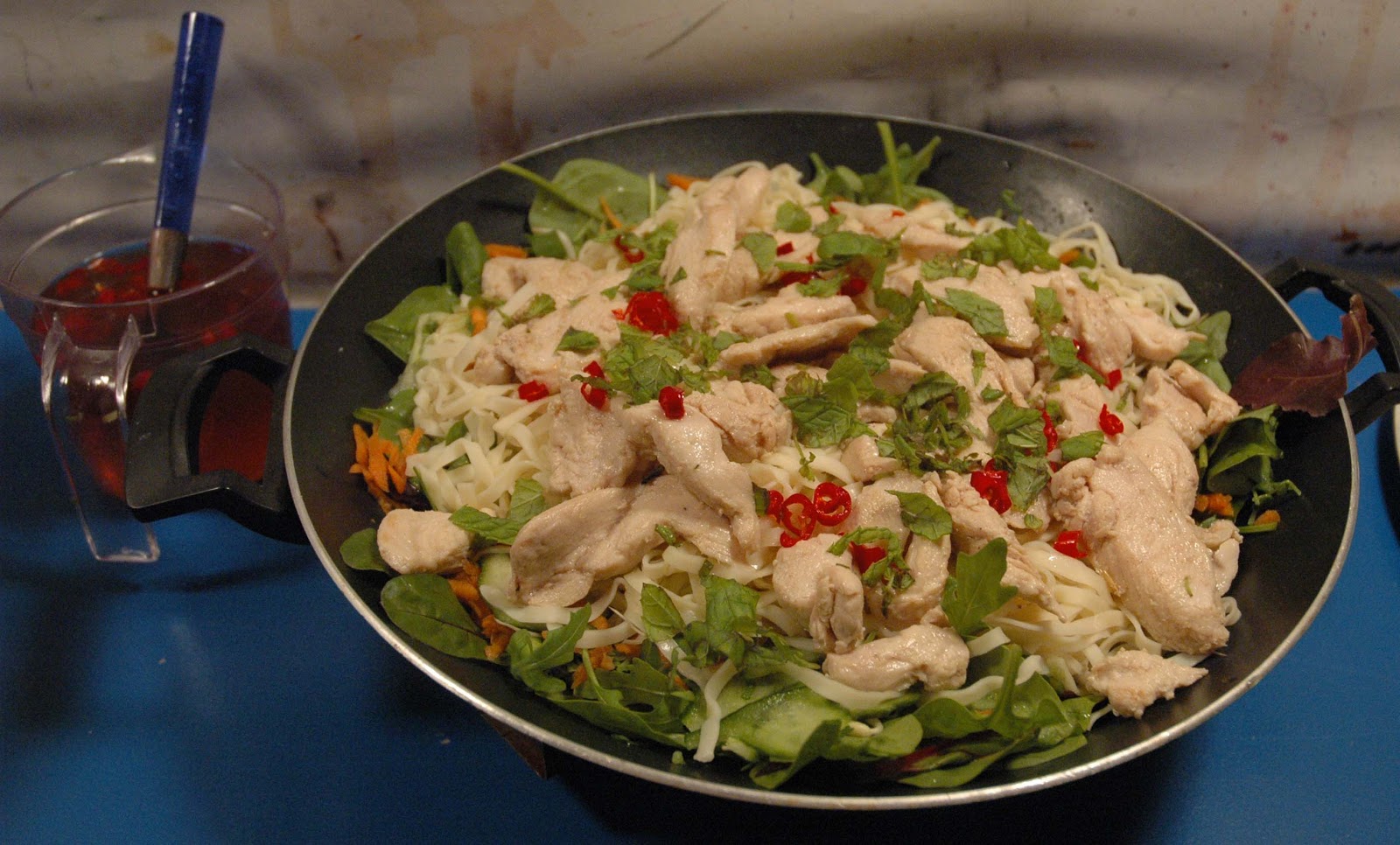 4 shredded chicken fillets Marinade for the chicken: 3 garlic cloves 2 lemongrass (only the white part) 1 tablespoon fish sauce 1 teaspoon brown sugar Noodle salad: 150 g egg noodles 1/2 cucumber in strips 2 green onions 1/2 red onion 1 pot fresh mint 1 pot fresh coriander 100 gr cashew nuts 250 gr mixed salad 150 g fresh bean sprouts 150 gr grated carrots Nuoc cham sauce: 1 red chili (core and shred) 1 clove of garlic (pressed) 5 tablespoons powdered sugar 1/2 dl boiling water 1/2 dl fish sauce 1 dl freshly squeezed lime juice (approx. 3 lime) Instructions: Mix all the ingredients for the sauce and let it stand for 30 minutes. Mix the marinade into chicken and mix with the chicken. Let it draw! Boil noodles according to the packaging. Divide the cucumber lengthwise. Slice the green onion and the red onion thinly. Roughly chop the mint and coriander. Finely chop the nuts. Heat some oil in a frying pan alt. wok and fry the chicken until done. Put lettuce and bean sprouts on the bottom in four deep bowls. Spread the noodles over and top with carrots, cucumber, red onion, chicken, peanuts, mint, cilantro and green onions. Top with roasted onions! Then drizzle over the sauce, and serve more of the sauce next to it!