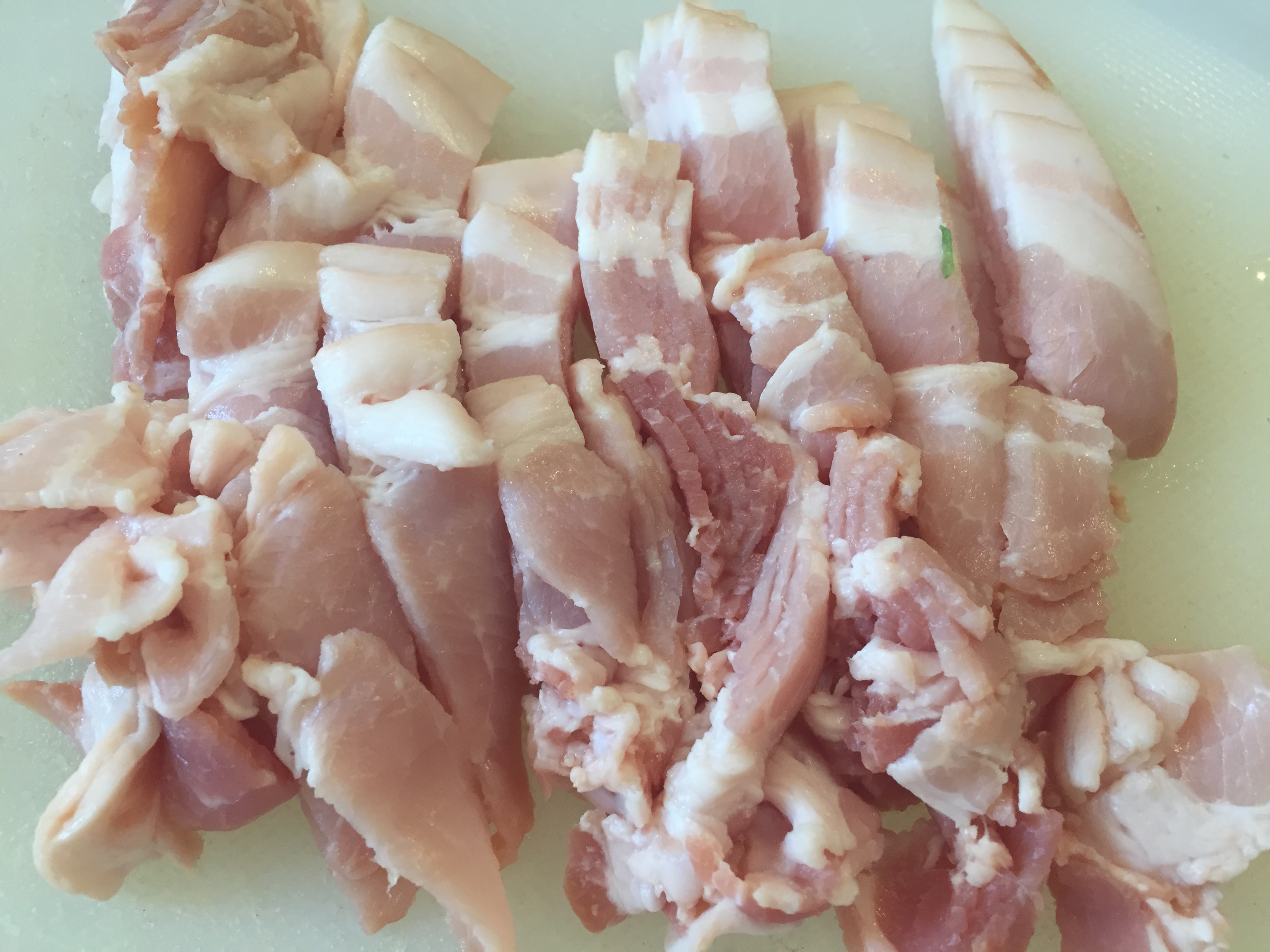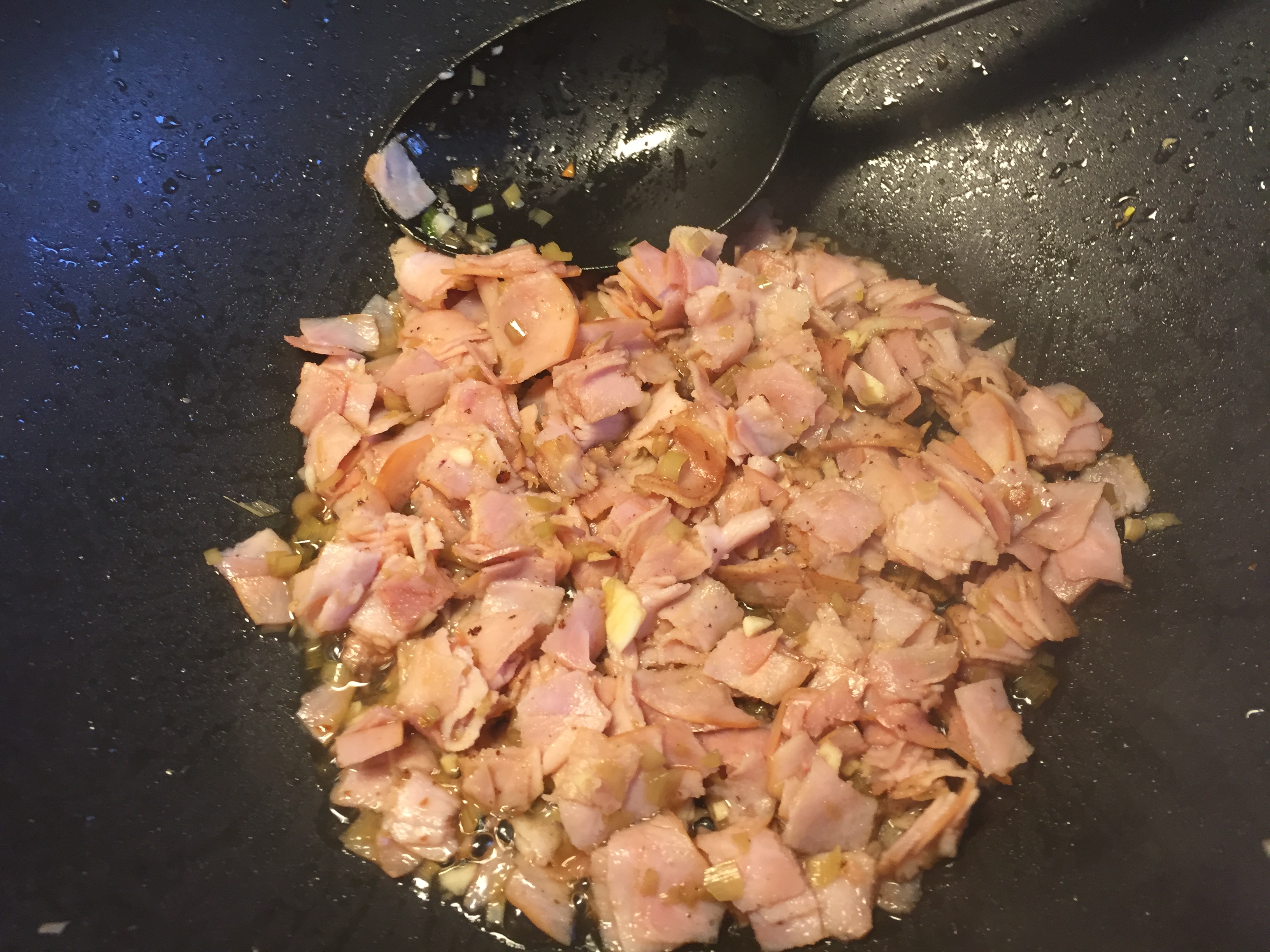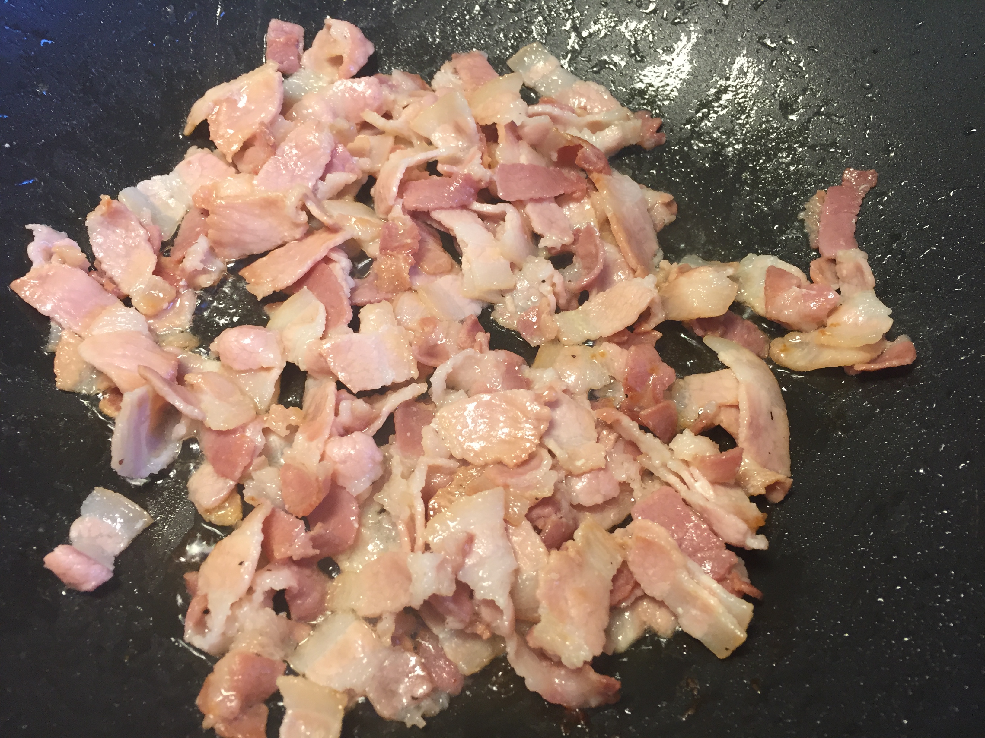 200 g chopped thin hamslices (Chicken or some other goes great as well). 1 package thinly sliced bacon, chopped.