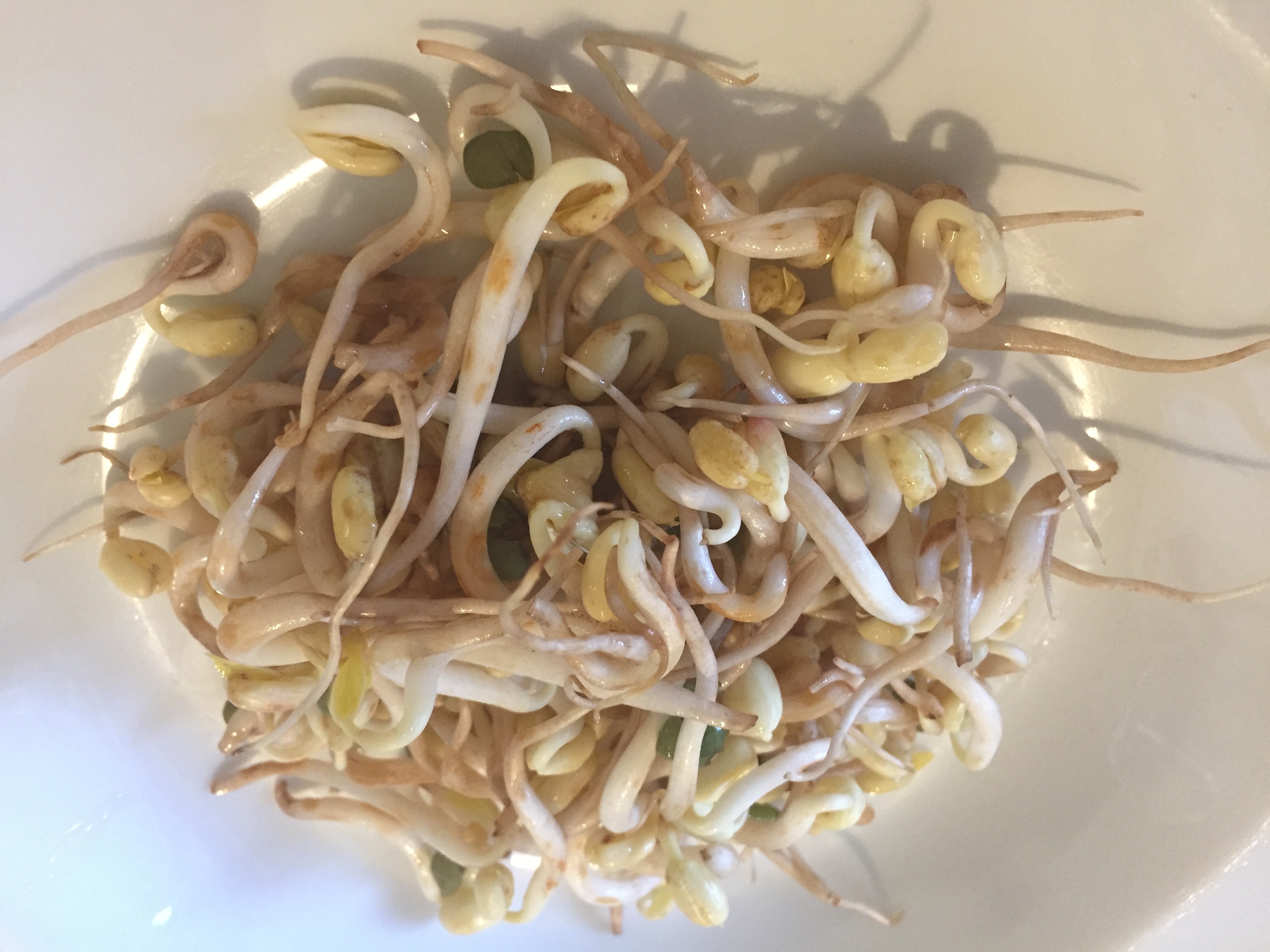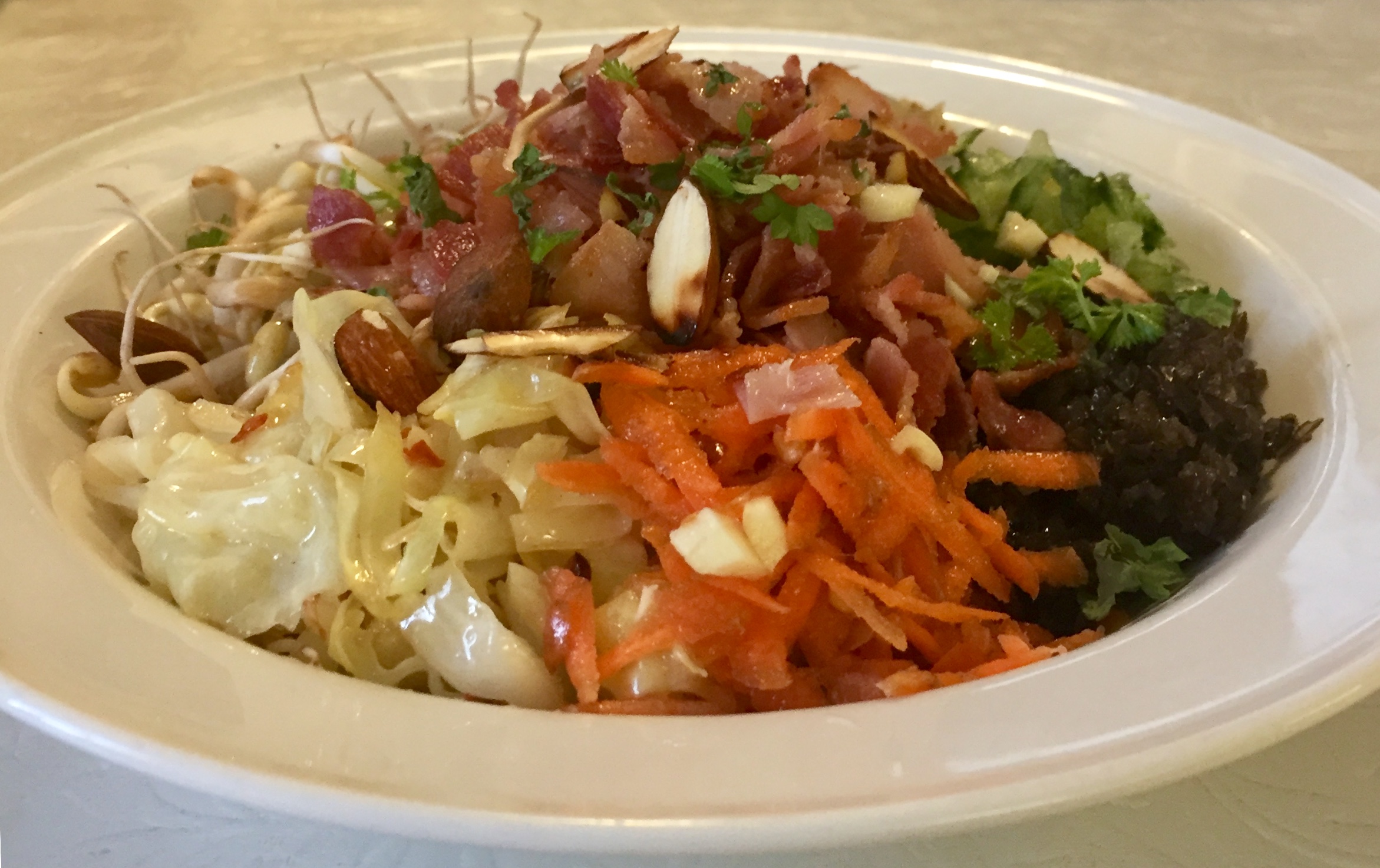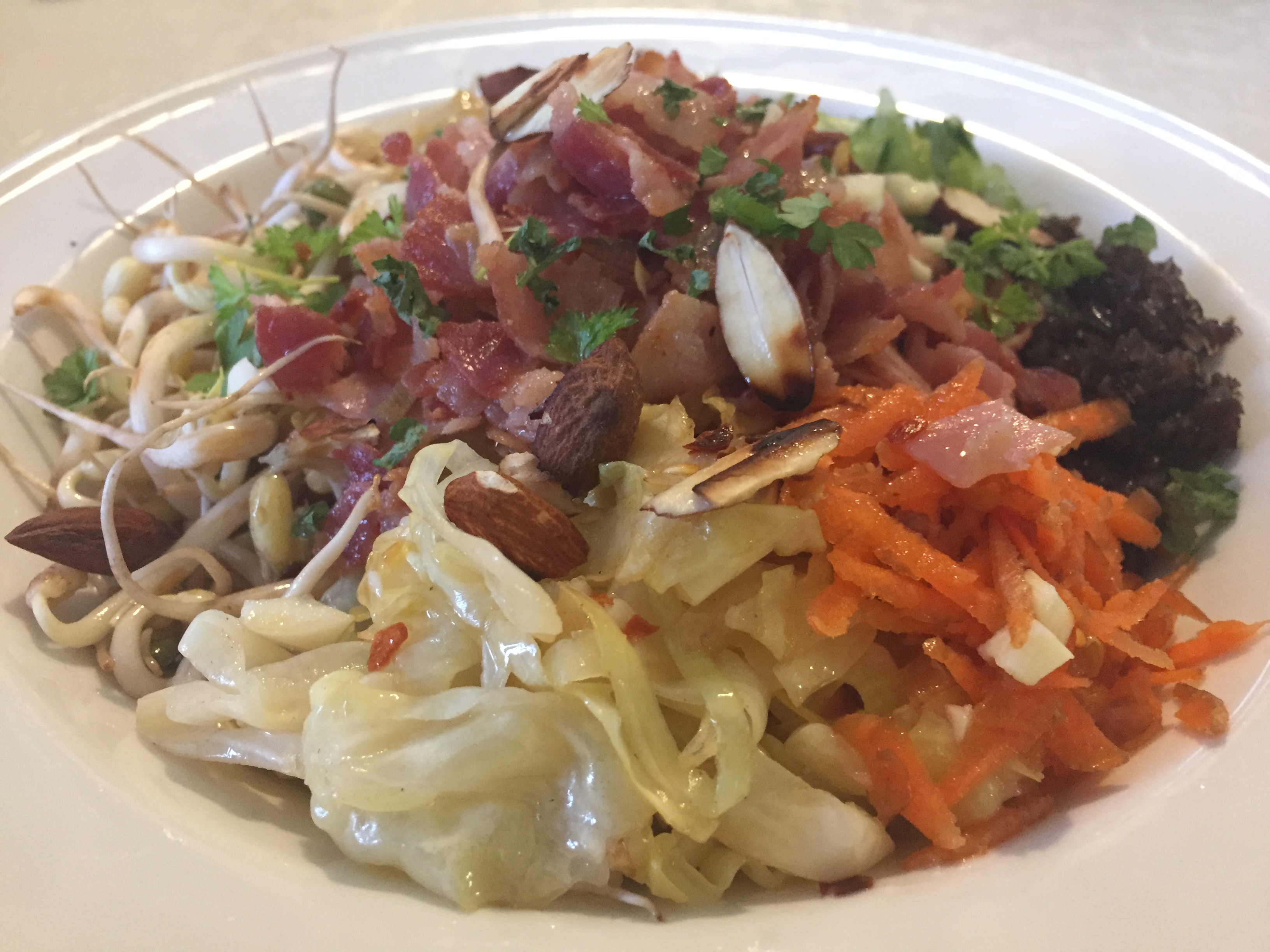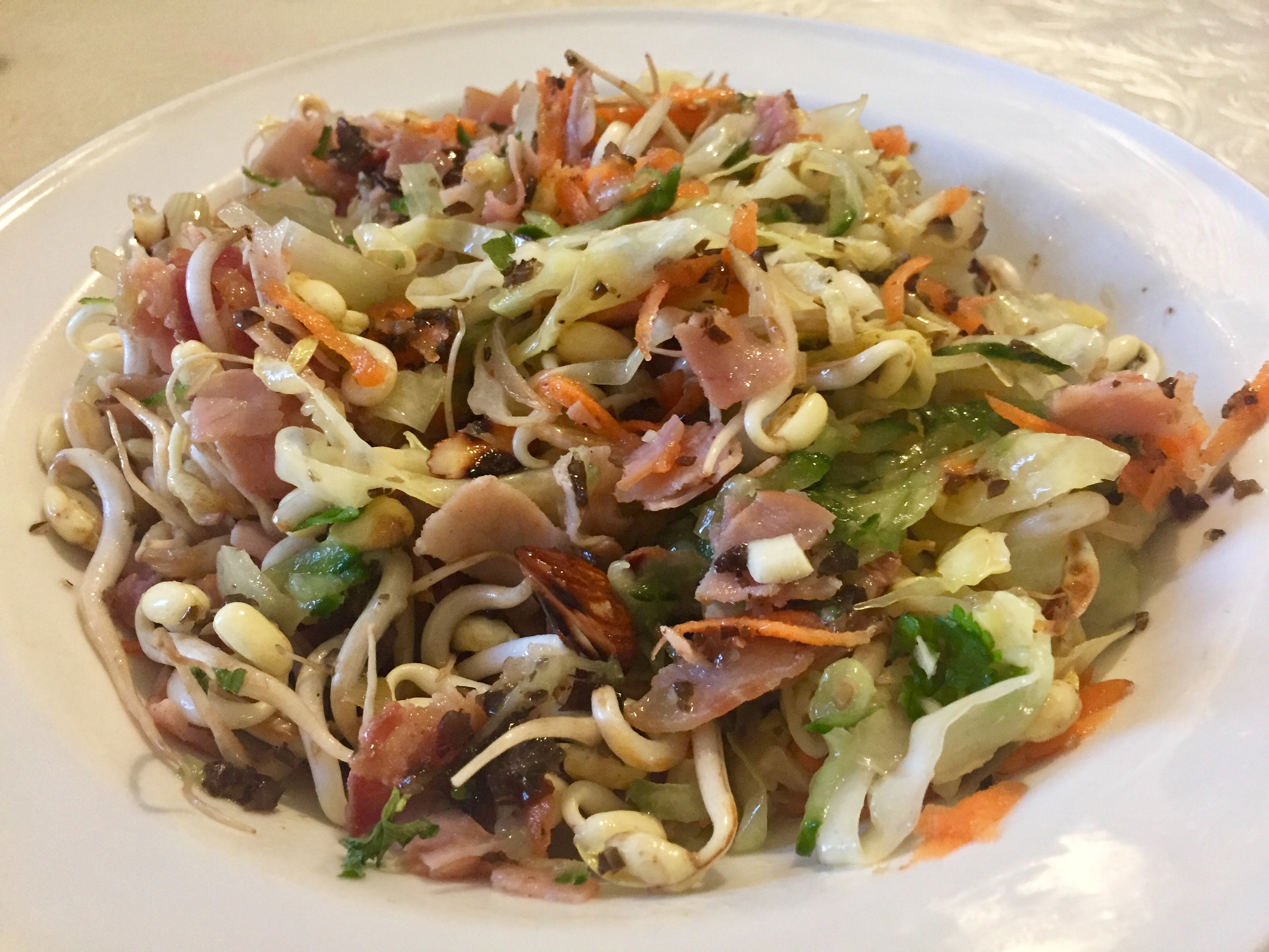 Place woked cabbage, fresh bean sprouts, fresh shredded carrots, fresh shredded cucumber, woked onions in a bowl. Top with marinated ham, crisp bacon and fresh beansprouts.