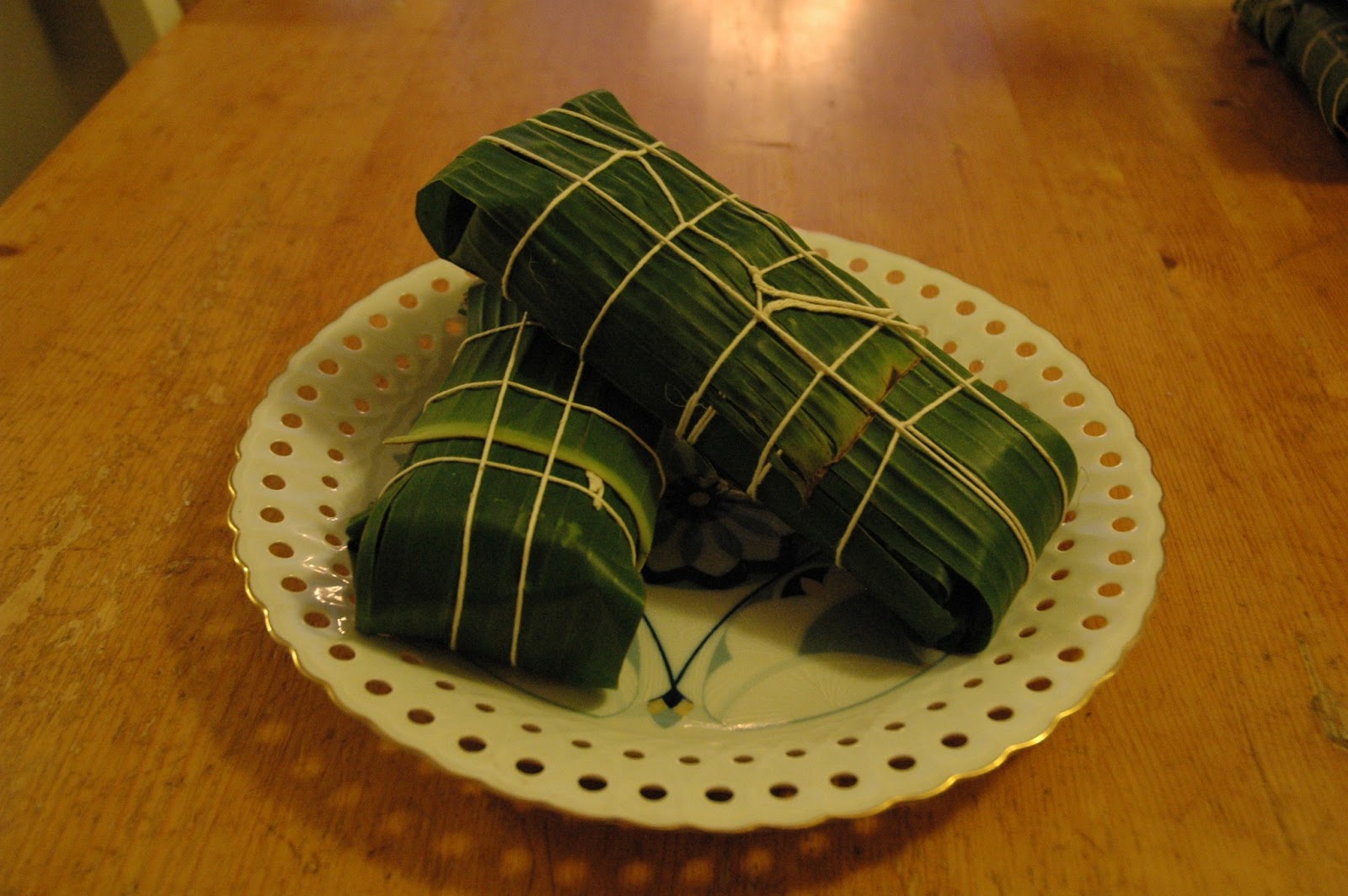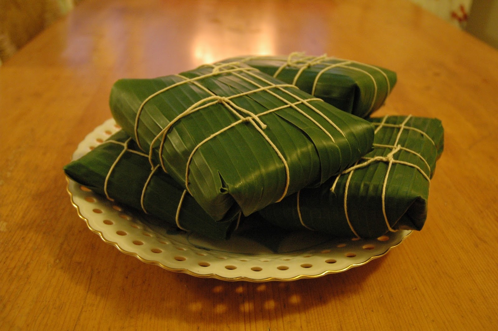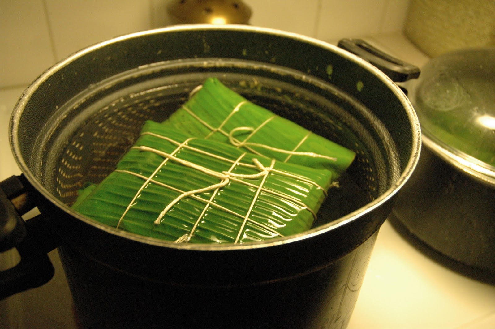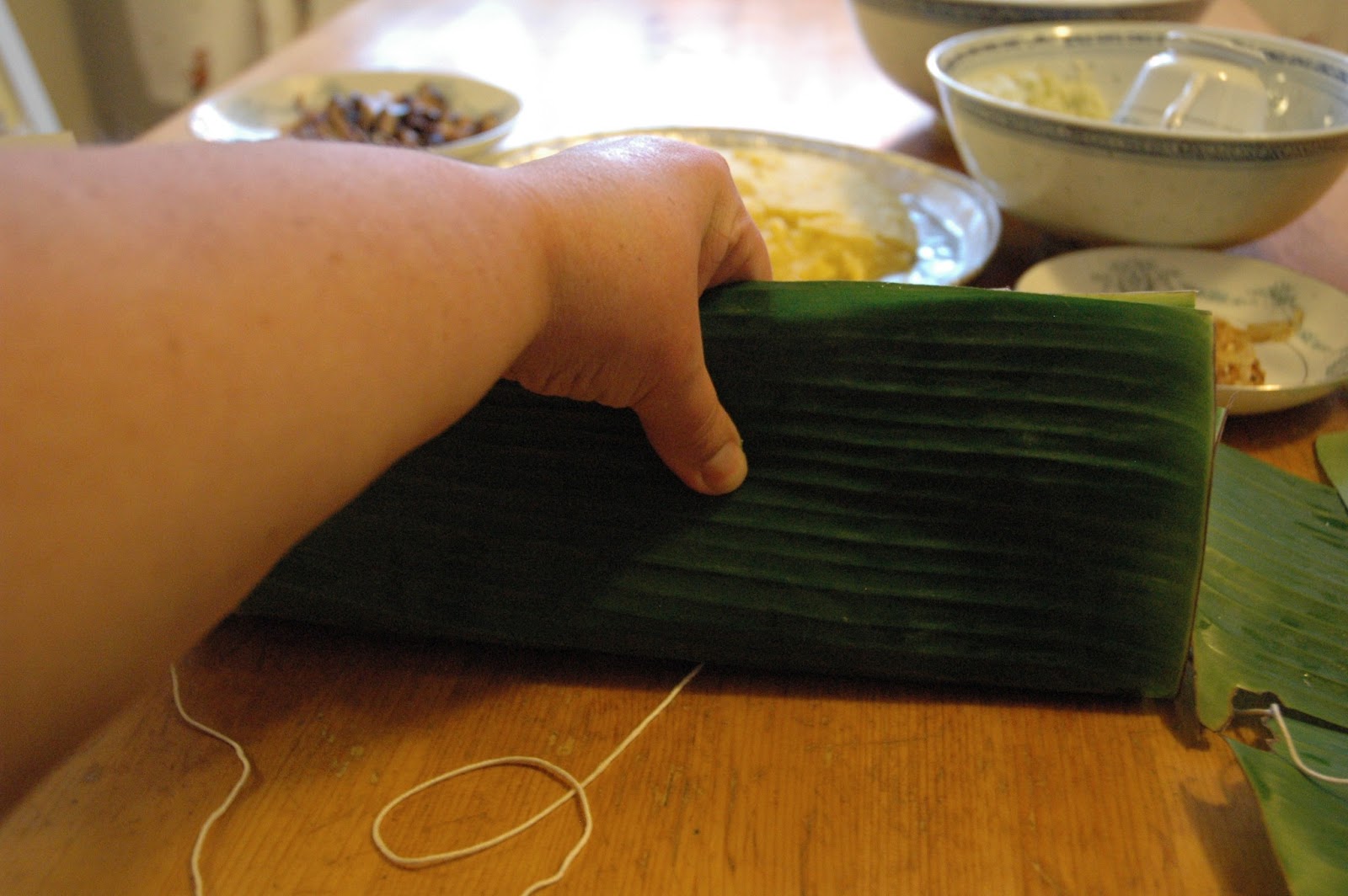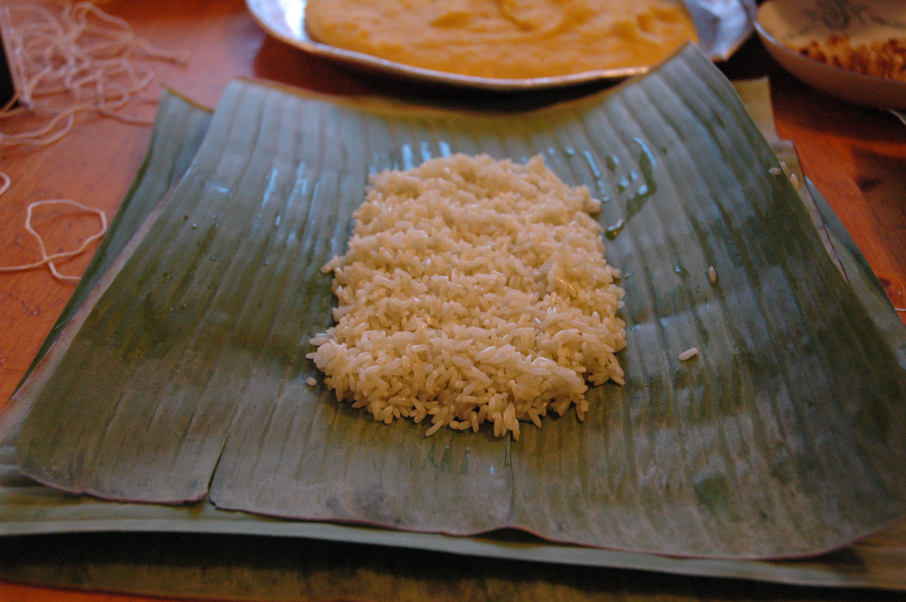 To assemble, lay out two sheets of partially overlapping banana leaves, place a third leaf on top (perpendicular to the first two sheets), and a fourth leaf on top of that (perpendicular to the third sheet). (If using a mold, place it on your work surface first, then line it with the banana leaves in this manner.) Place about a cup of rice in the center of the leaves and spread out to cover a 6-inch square area (about 9 cm), (or to fill the mold). Take about a cup of mung beans and, using your hands, pat it into a slightly smaller square and place it on top of the rice. Then take another cup or so of rice and pack it over the top and sides. Starting with the innermost banana leaf, fold the leaves in one at a time, forming a square. Wrap it tightly like a present so that the contents don’t shift or spill during cooking, and tie tightly with twine.
