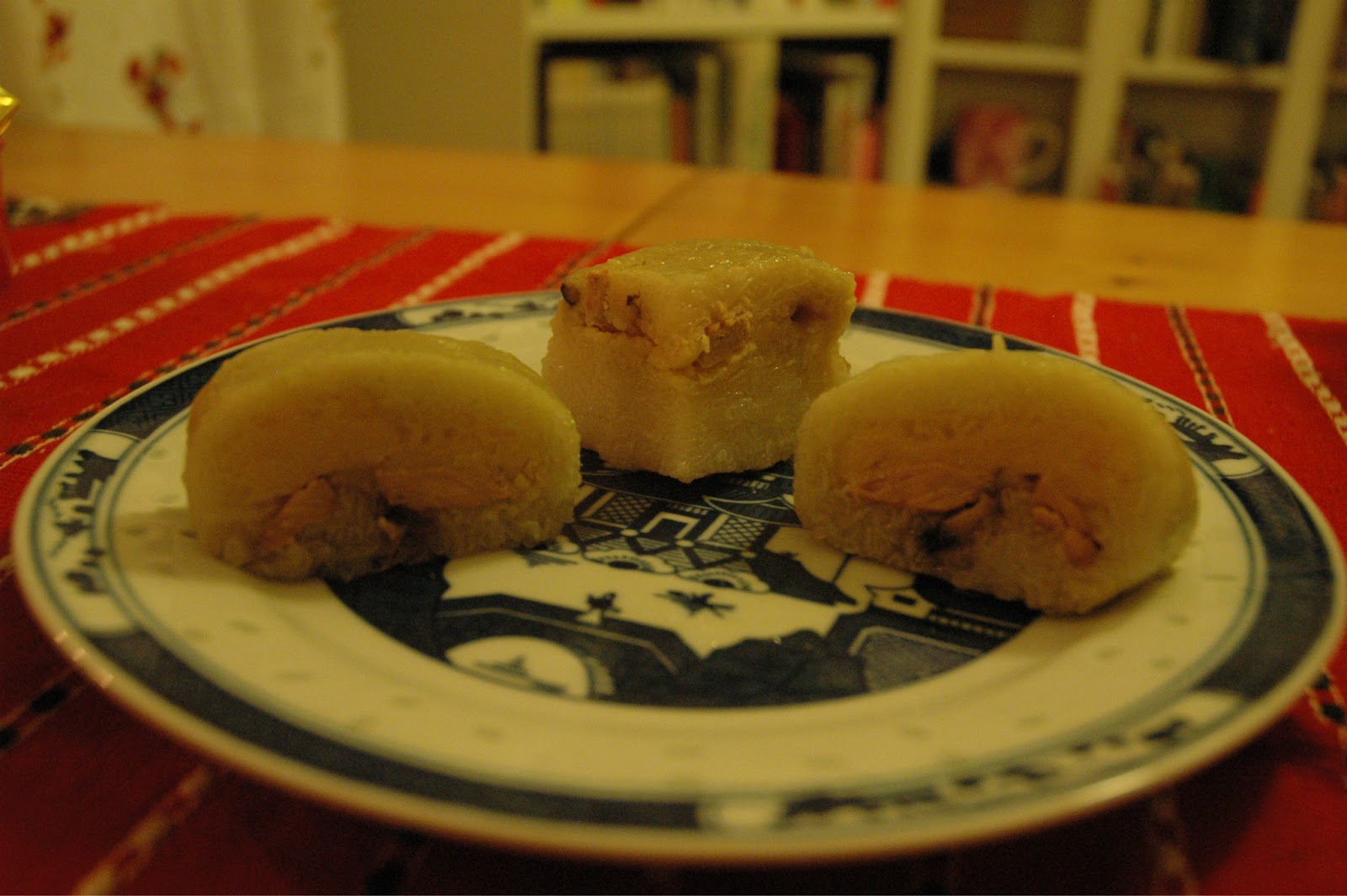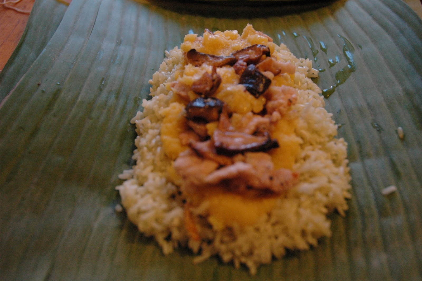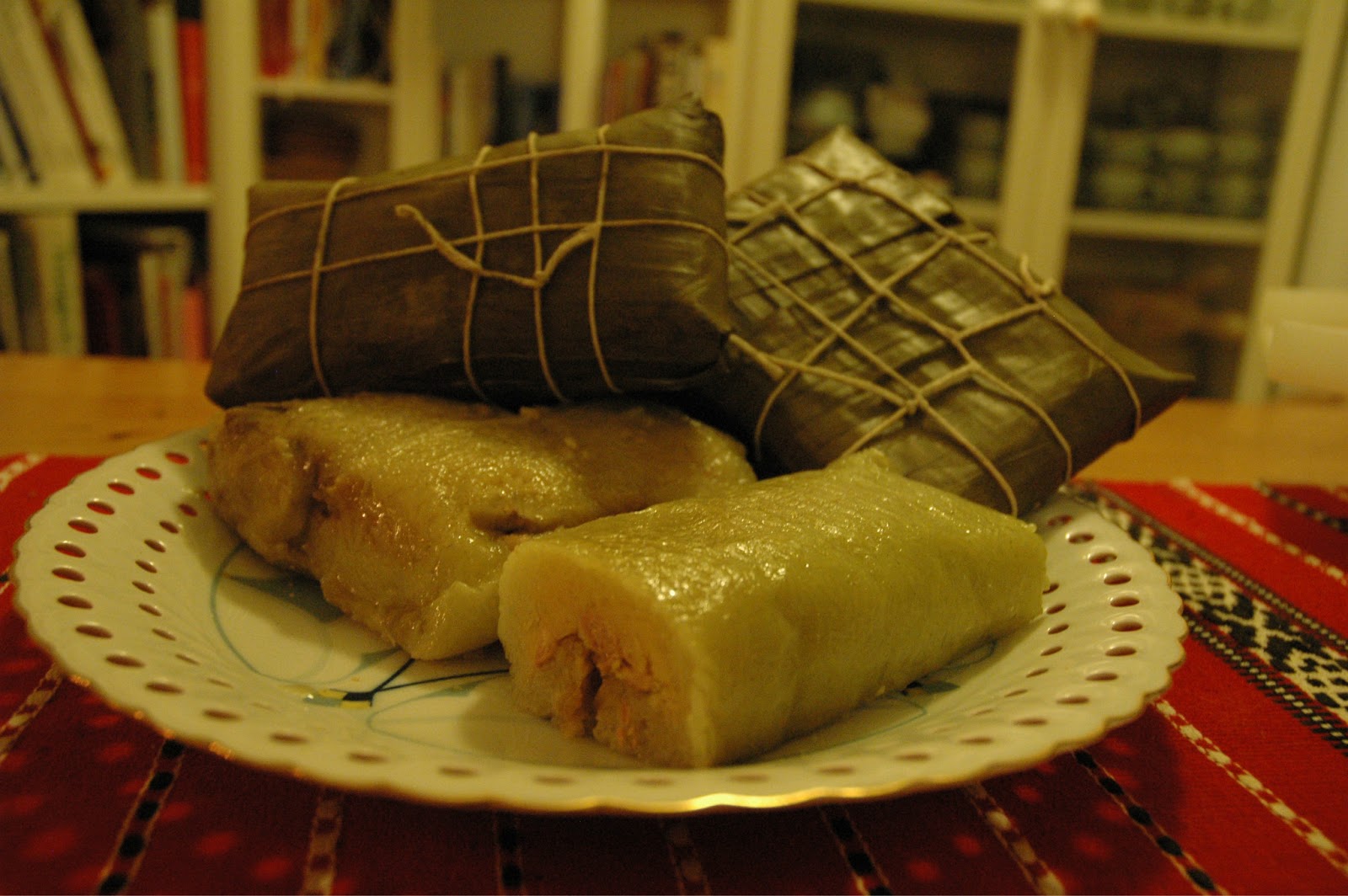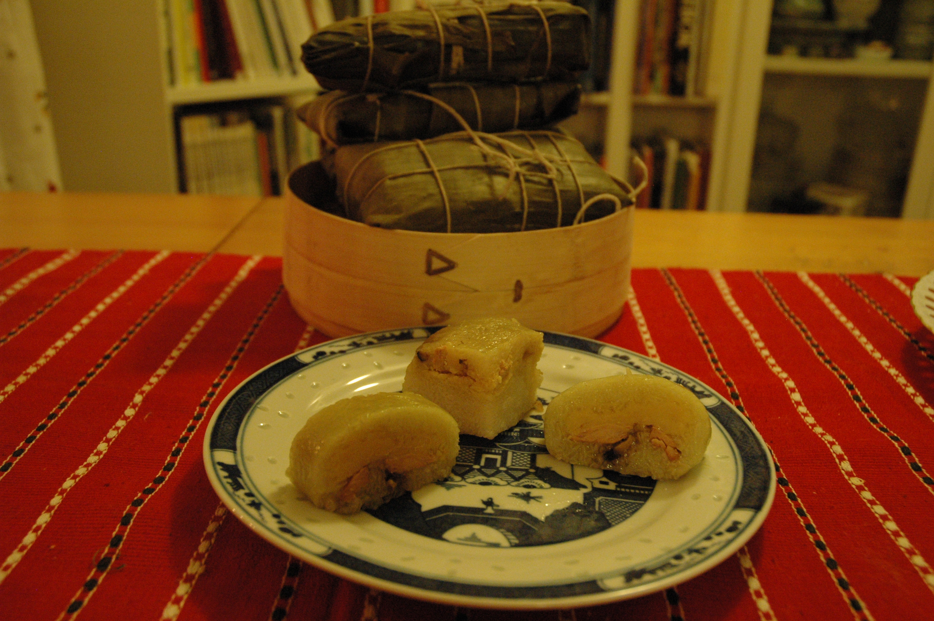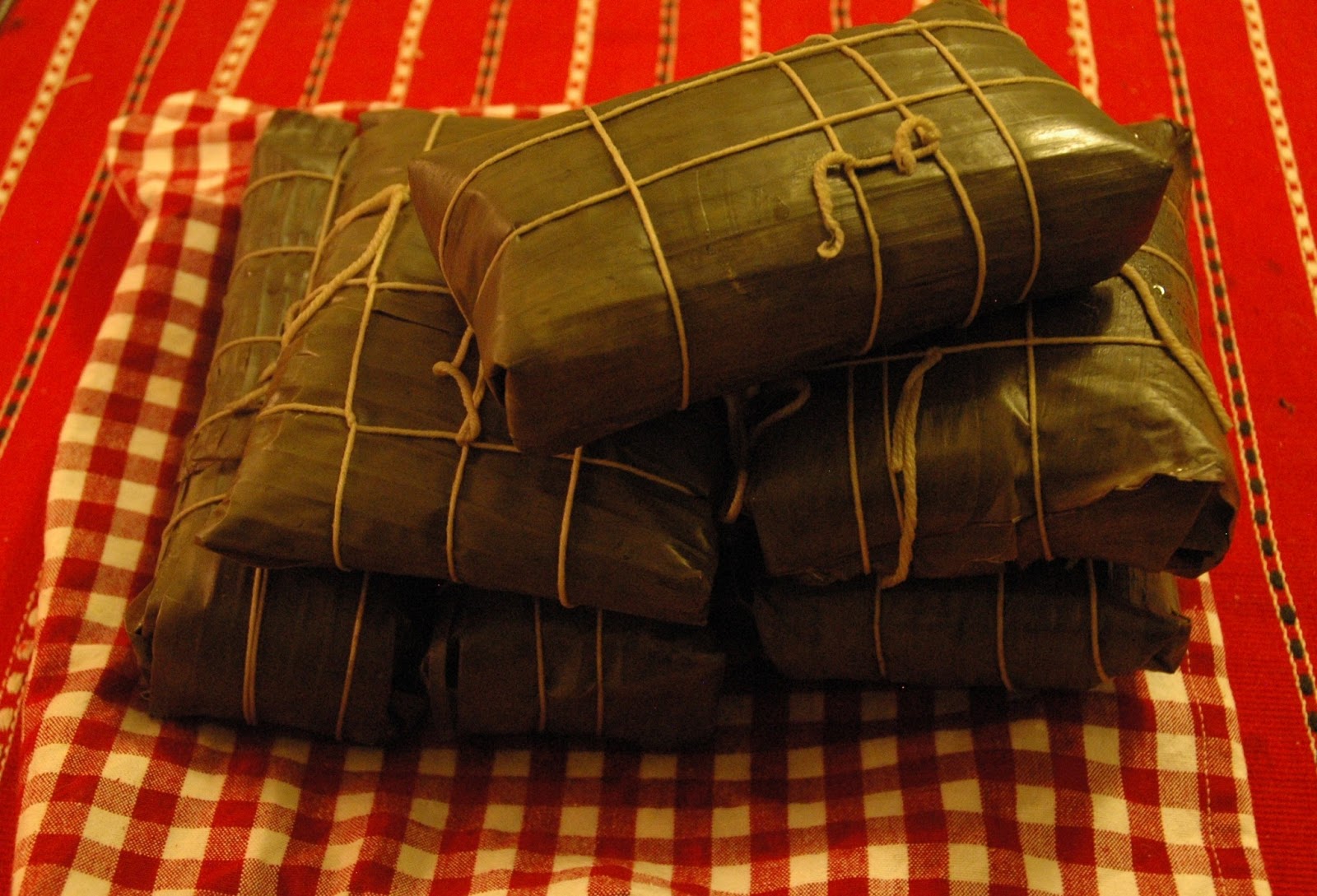 To assemble, lay out two sheets of partially overlapping banana leaves, place a third leaf on top (perpendicular to the first two sheets), and a fourth leaf on top of that (perpendicular to the third sheet). (If using a mold, place it on your work surface first, then line it with the banana leaves in this manner.) Place about a cup of rice in the center of the leaves and spread out to cover a 6-inch square area (about 9 cm), (or to fill the mold). Take about a cup of mung beans and, using your hands, pat it into a slightly smaller square and place it on top of the rice. Then take another cup or so of rice and pack it over the top and sides. Starting with the innermost banana leaf, fold the leaves in one at a time, forming a square. Wrap it tightly like a present so that the contents don’t shift or spill during cooking, and tie tightly with twine.