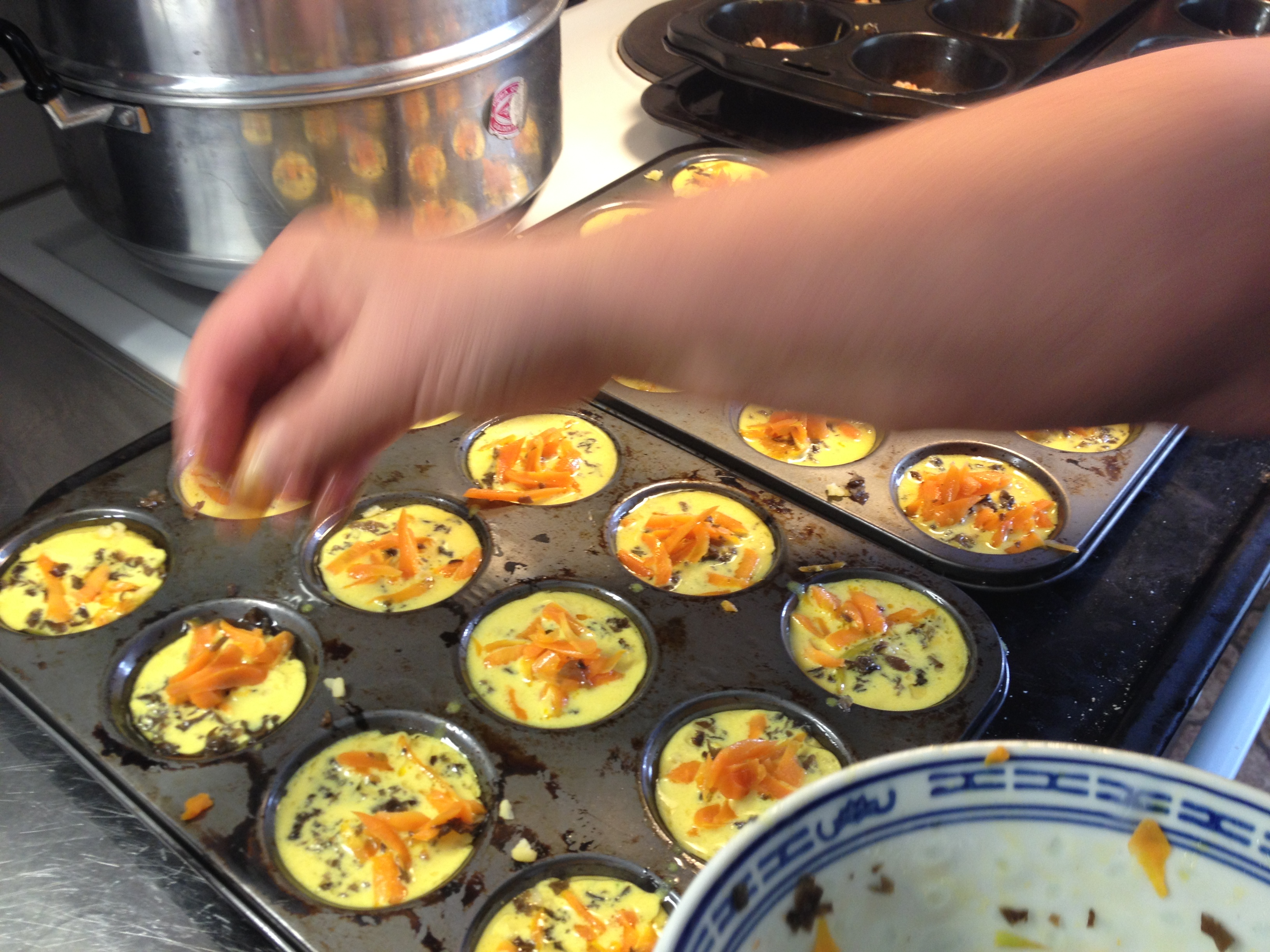 Remove the cover and add the toppings to each piece, then re-cover (or for me with using the cupcake pans I put them back inside the oven after adding the toppings.